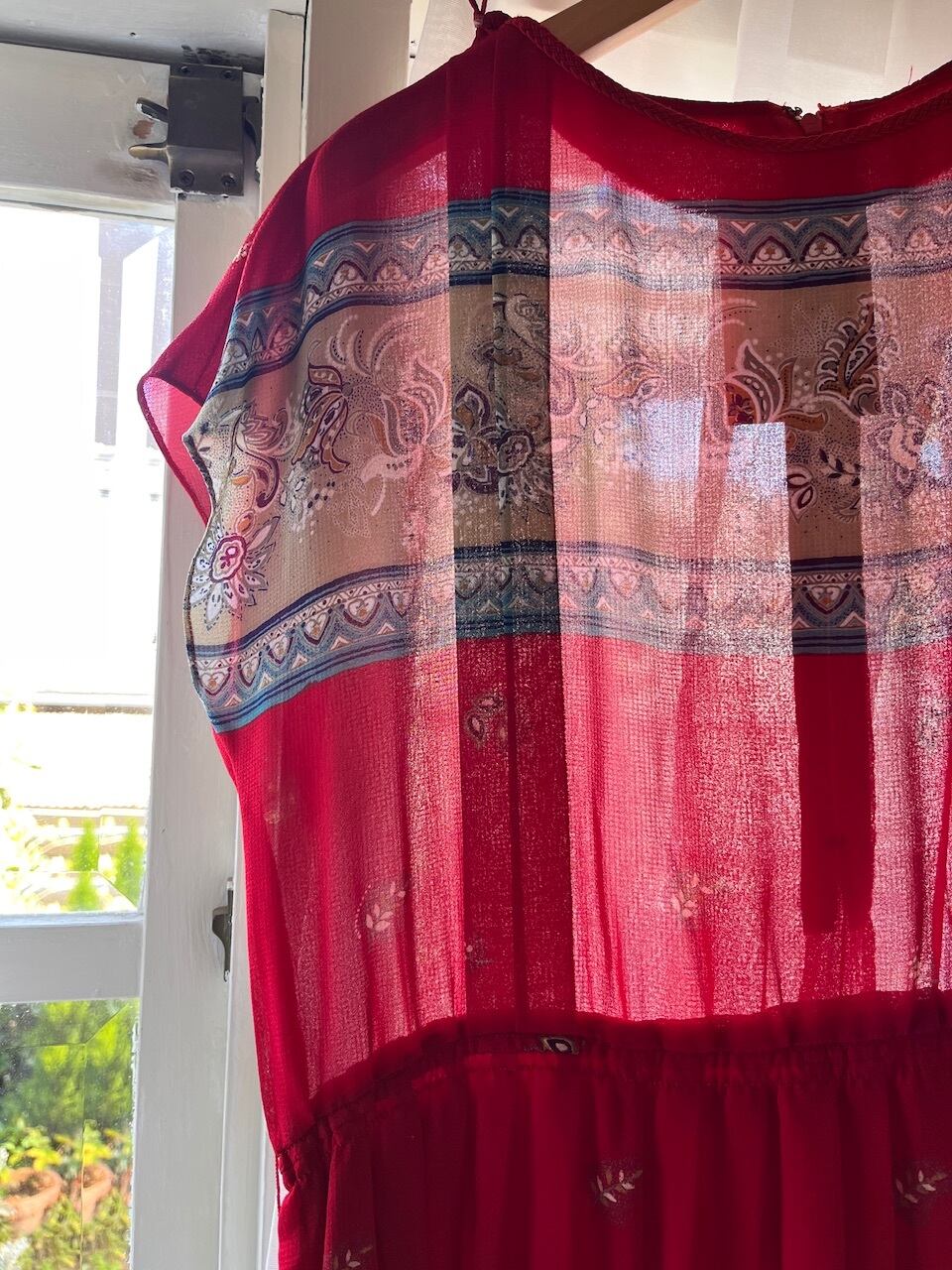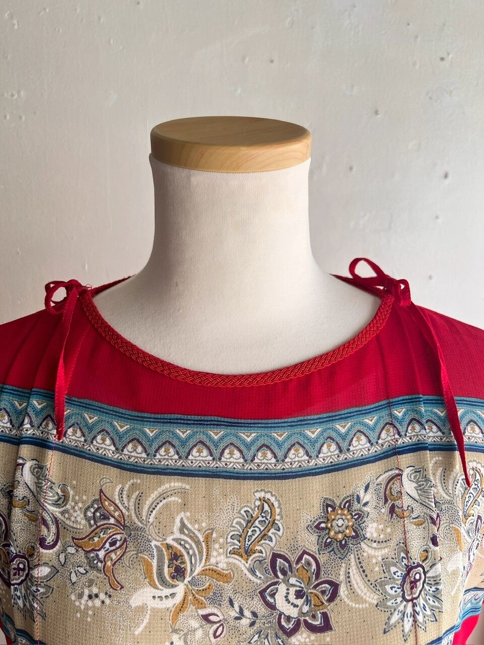オリエンタルな色遣いの美しい花模様としっかりとした赤のコントラストが素敵なワンピース。