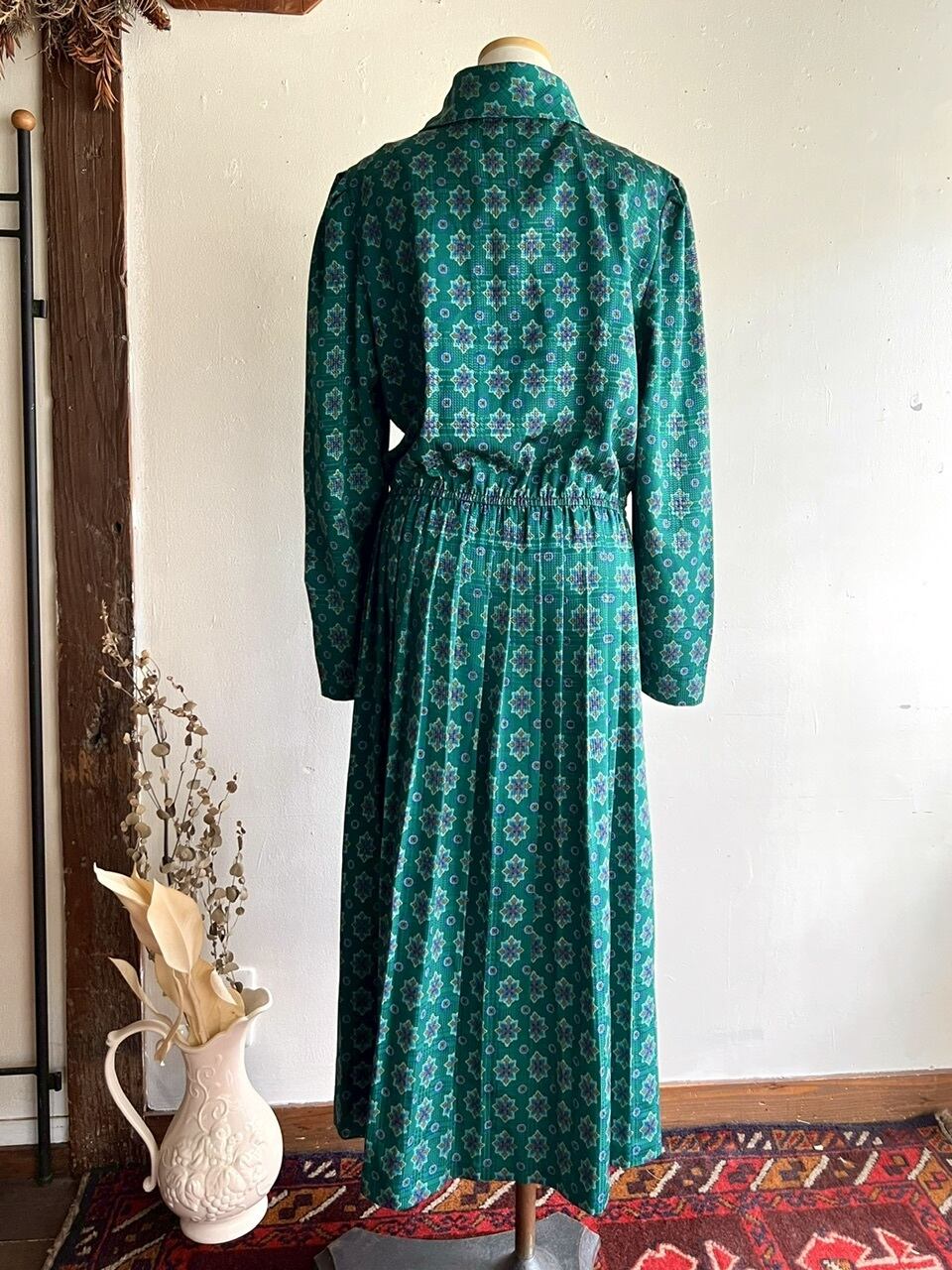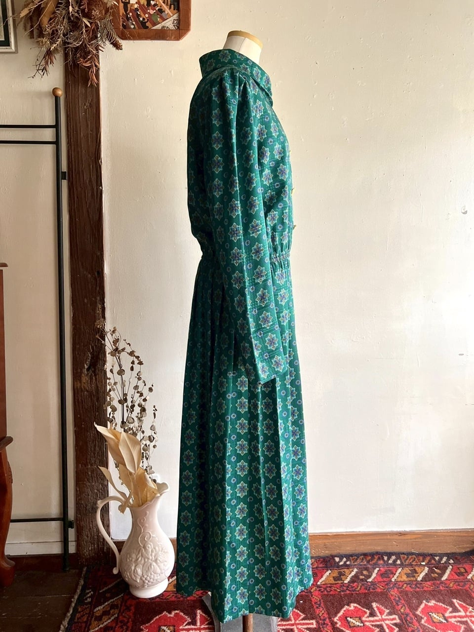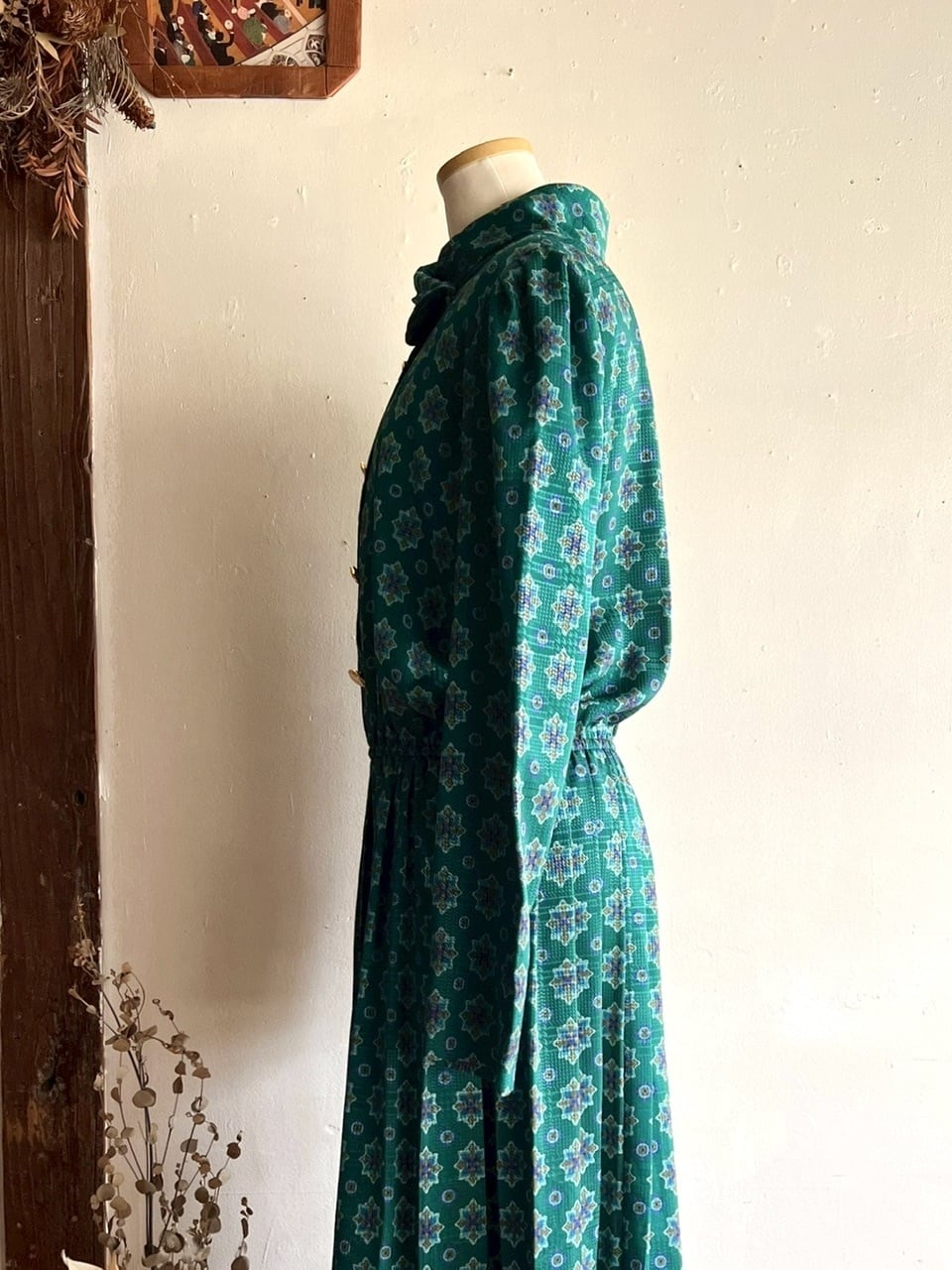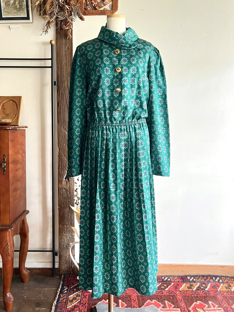 落ち着いたグリーンとゴールドカラーの装飾ボタン、ライトブラウンとパープルの十字架のようなレトロな柄がとっても可愛いワンピース。