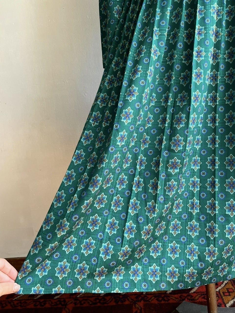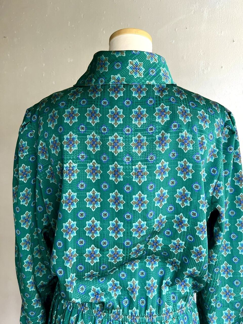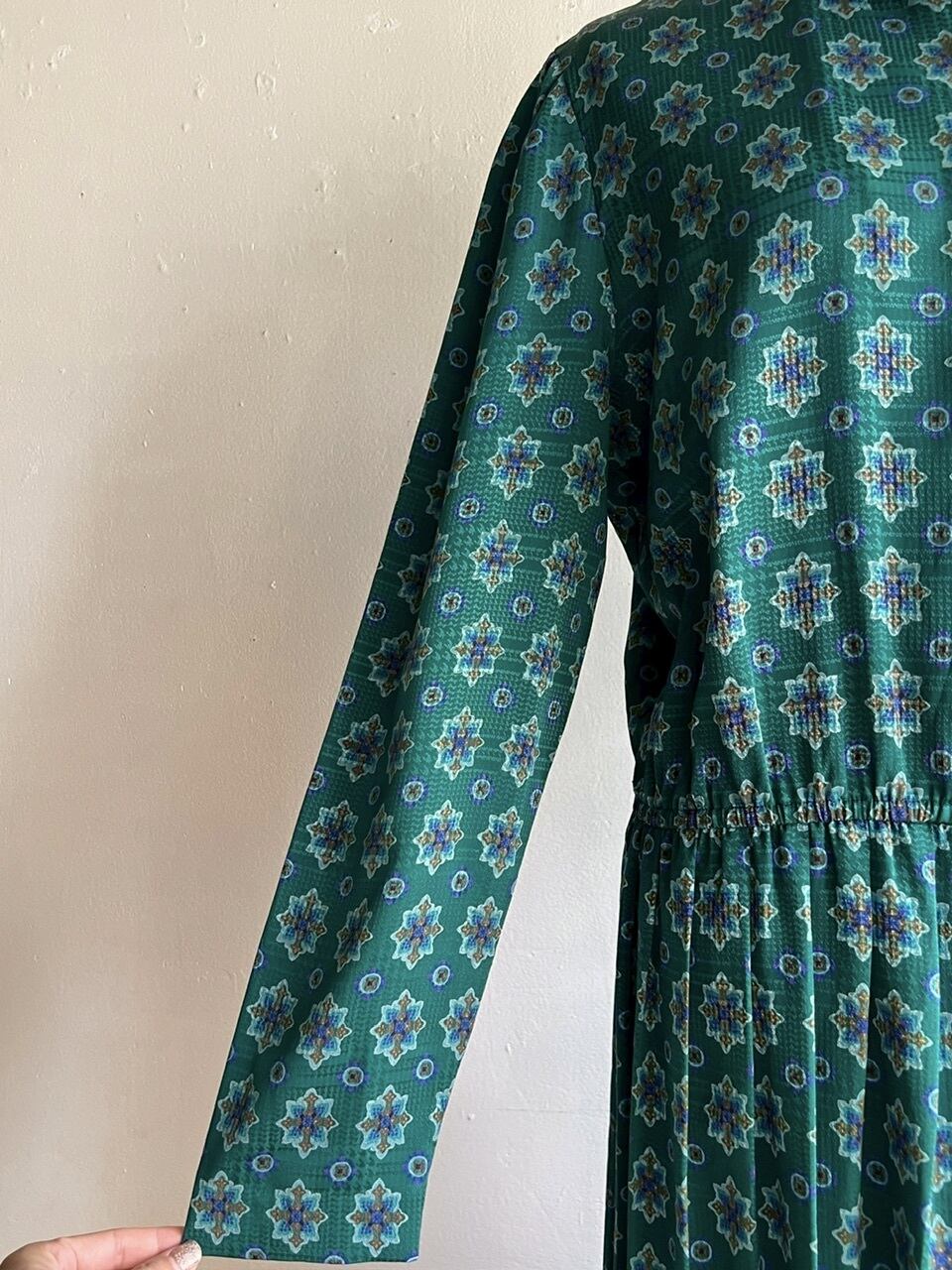 落ち着いたグリーンとゴールドカラーの装飾ボタン、ライトブラウンとパープルの十字架のようなレトロな柄がとっても可愛いワンピース。