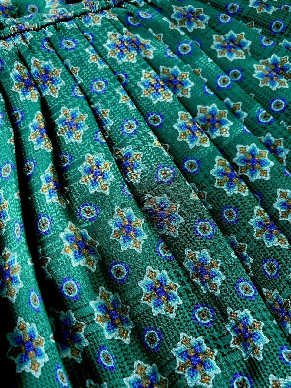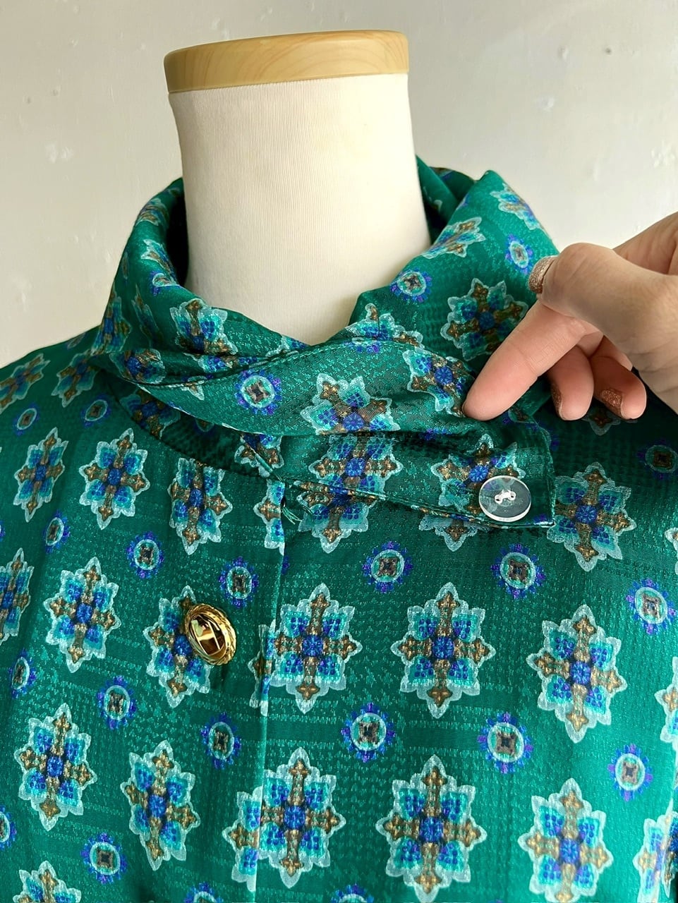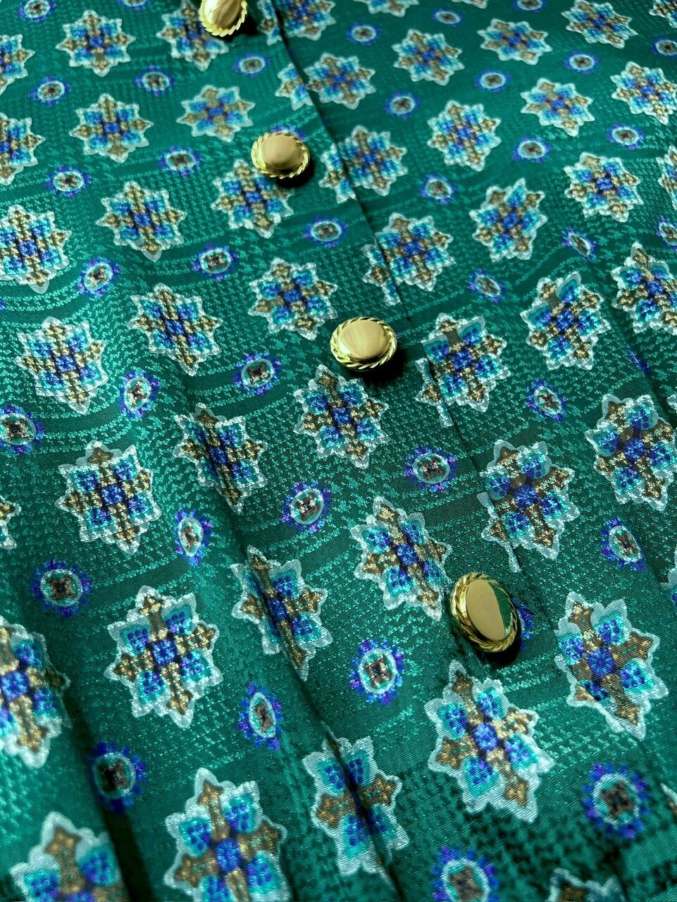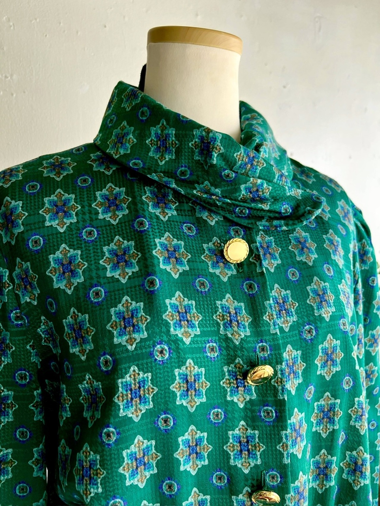 落ち着いたグリーンとゴールドカラーの装飾ボタン、ライトブラウンとパープルの十字架のようなレトロな柄がとっても可愛いワンピース。