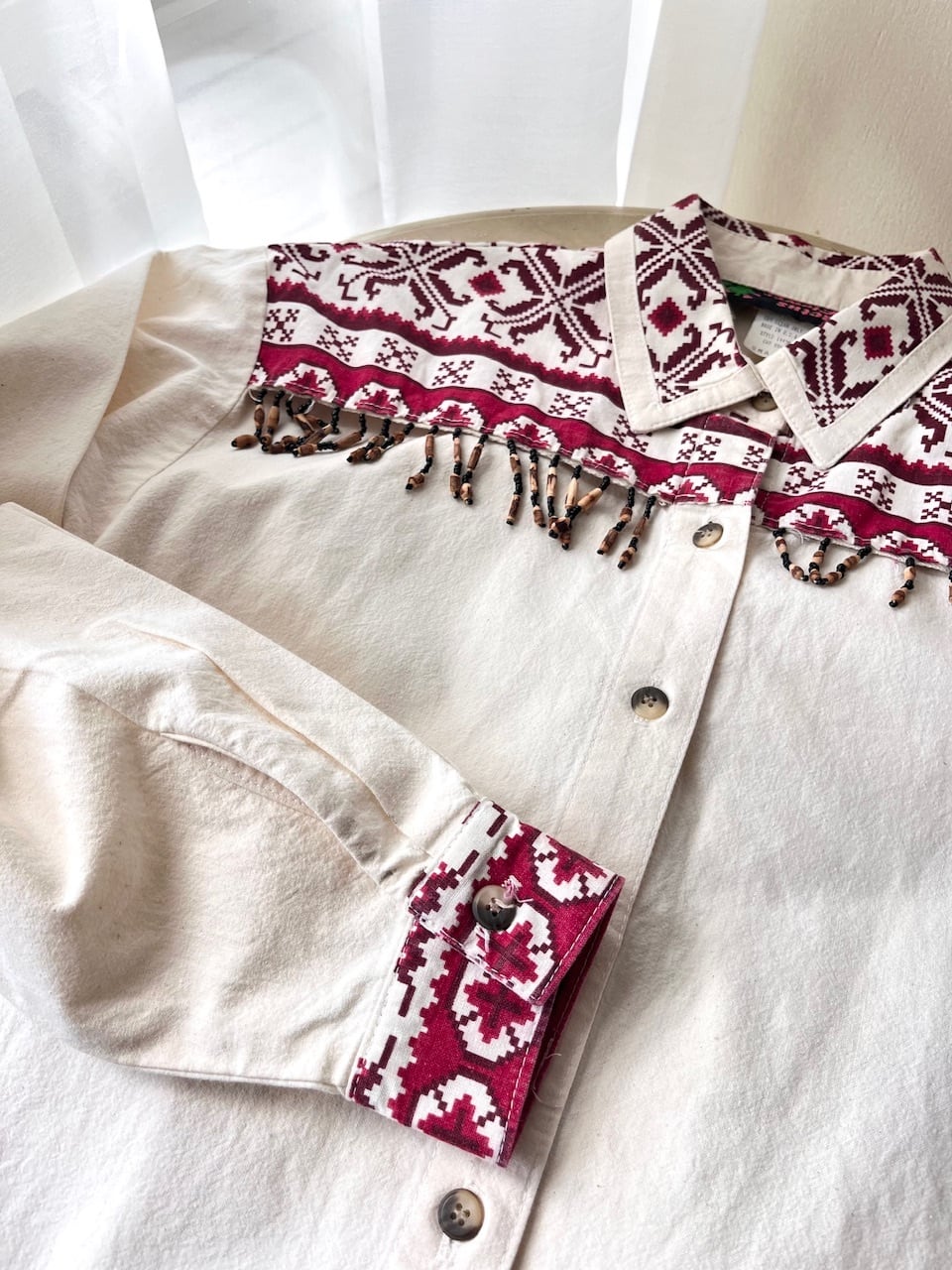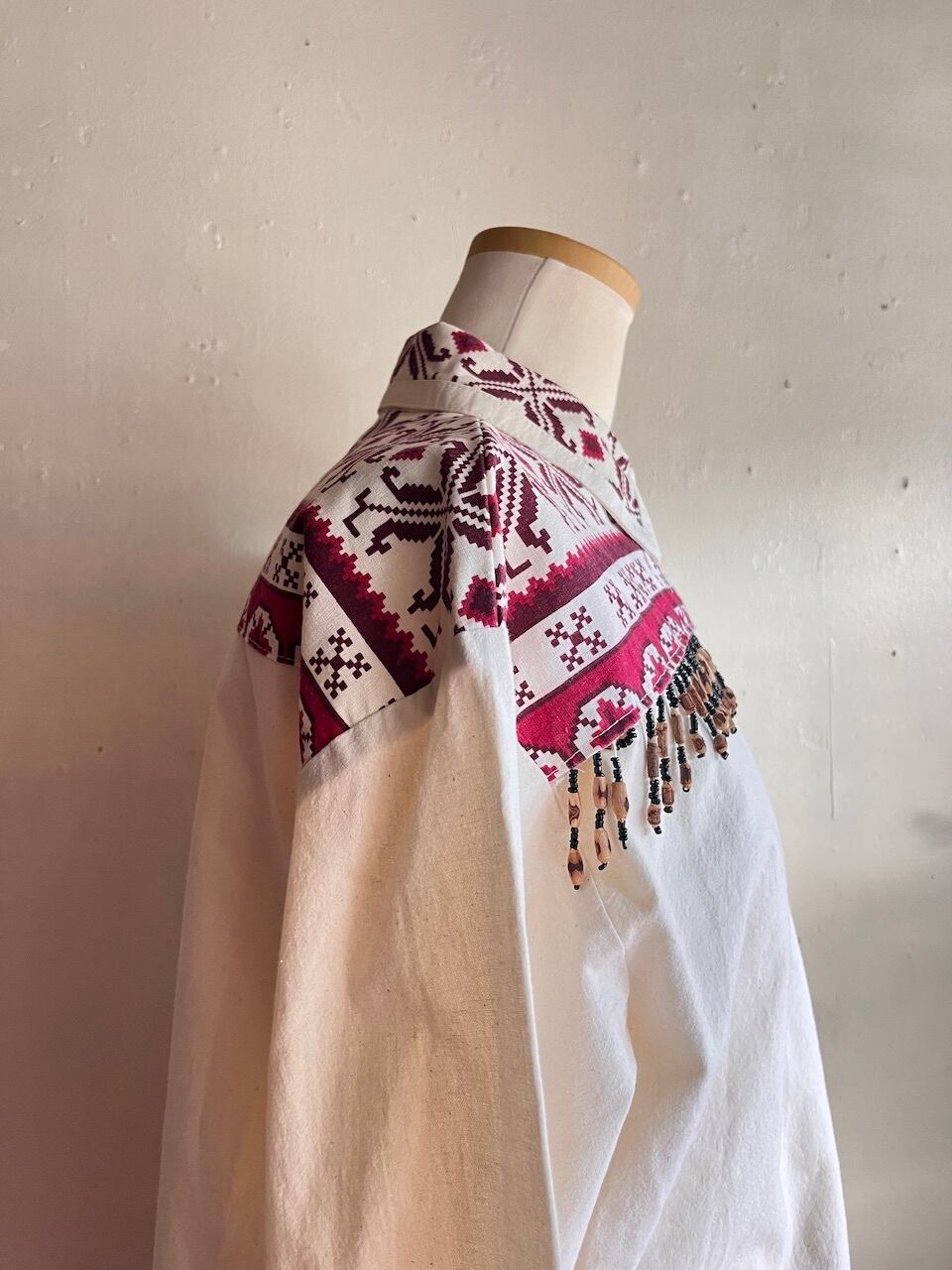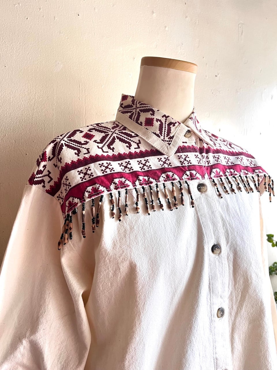 ネイティブ調の幾何学模様のヨーク部分には、細やかなビーズとウッドビーズのフリンジが施され、動くたびにさりげない存在感を演出してくれるヴィンテージシャツ。