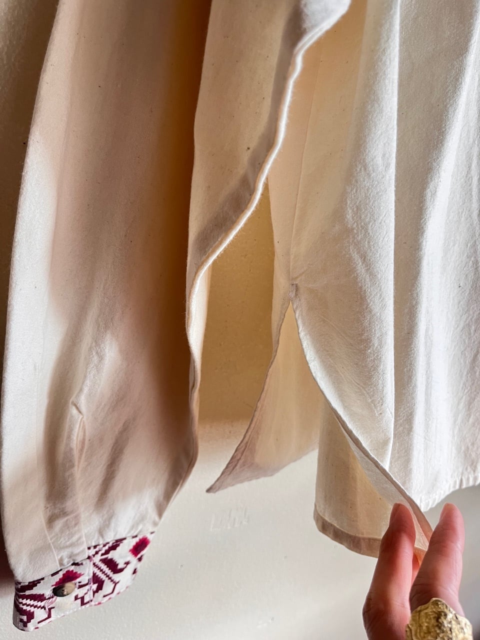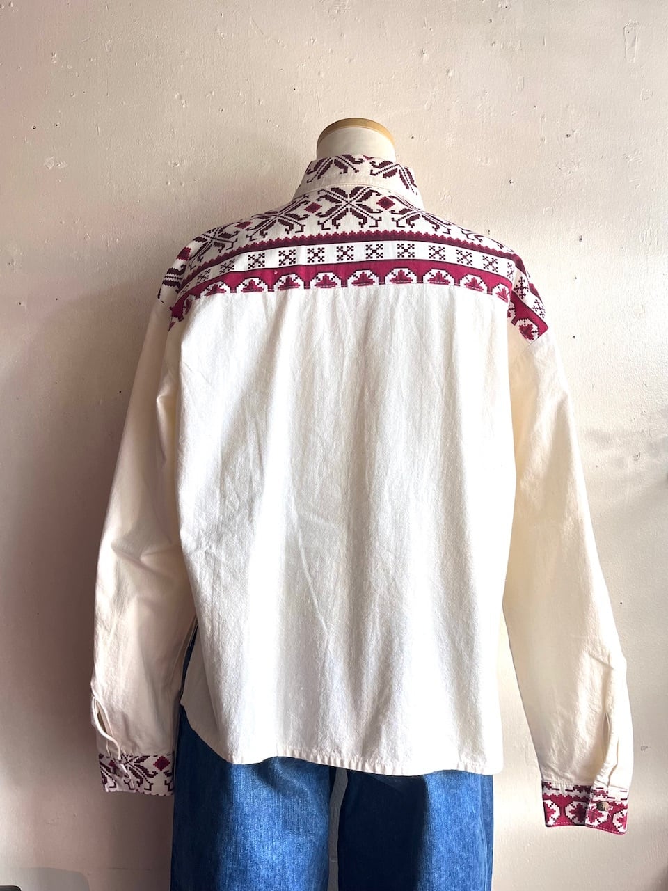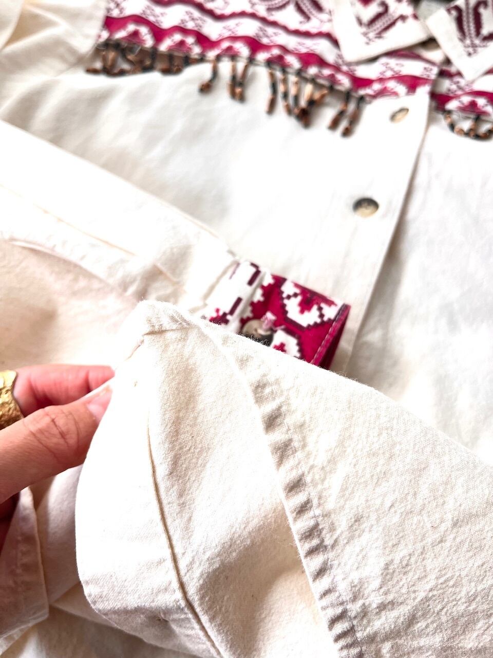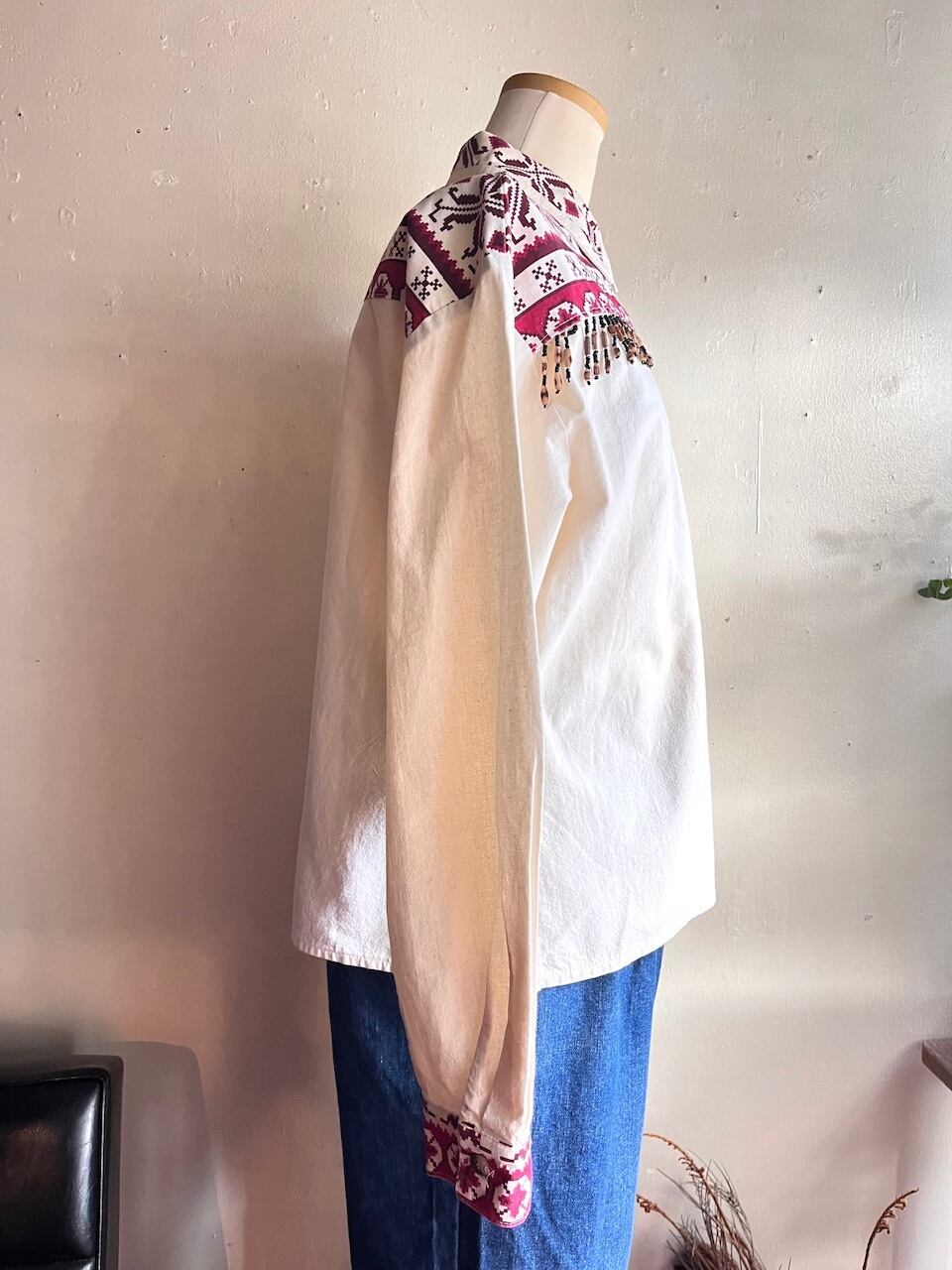 ネイティブ調の幾何学模様のヨーク部分には、細やかなビーズとウッドビーズのフリンジが施され、動くたびにさりげない存在感を演出してくれるヴィンテージシャツ。