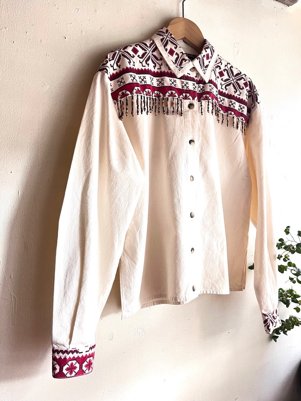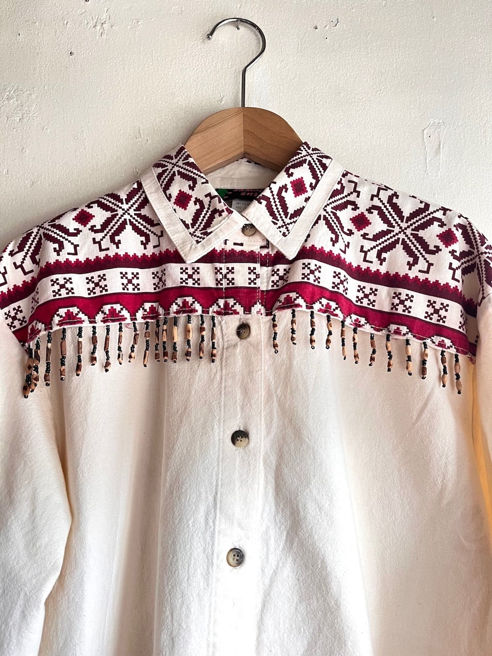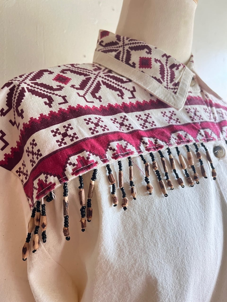 80s USA native pattern&bijou fringe shirt/ネイティブ柄とウッド&ビーズのショート丈ヴィンテージシャツ | MOTHER MEETS vintage 〜神戸岡本・ヴィンテージ古着屋〜