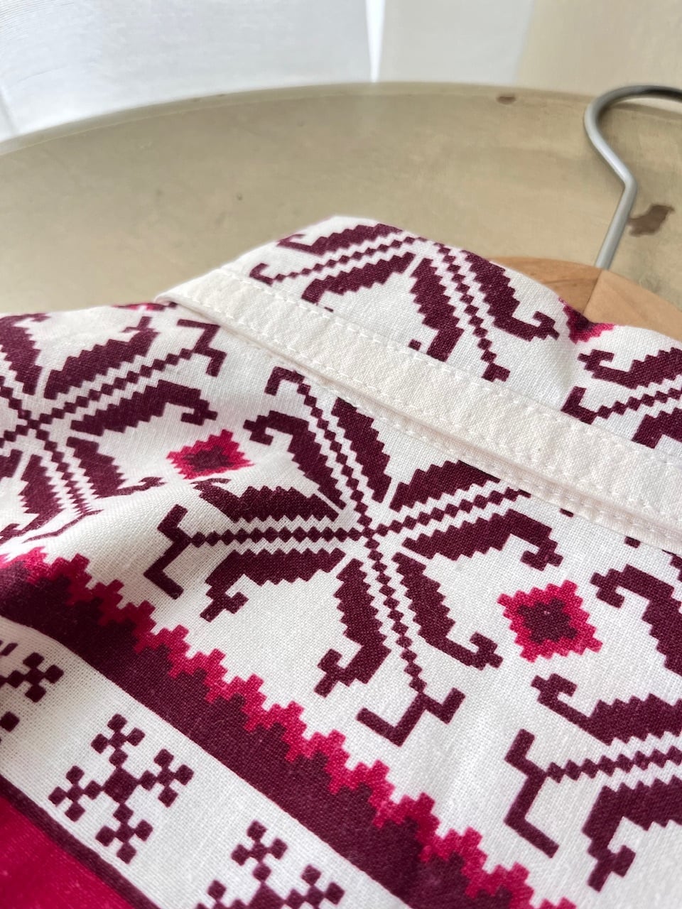 柔らかな生成りベースの生地に、赤&エンジ色の配色が映える印象的な1枚です。