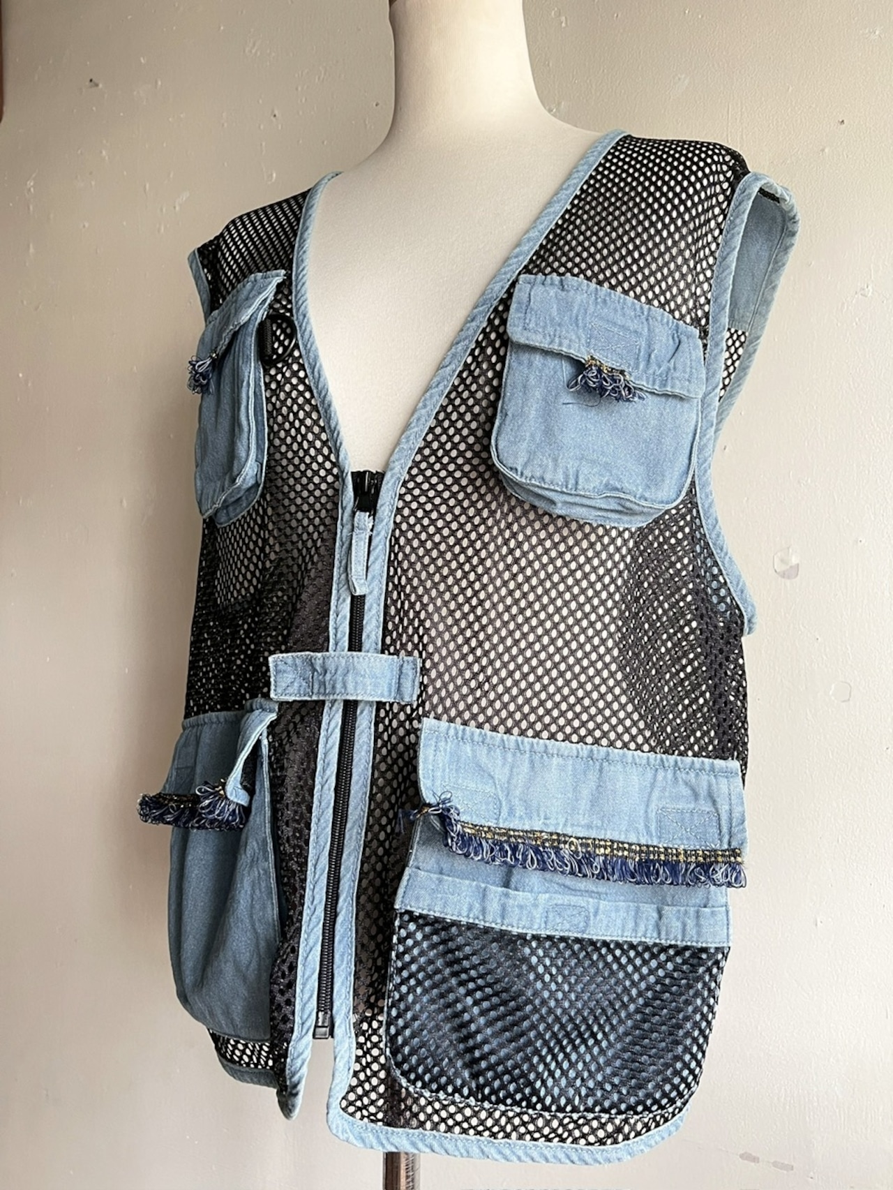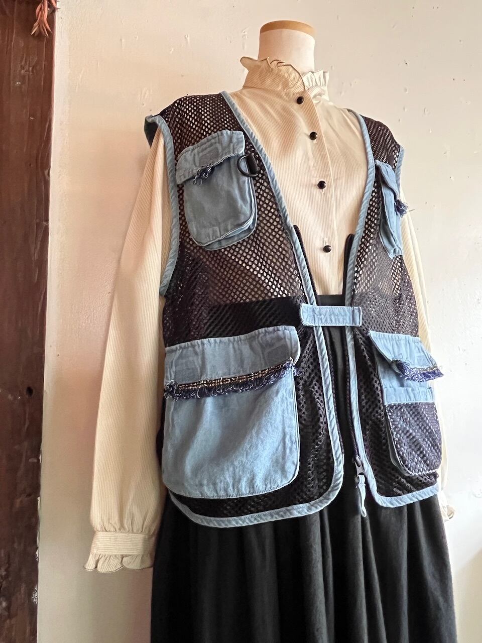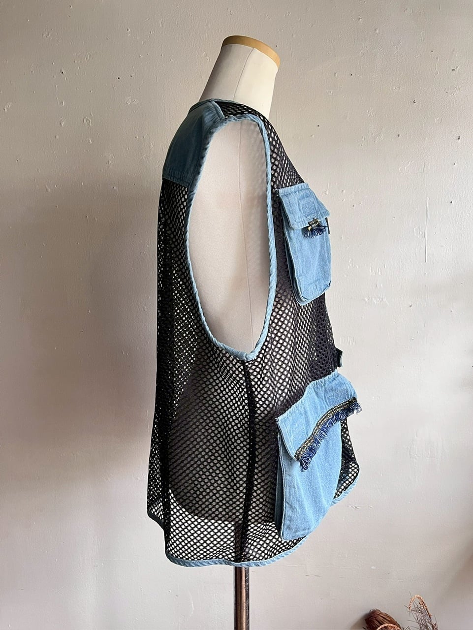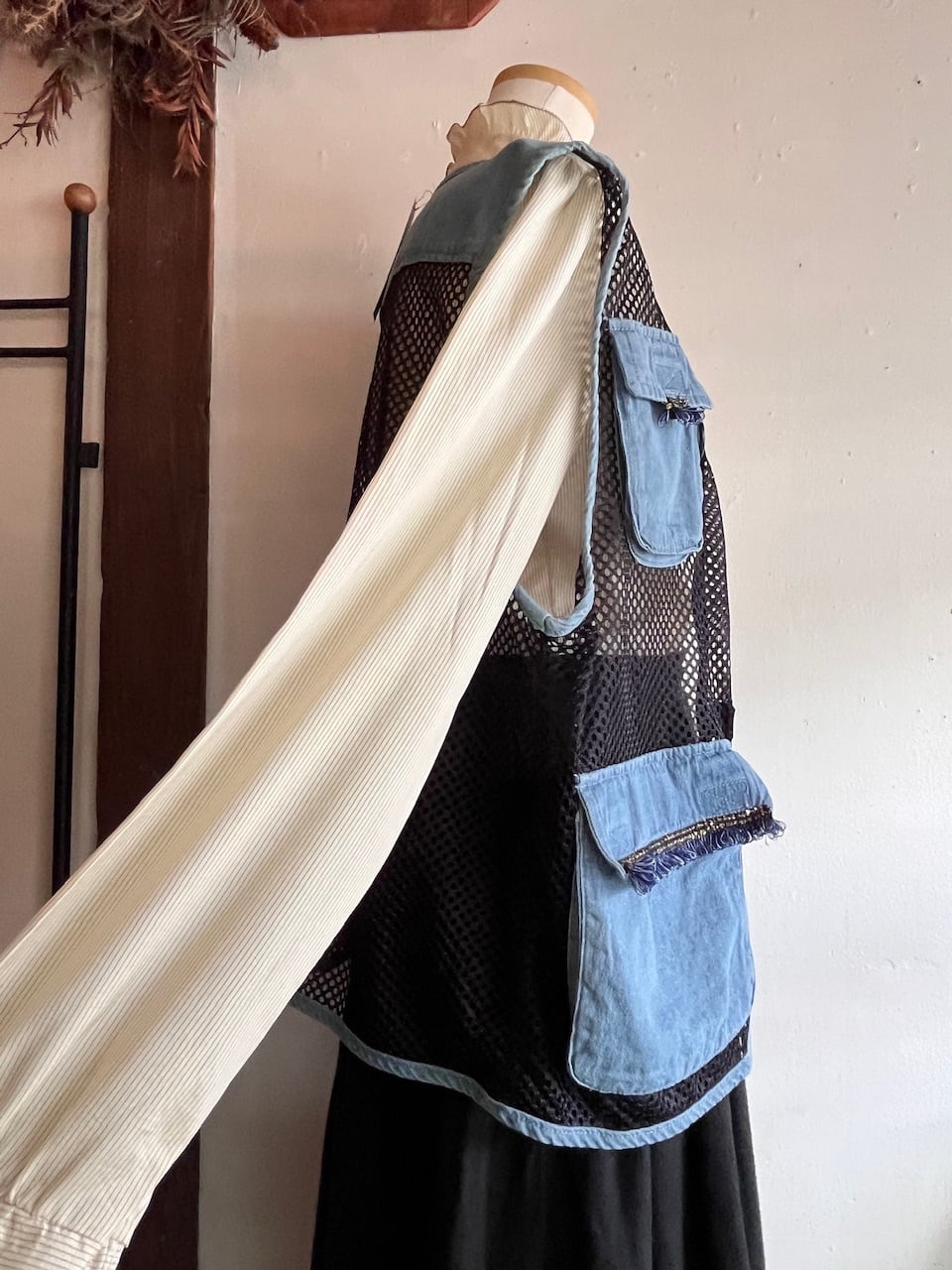 Remake Fisherman Mesh Vest with Denim fringe Pockets /フリンジデニムポケットつきのフィッシャーマンベスト