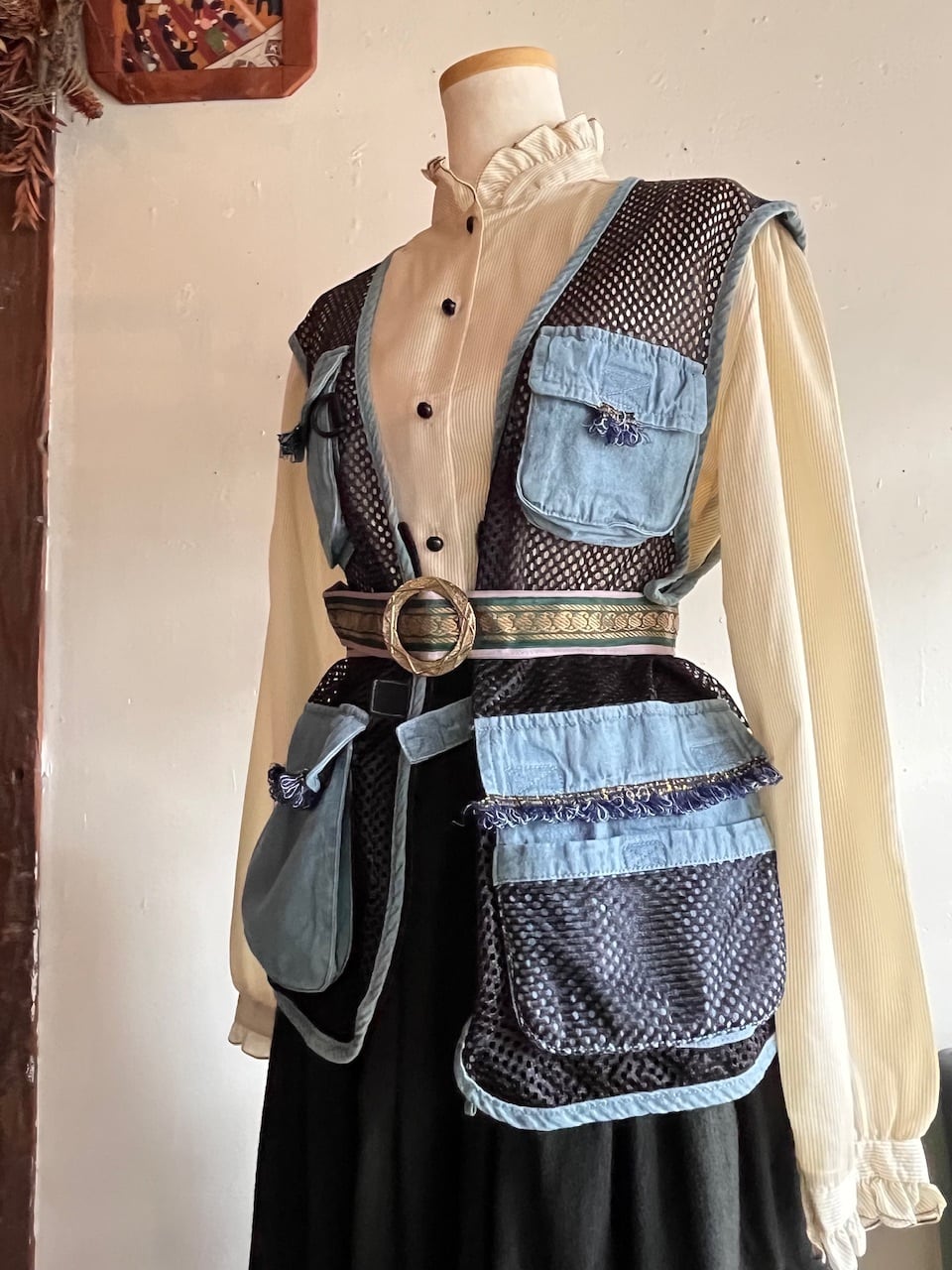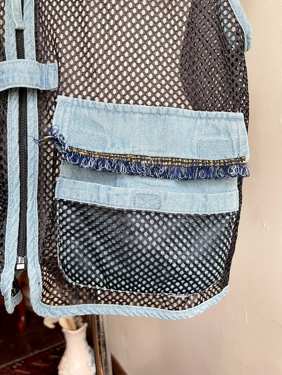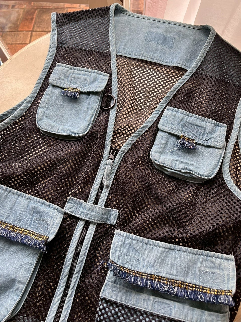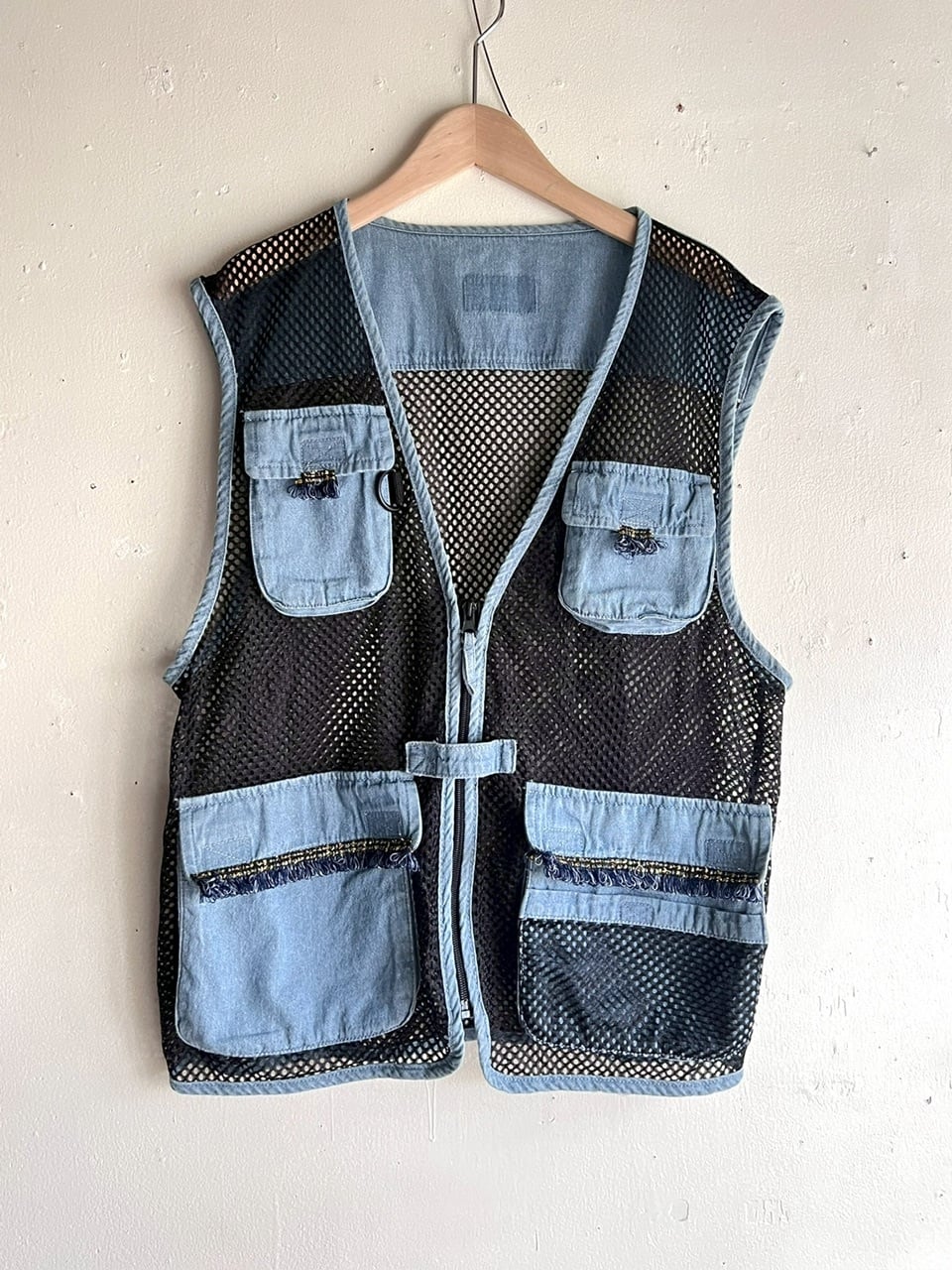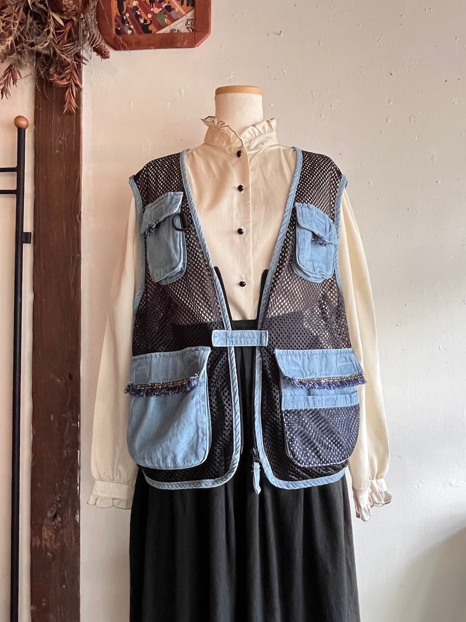 Remake Fisherman Mesh Vest with Denim fringe Pockets /フリンジデニムポケットつきのフィッシャーマンベスト