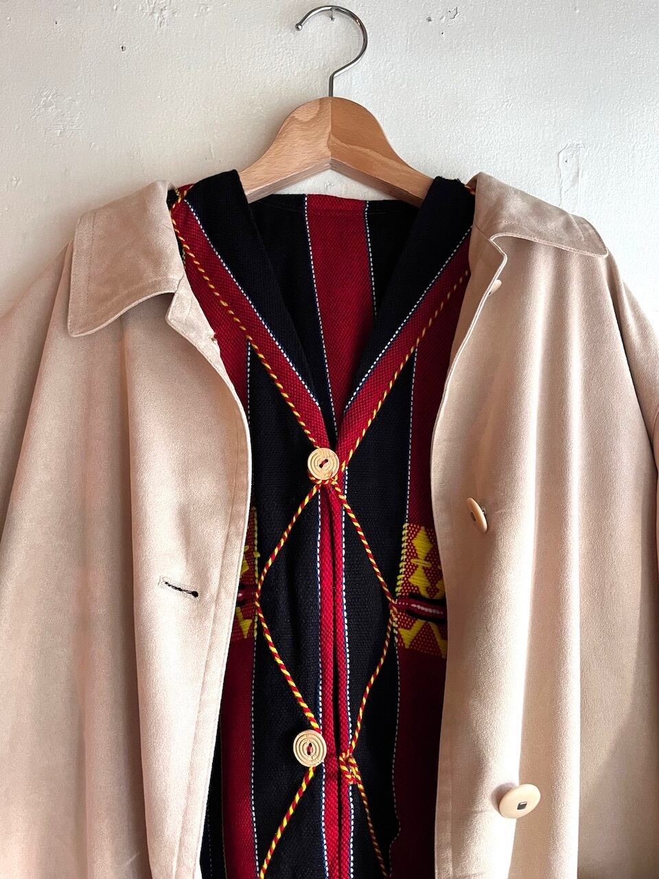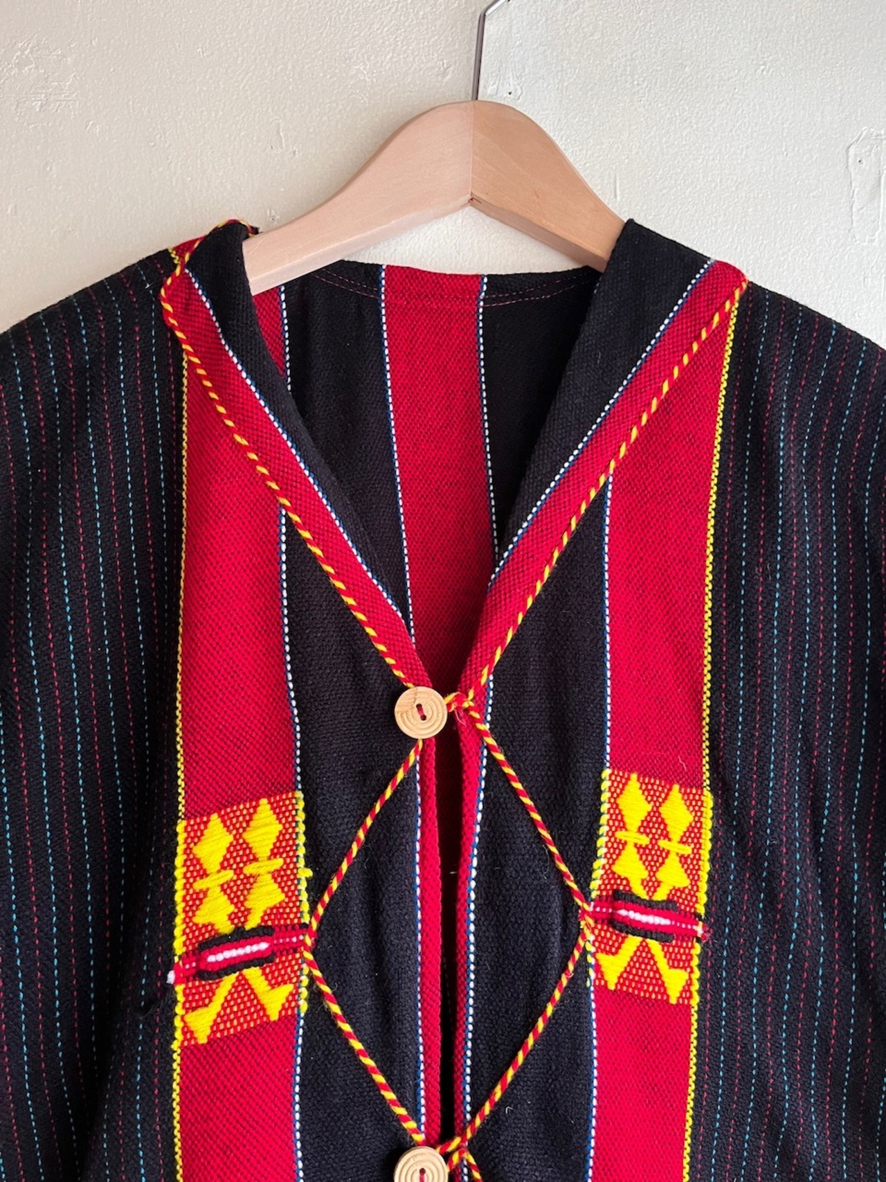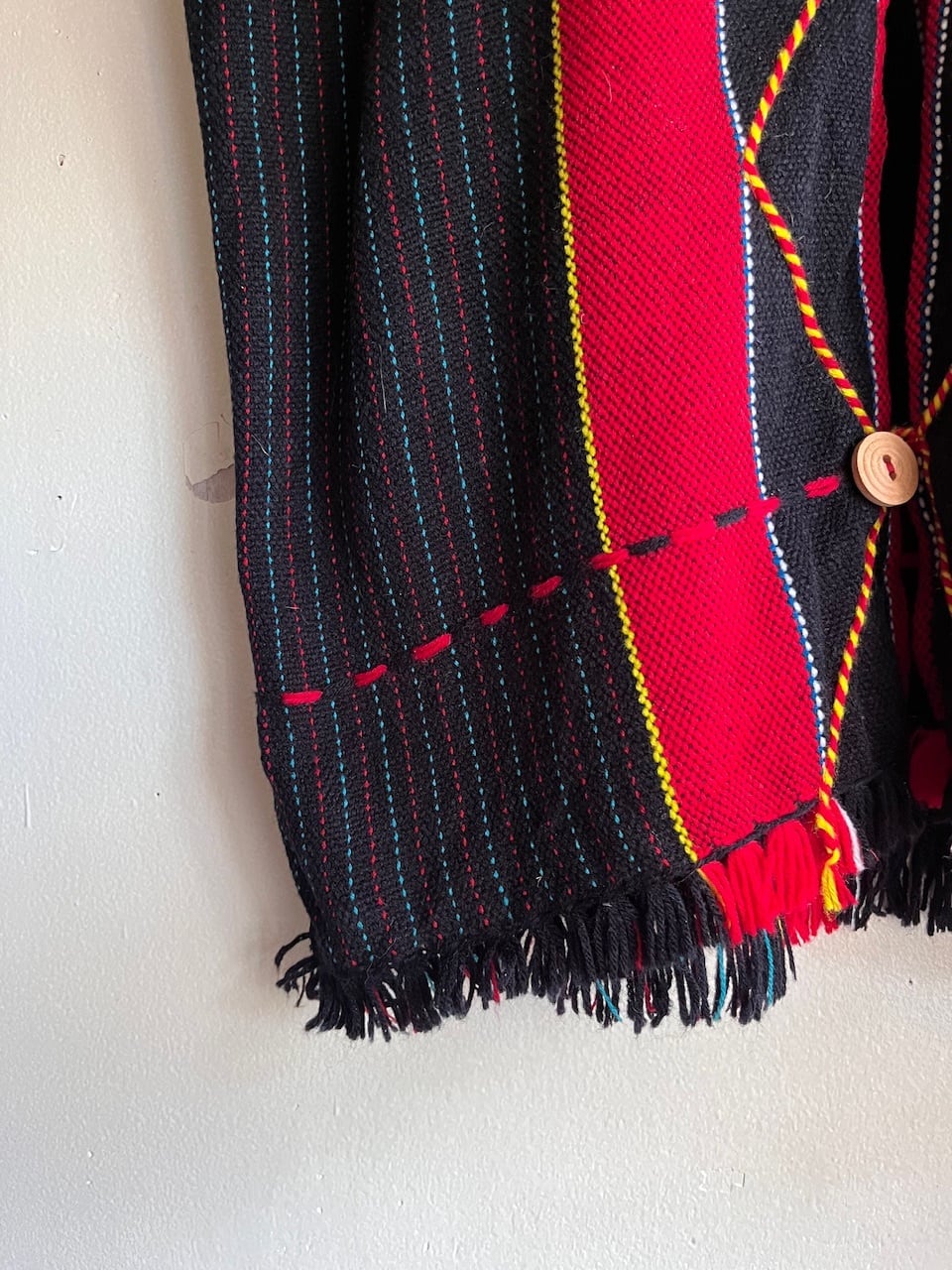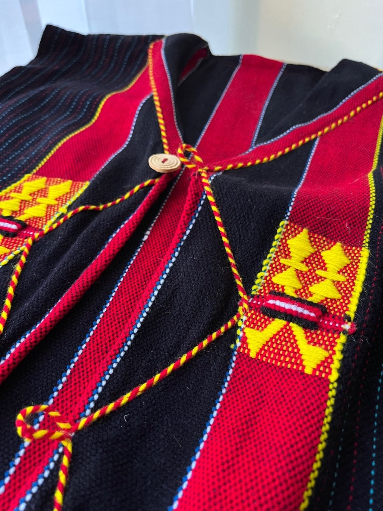手仕事ならではの温かみある織り模様に、ウッドボタンやカラフルなロープ飾りが施されたフォークロアデザインです。