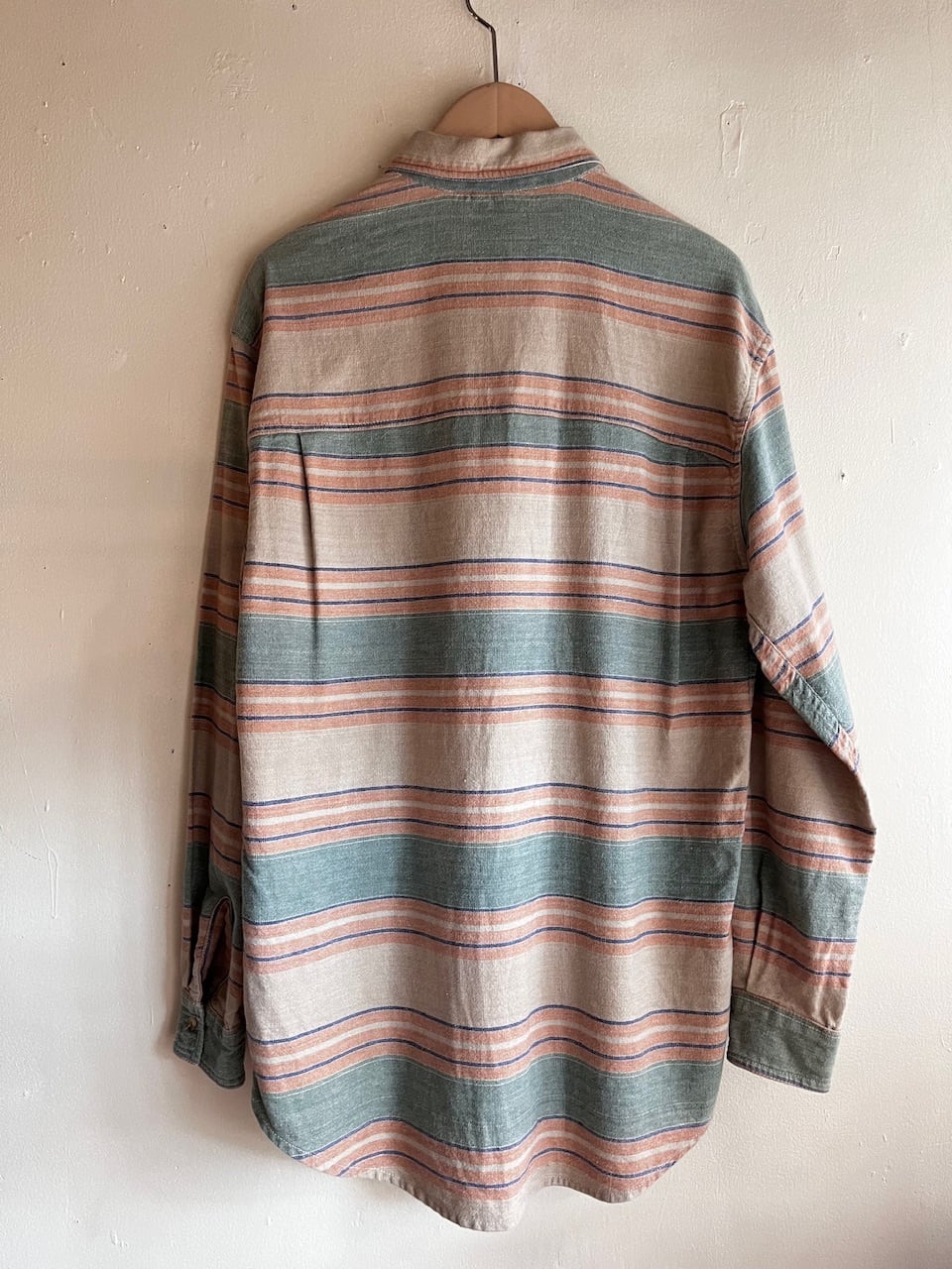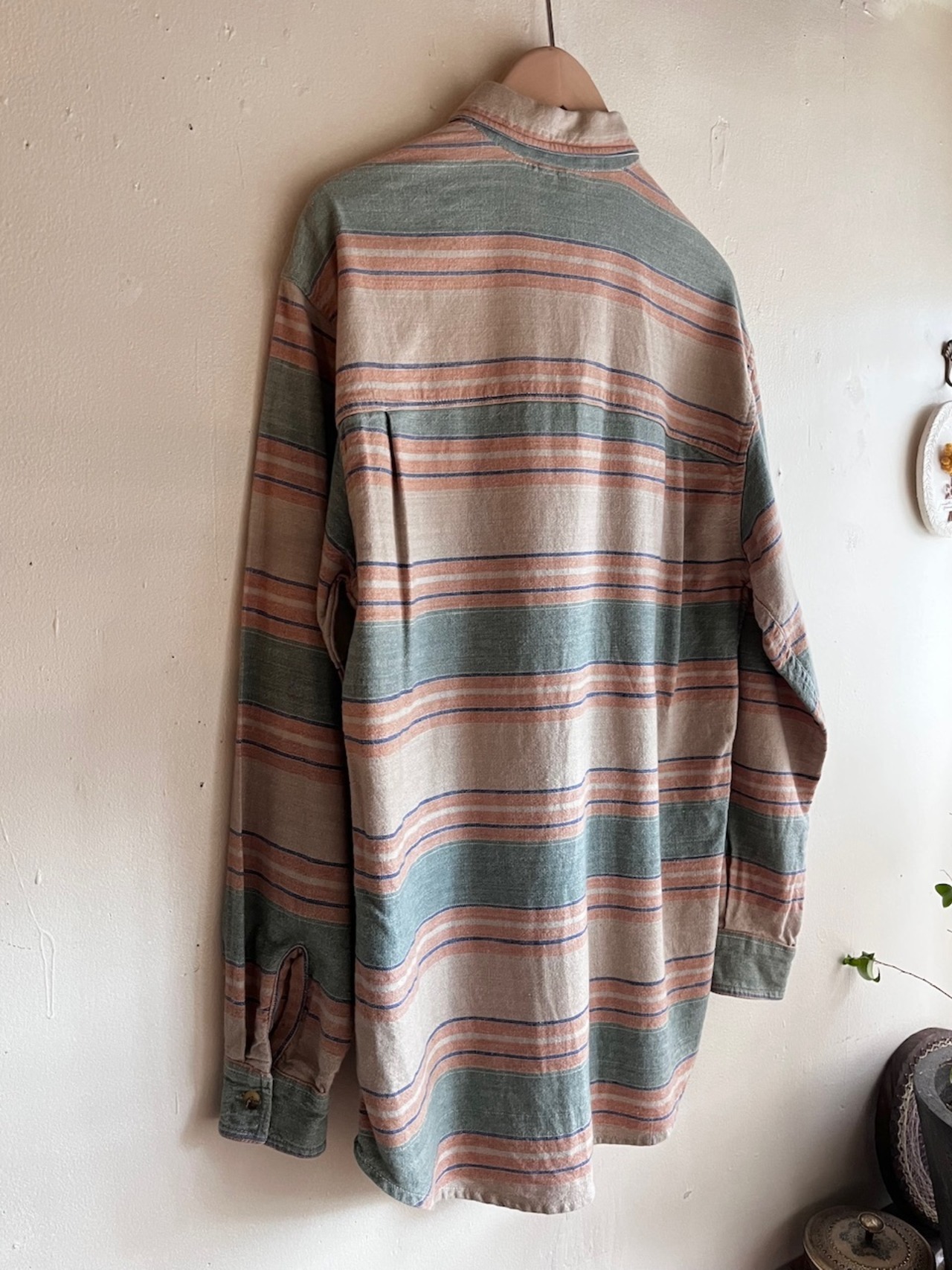 柔らかな生地に淡いグリーンとサーモンベージュのストライプが優しく映える一枚です。
