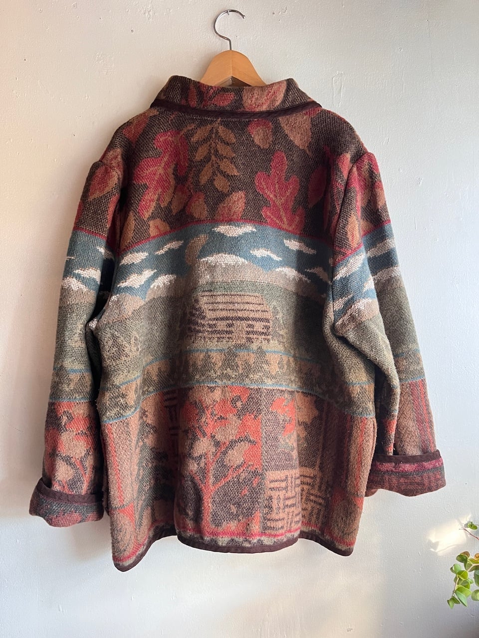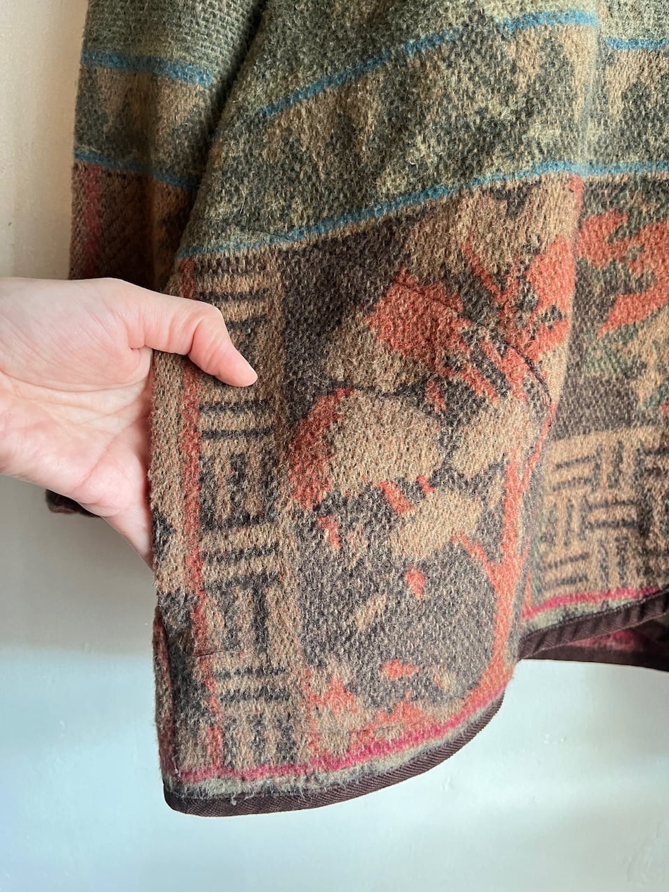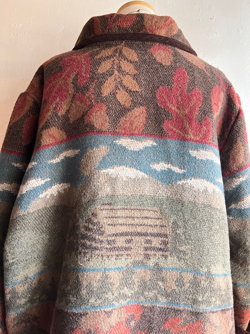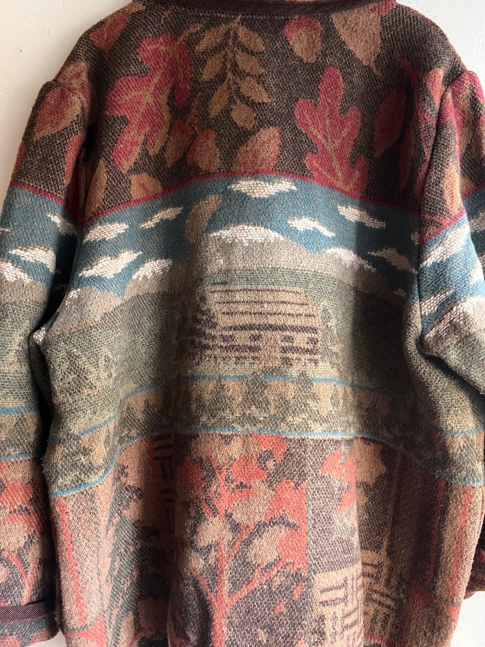 山や雲、リーフを思わせるフォークロア調の風景モチーフが織りで表現された心も温まるほっこりした一枚。