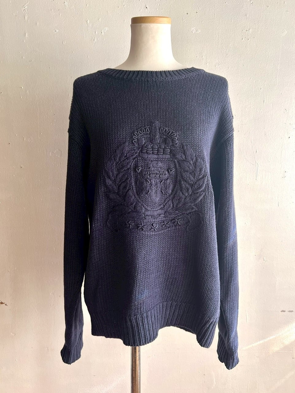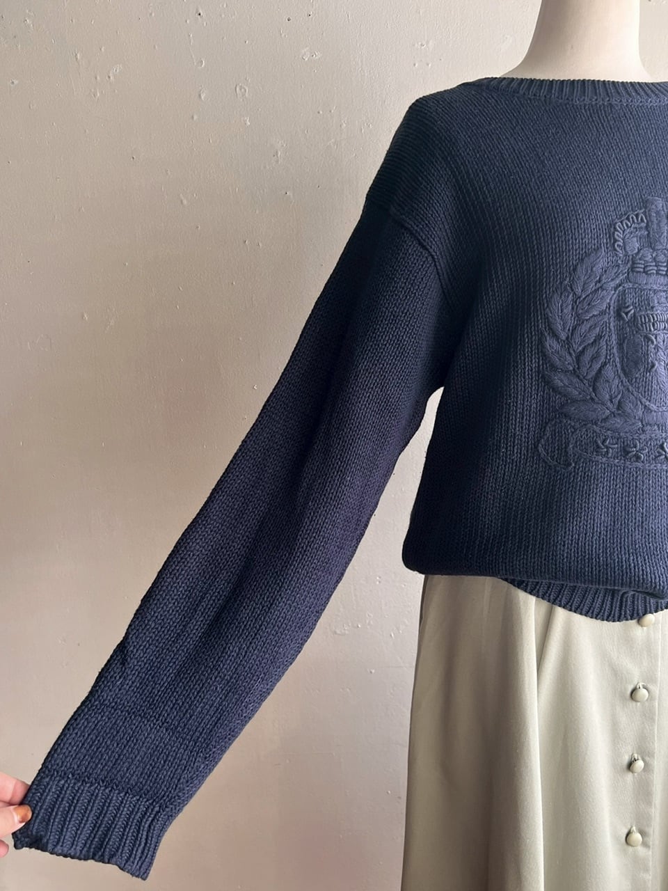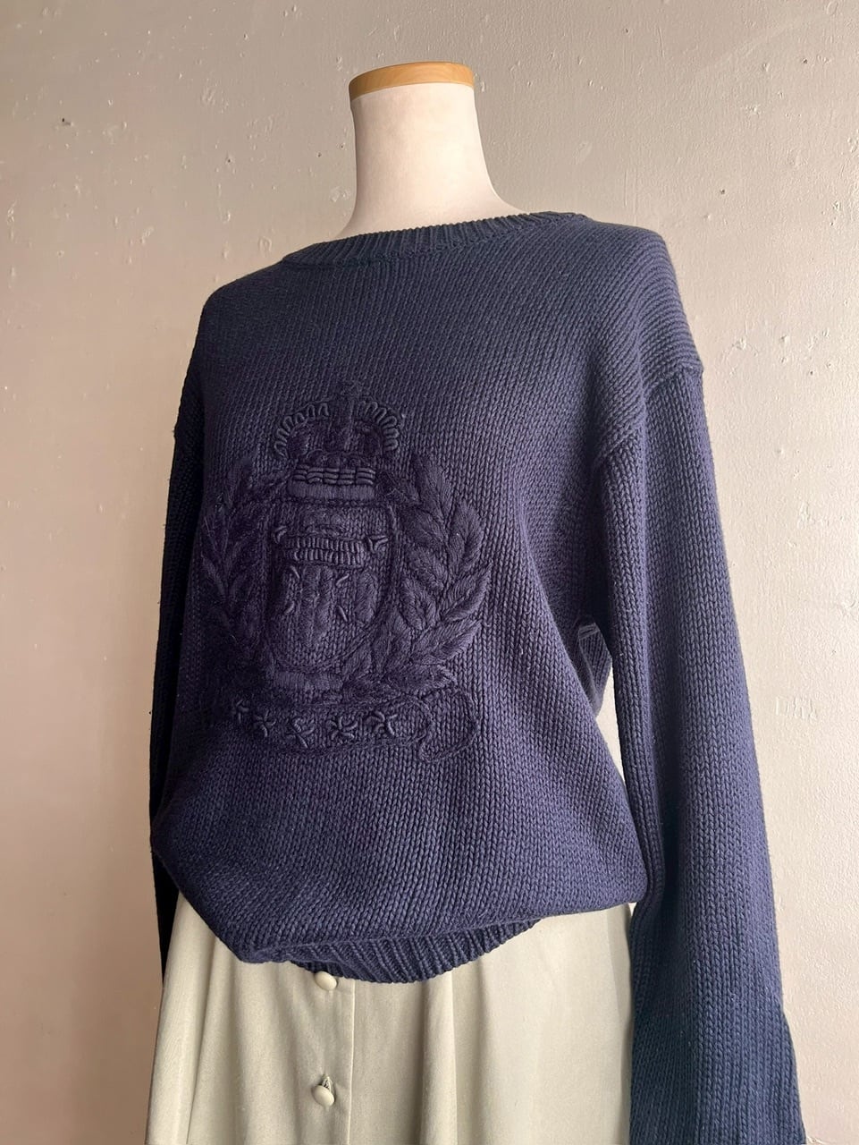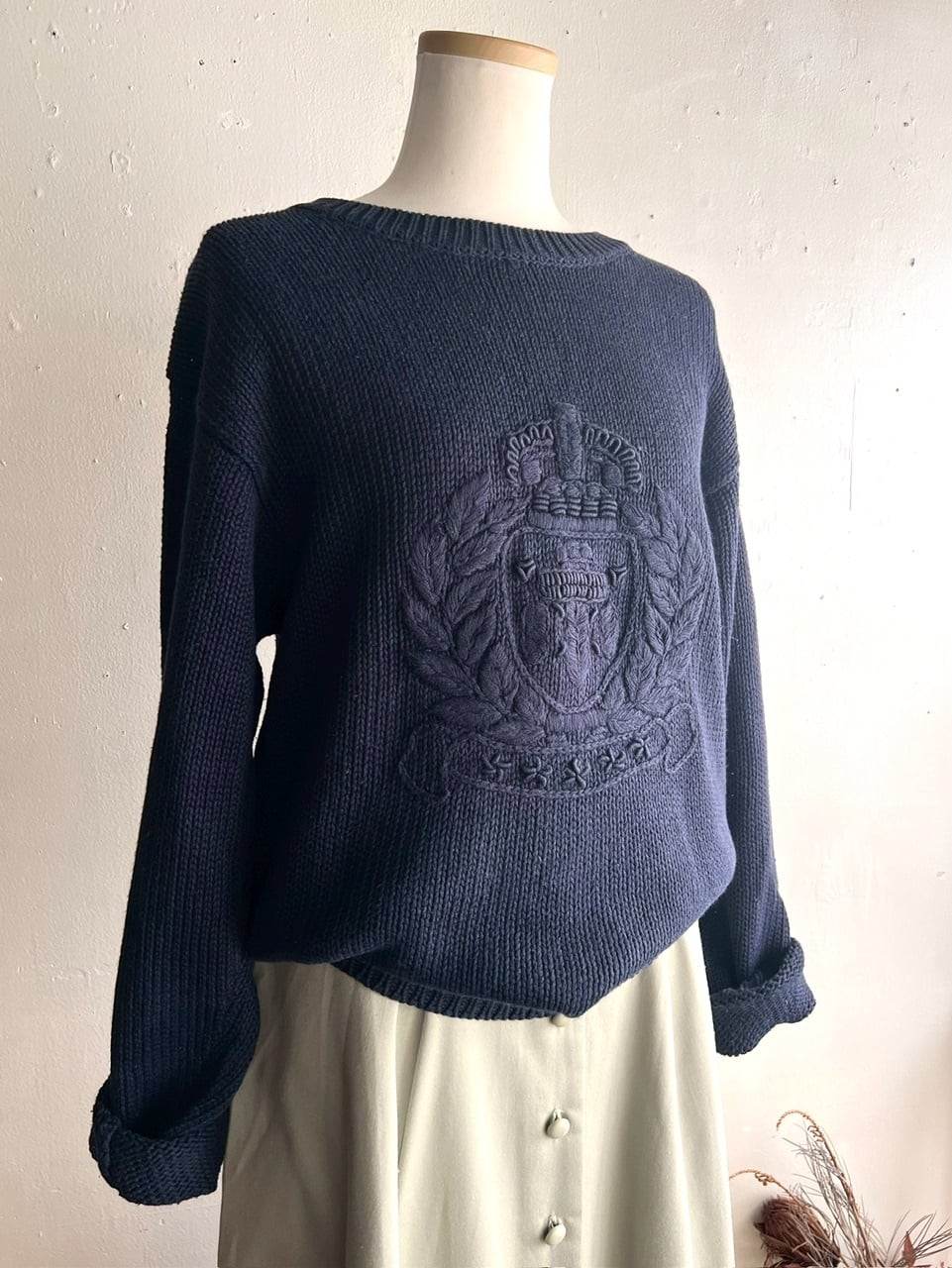 上品なネイビーカラーに、同色で施された立体的なクレスト刺繍が印象的なニットセーター。