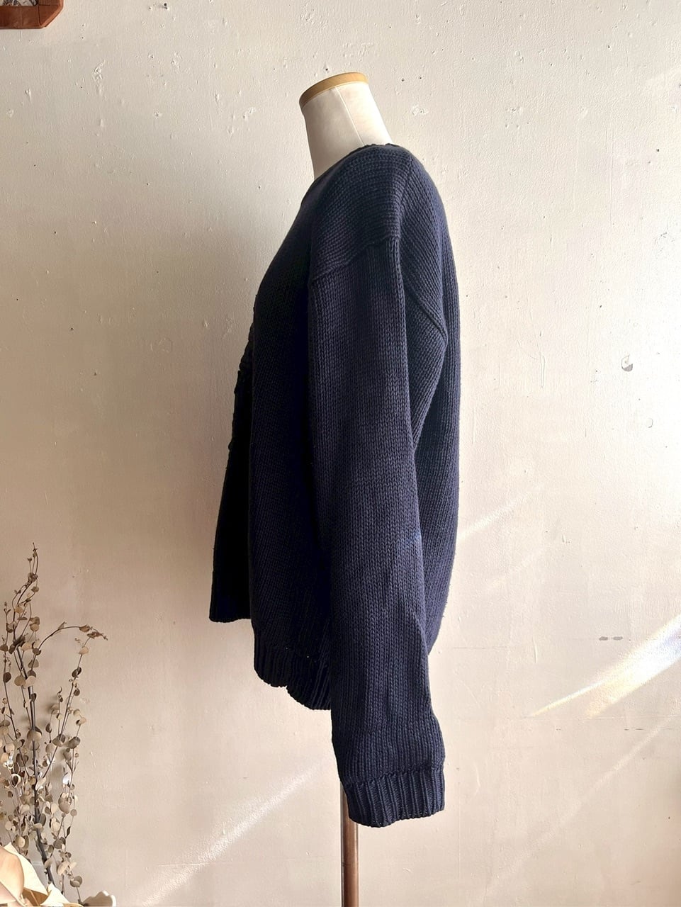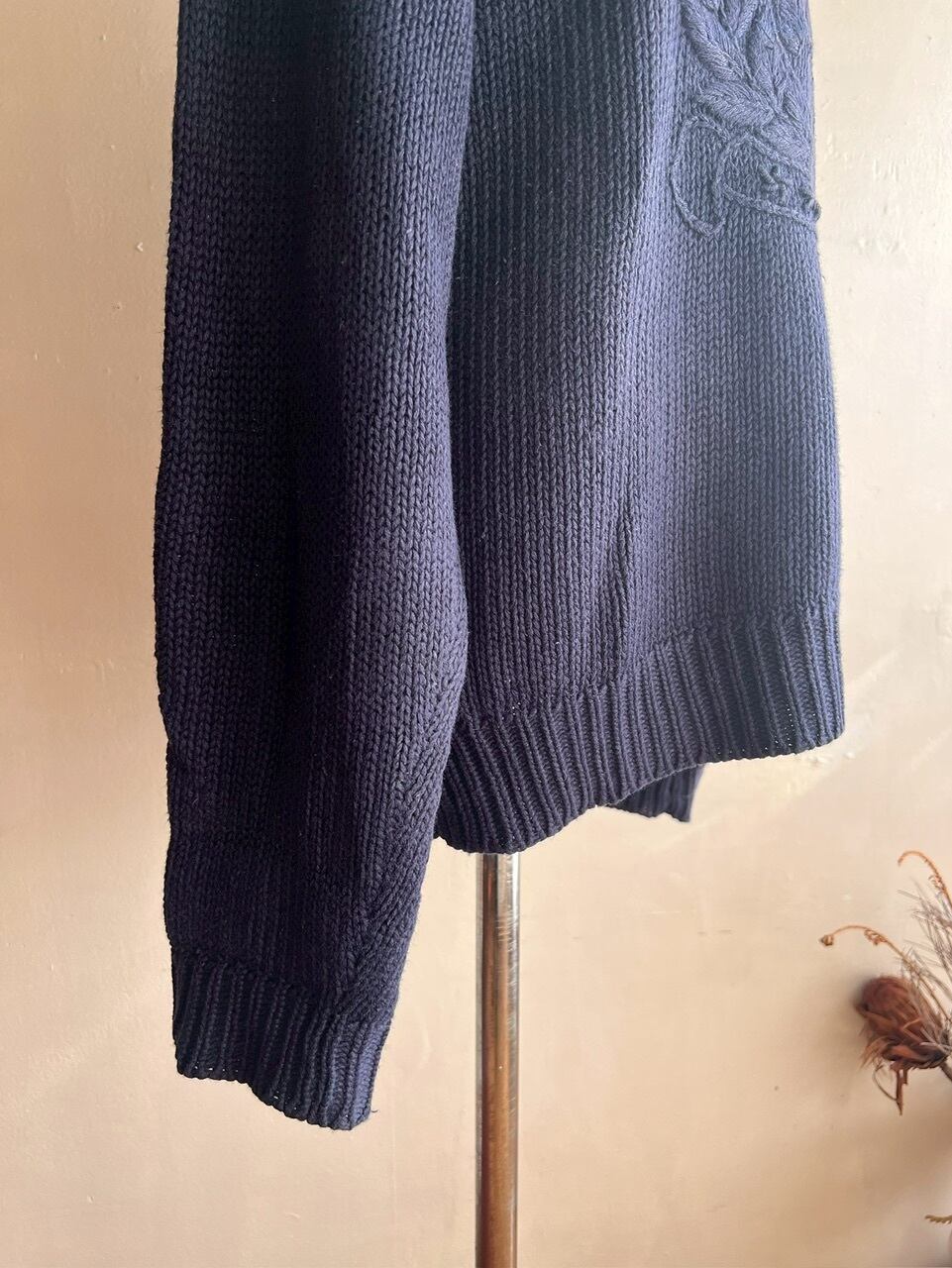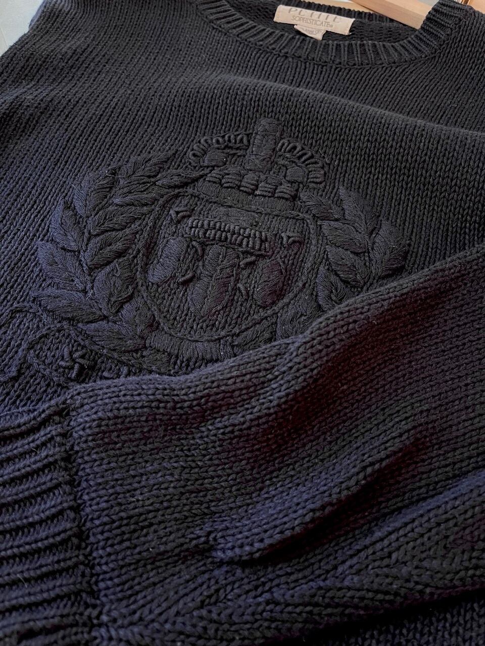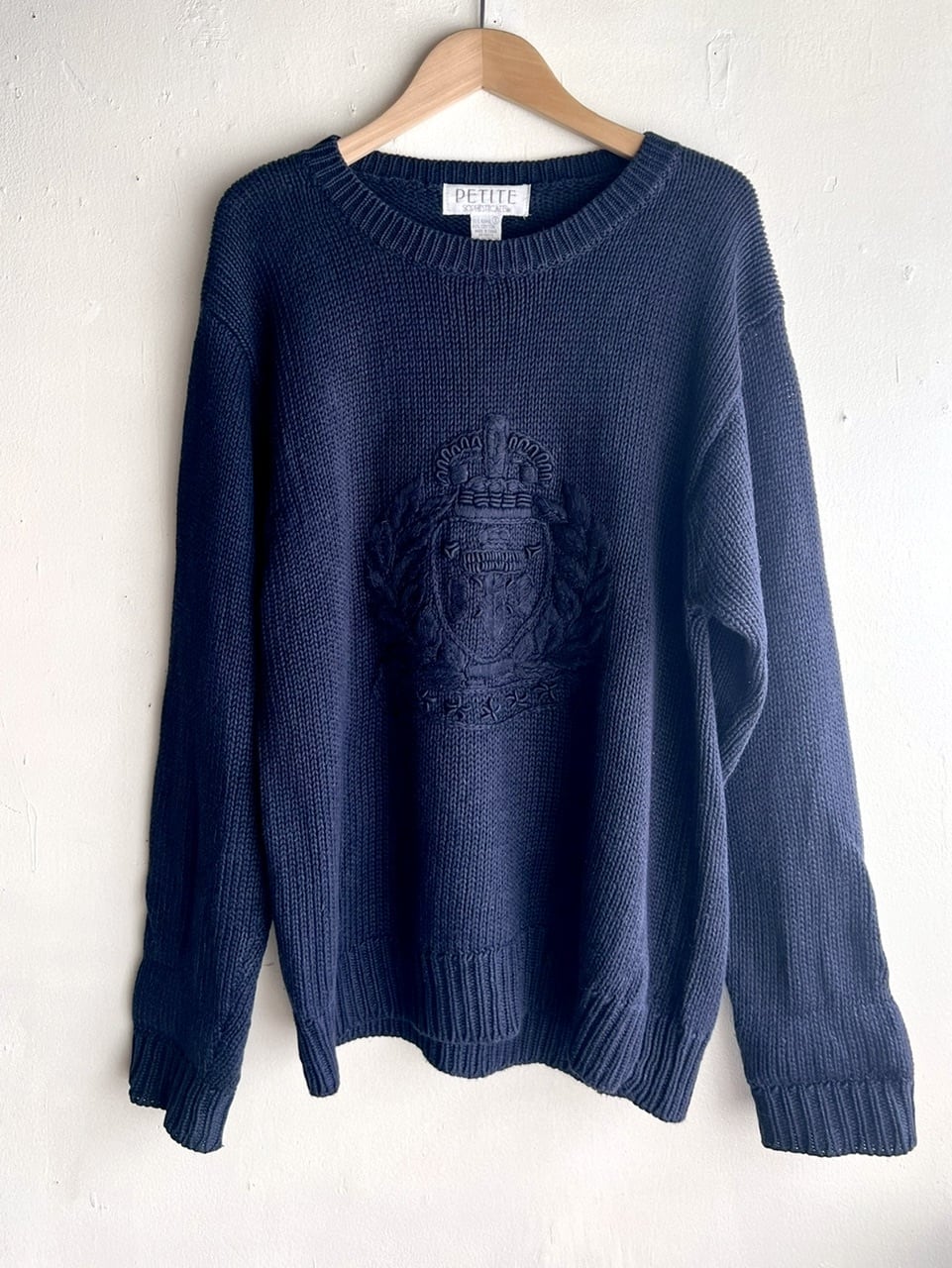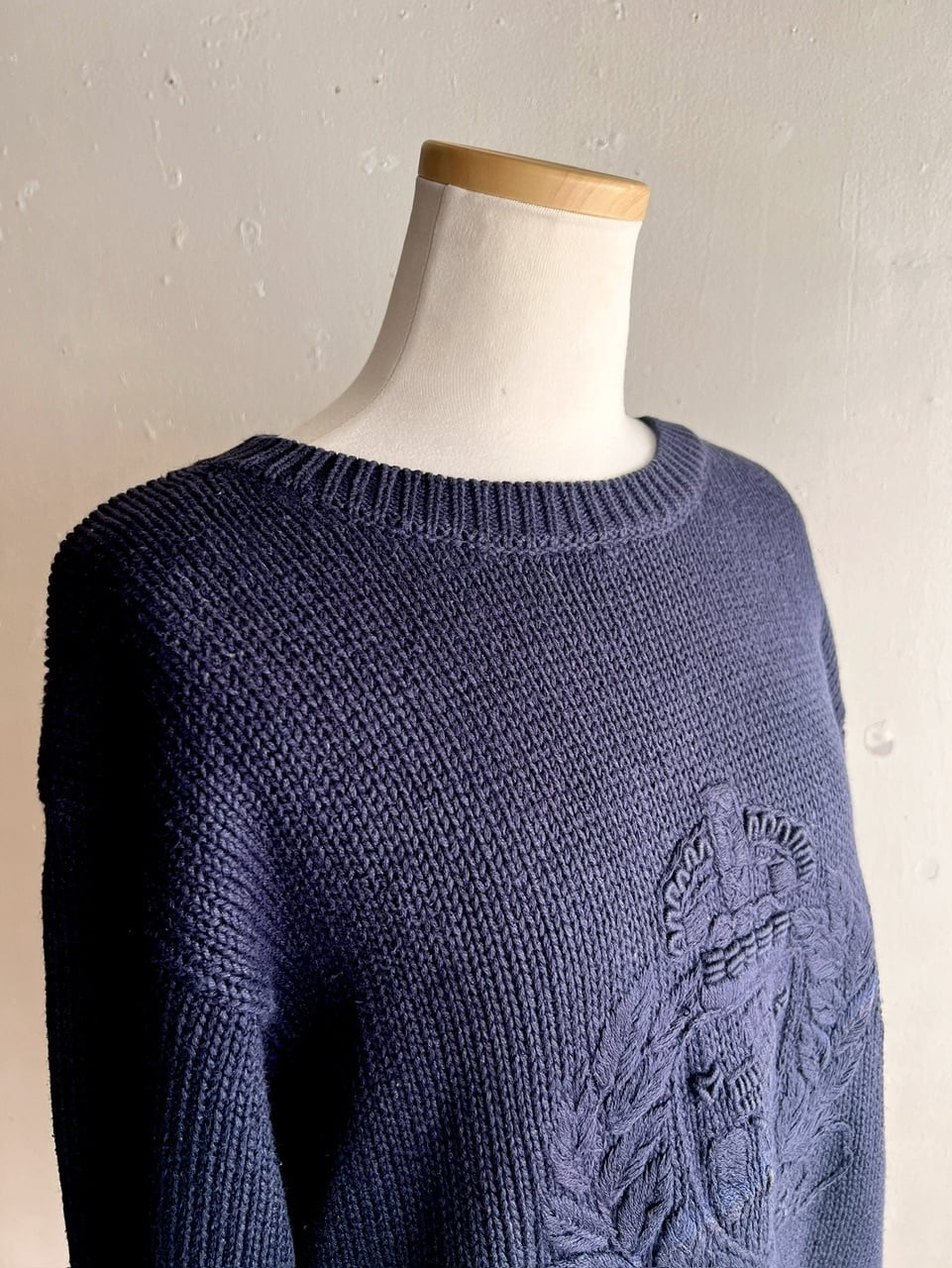 上品なネイビーカラーに、同色で施された立体的なクレスト刺繍が印象的なニットセーター。