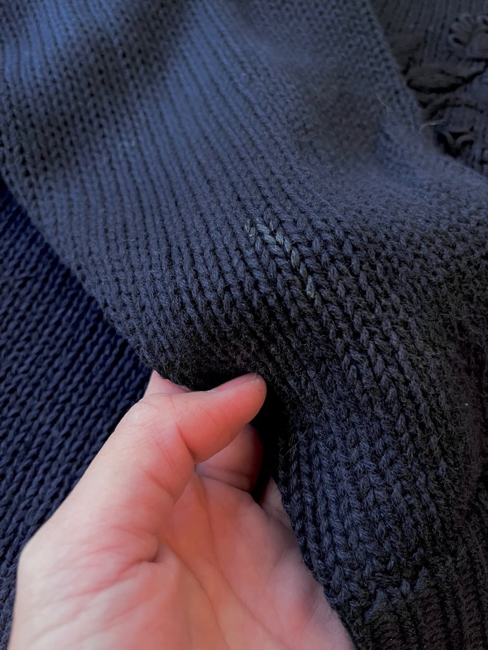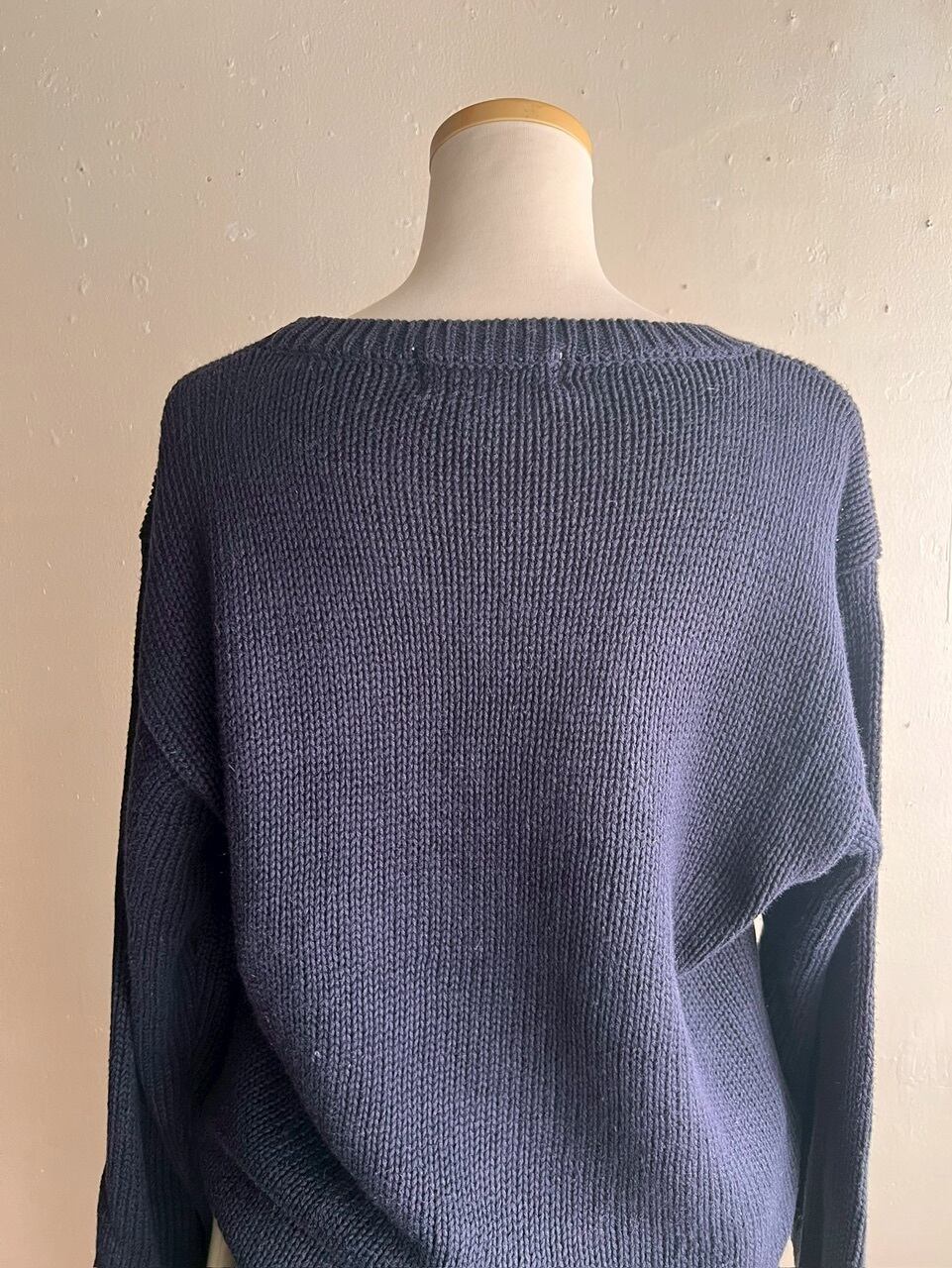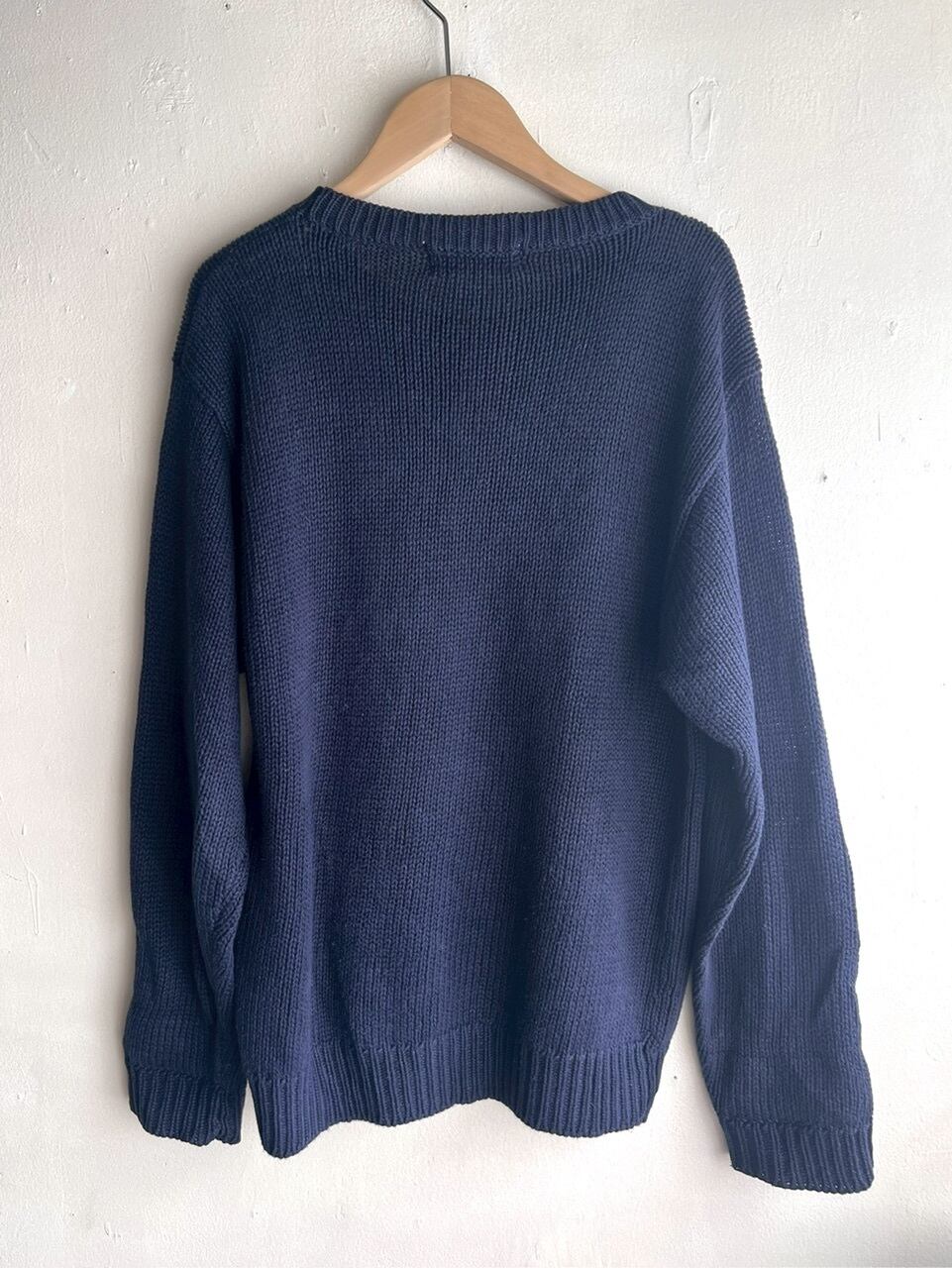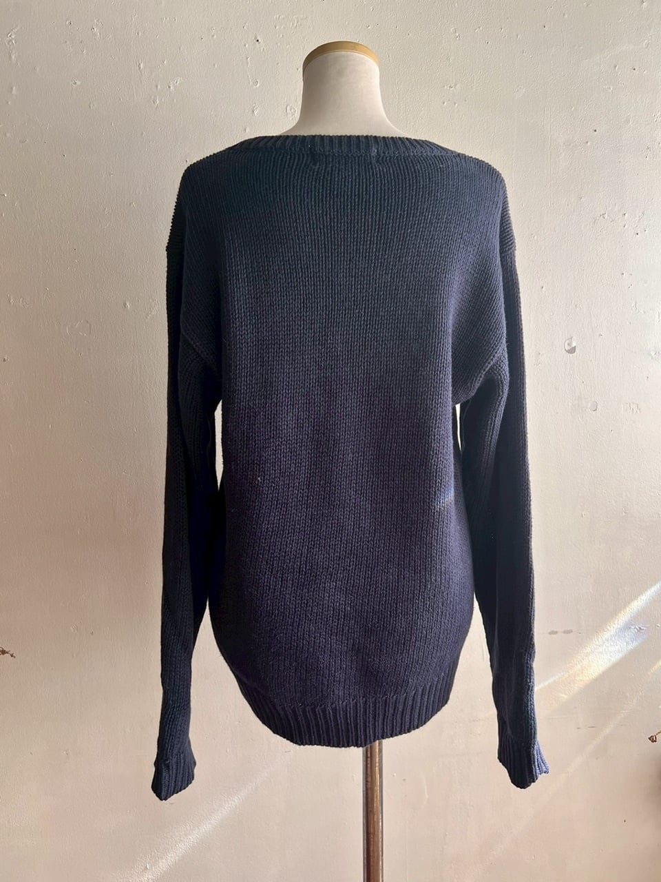 上品なネイビーカラーに、同色で施された立体的なクレスト刺繍が印象的なニットセーター。