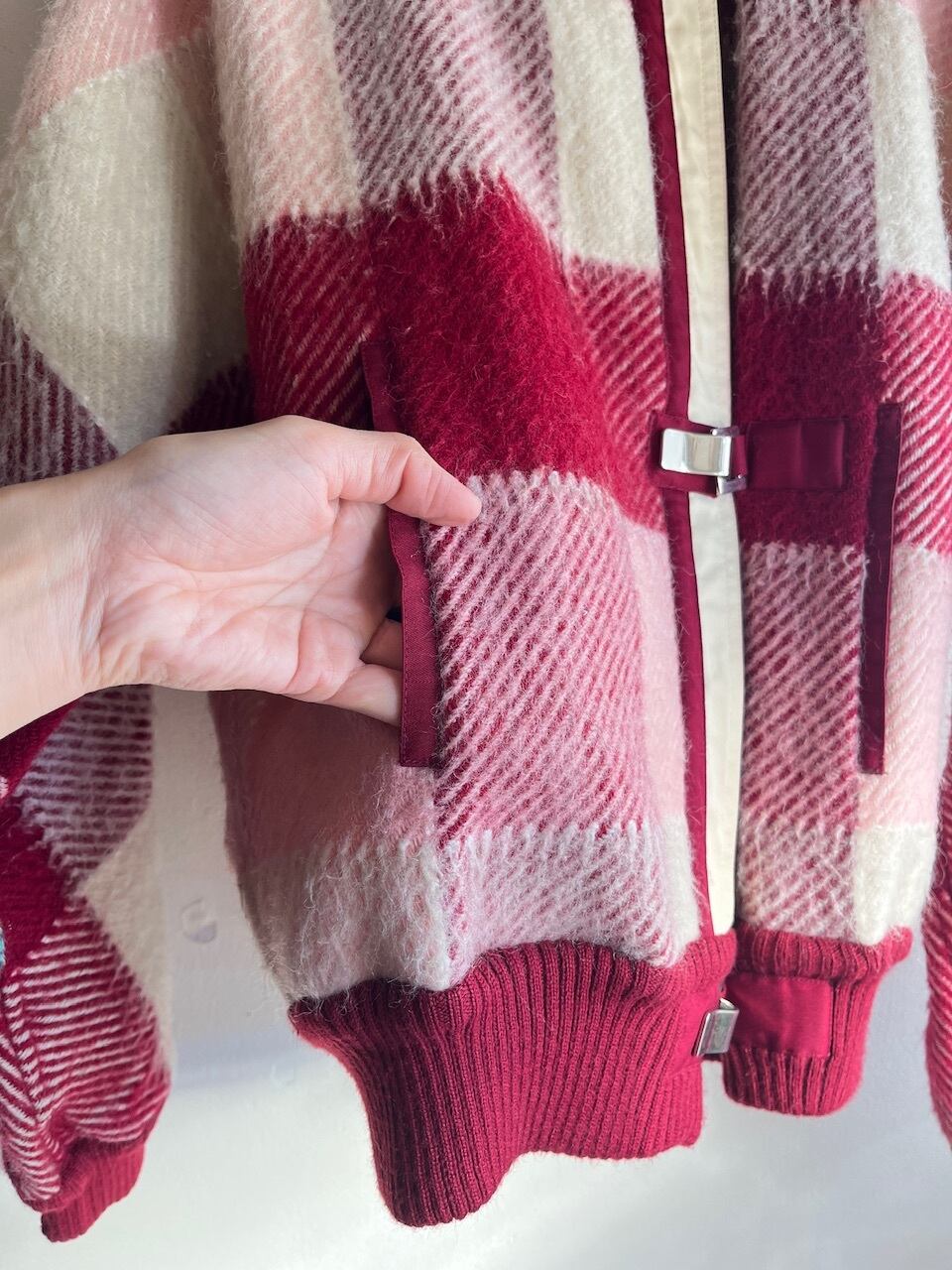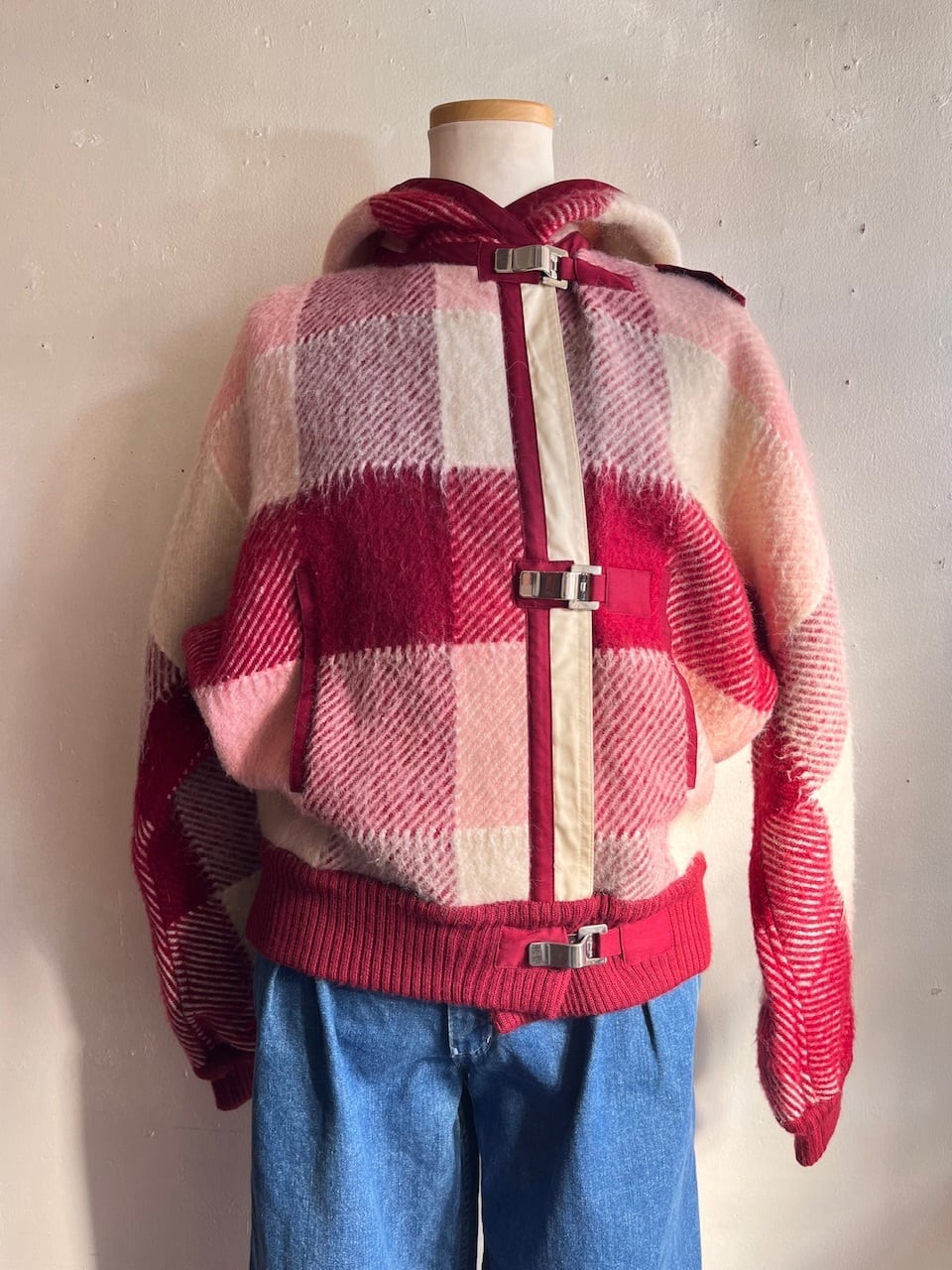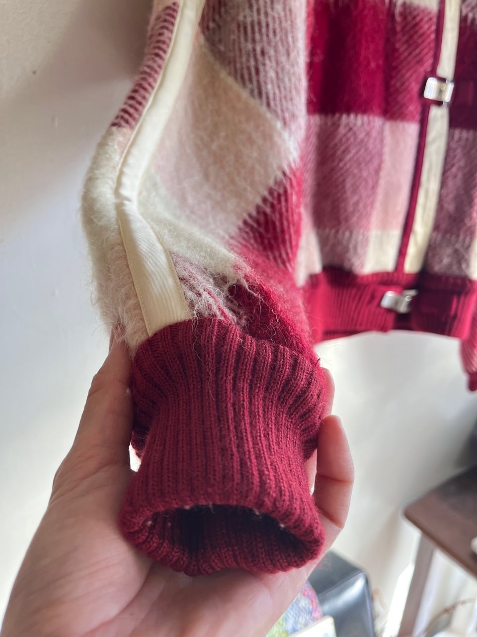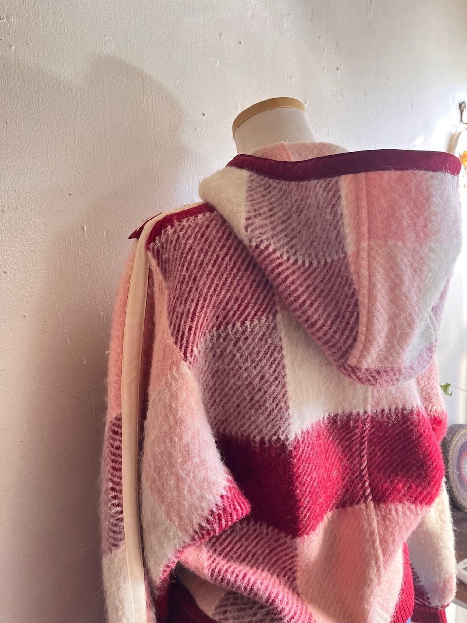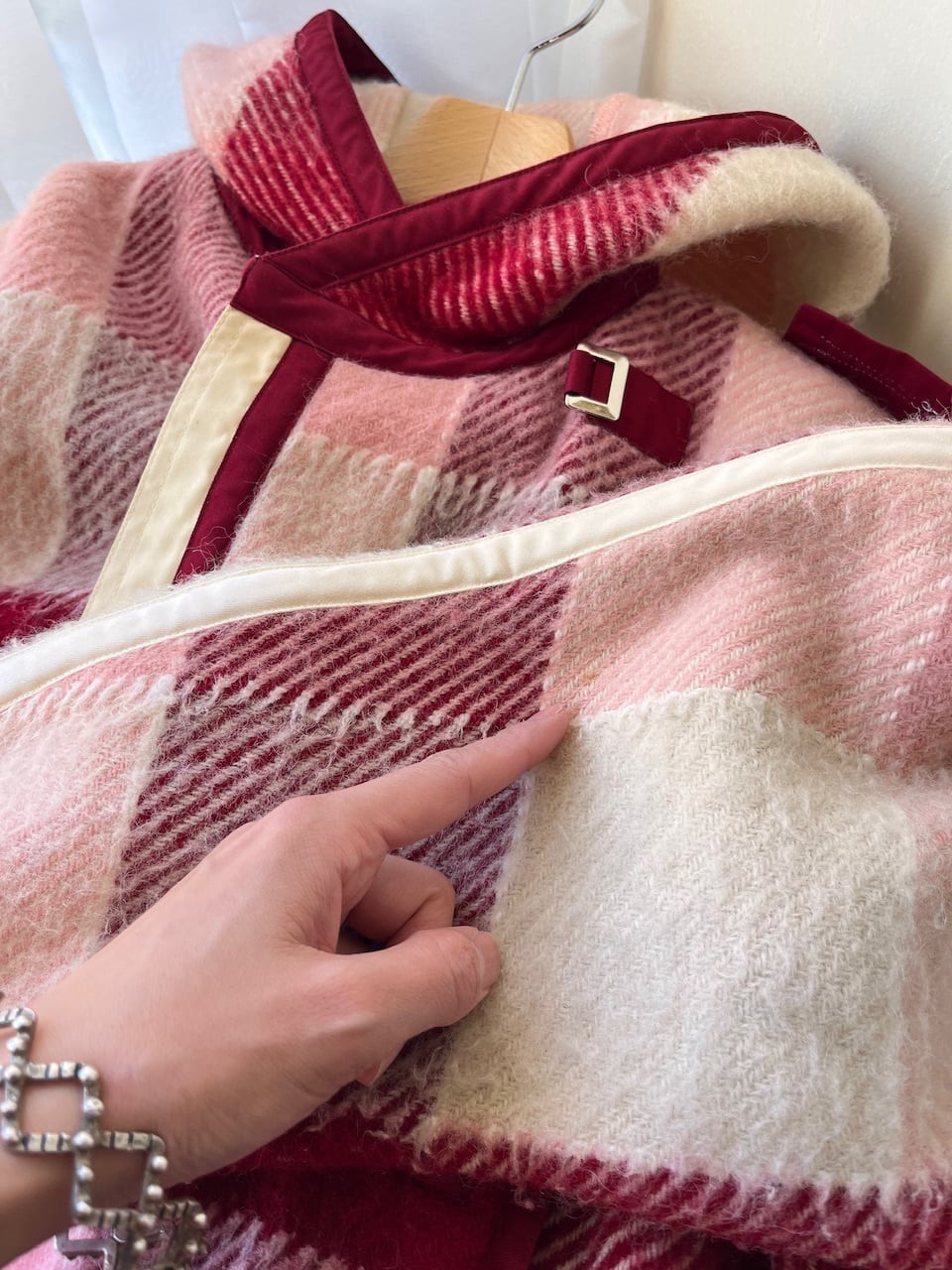ふんわり起毛したチェック柄(ピンク〜ボルドー)が目を惹き、やわらかい雰囲気と上質さを兼ね備えた一着です。