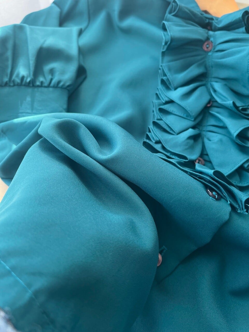 フロントにあしらわれた立体的なフリルと、深みのあるターコイズグリーンが印象的な一枚です。