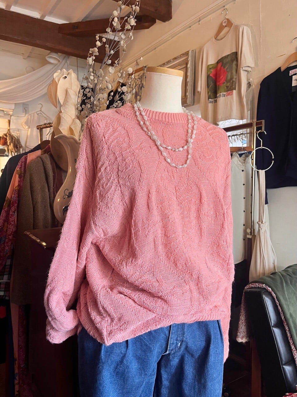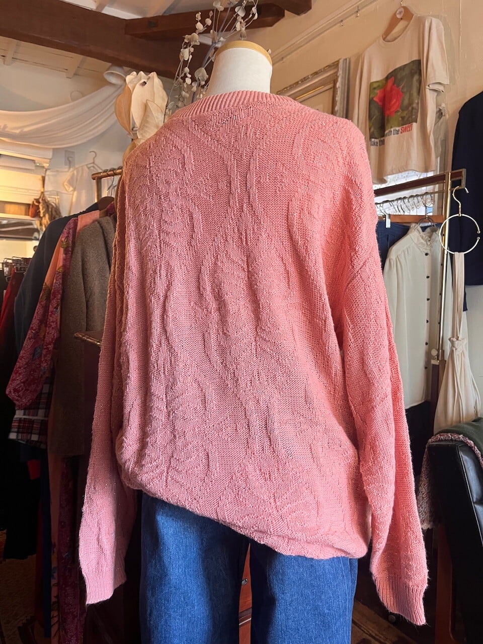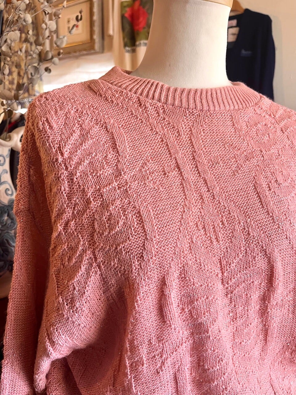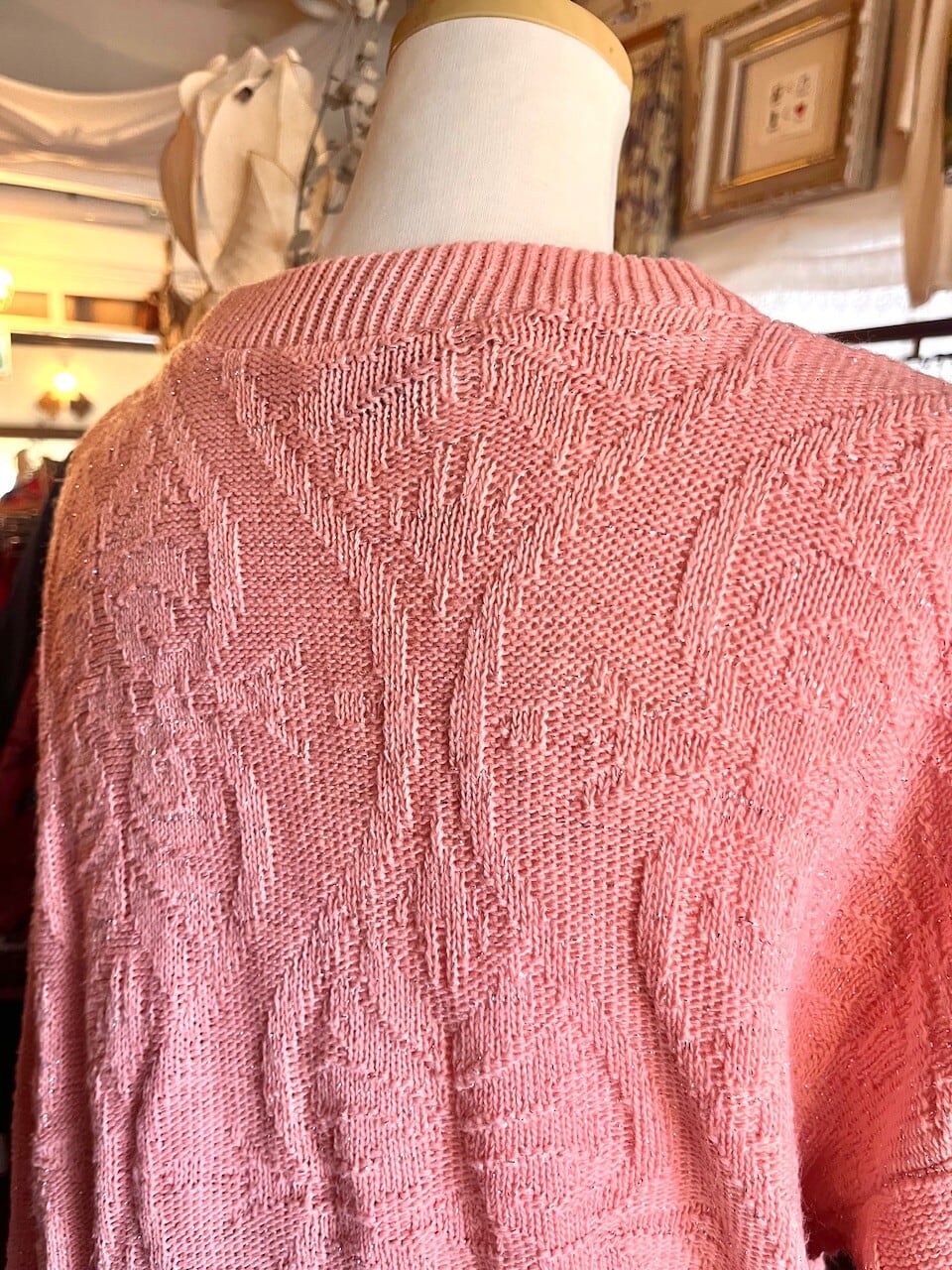 温かみのあるサーモンピンクにシルバーの柔らかなラメが織り込まれた、80〜90年代のUSA製ニット。