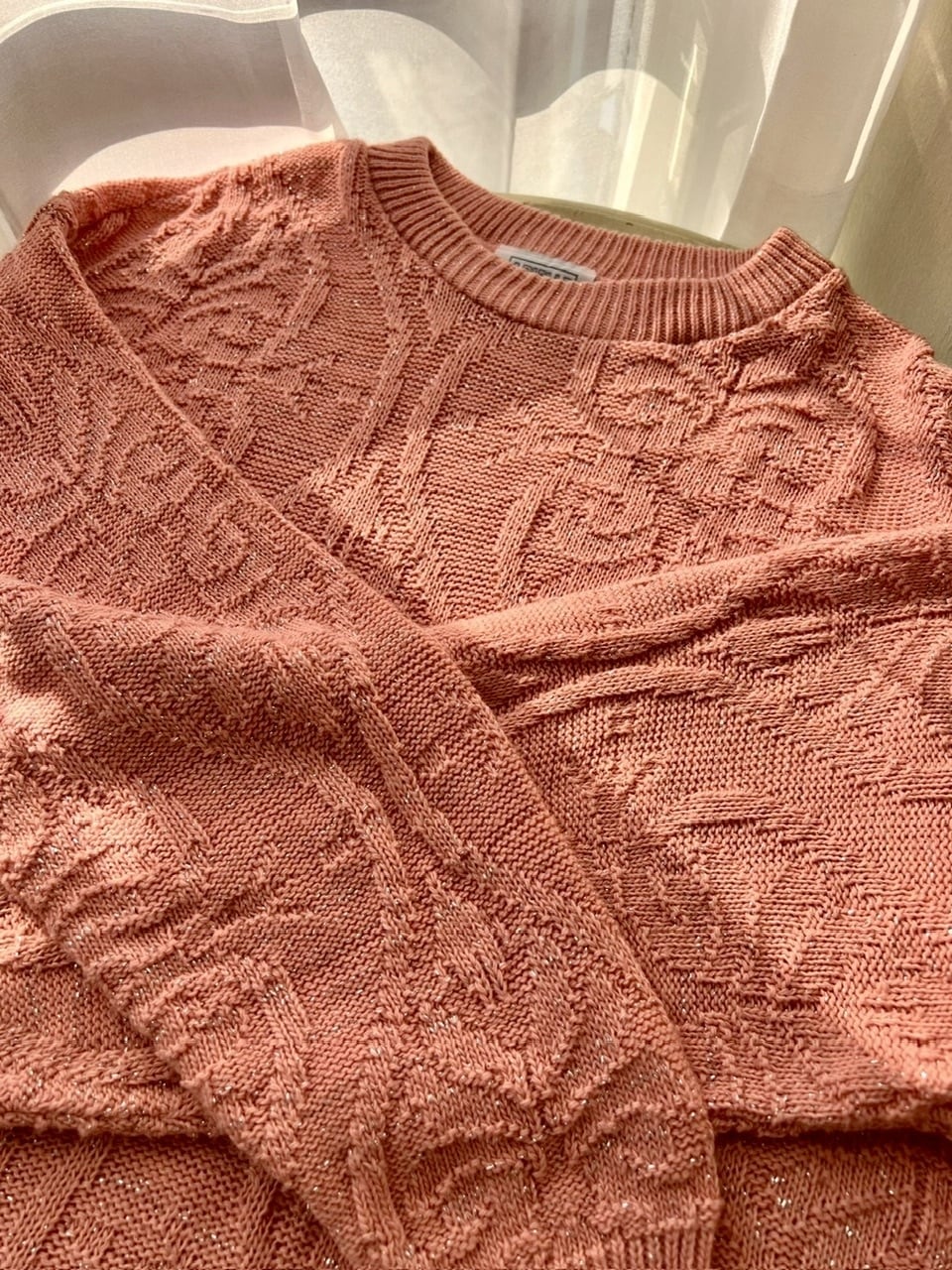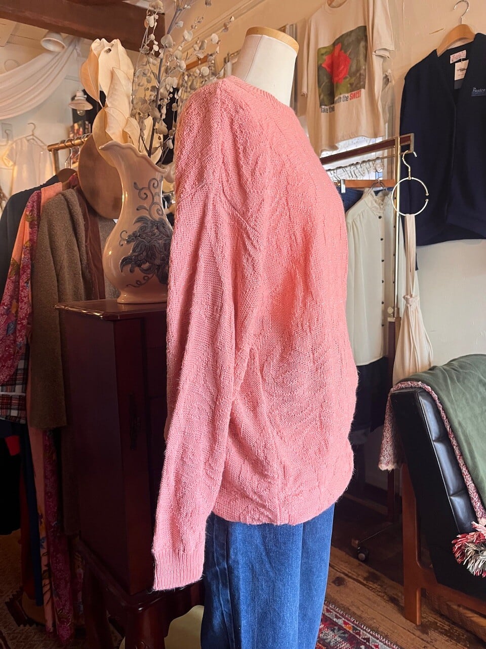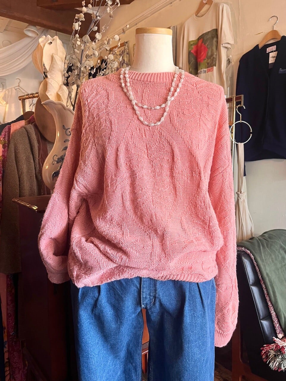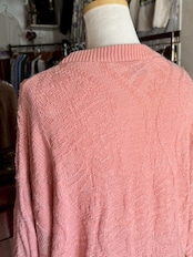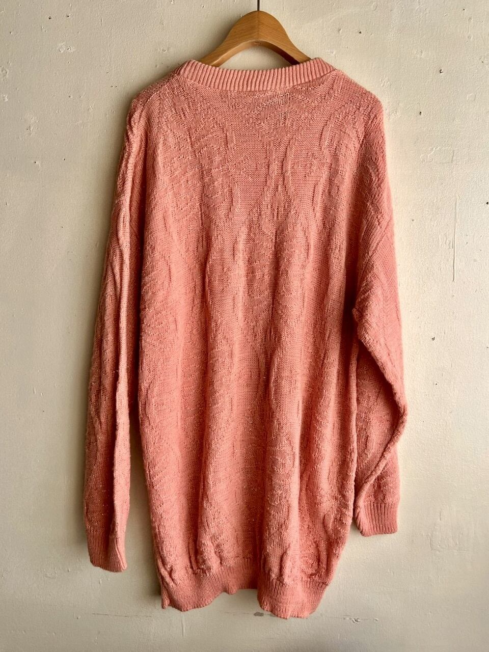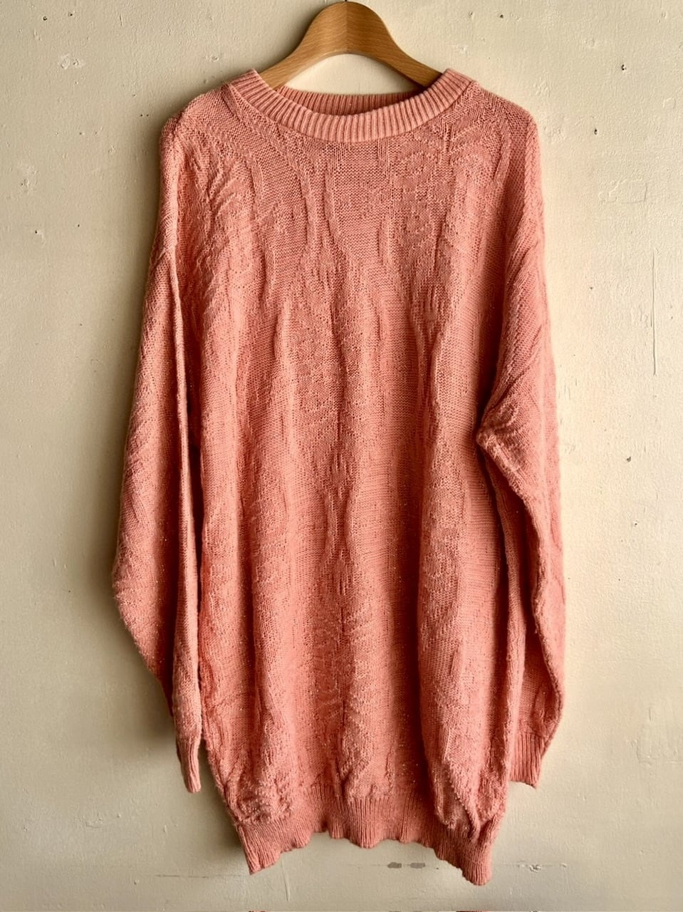 温かみのあるサーモンピンクにシルバーの柔らかなラメが織り込まれた、80〜90年代のUSA製ニット。