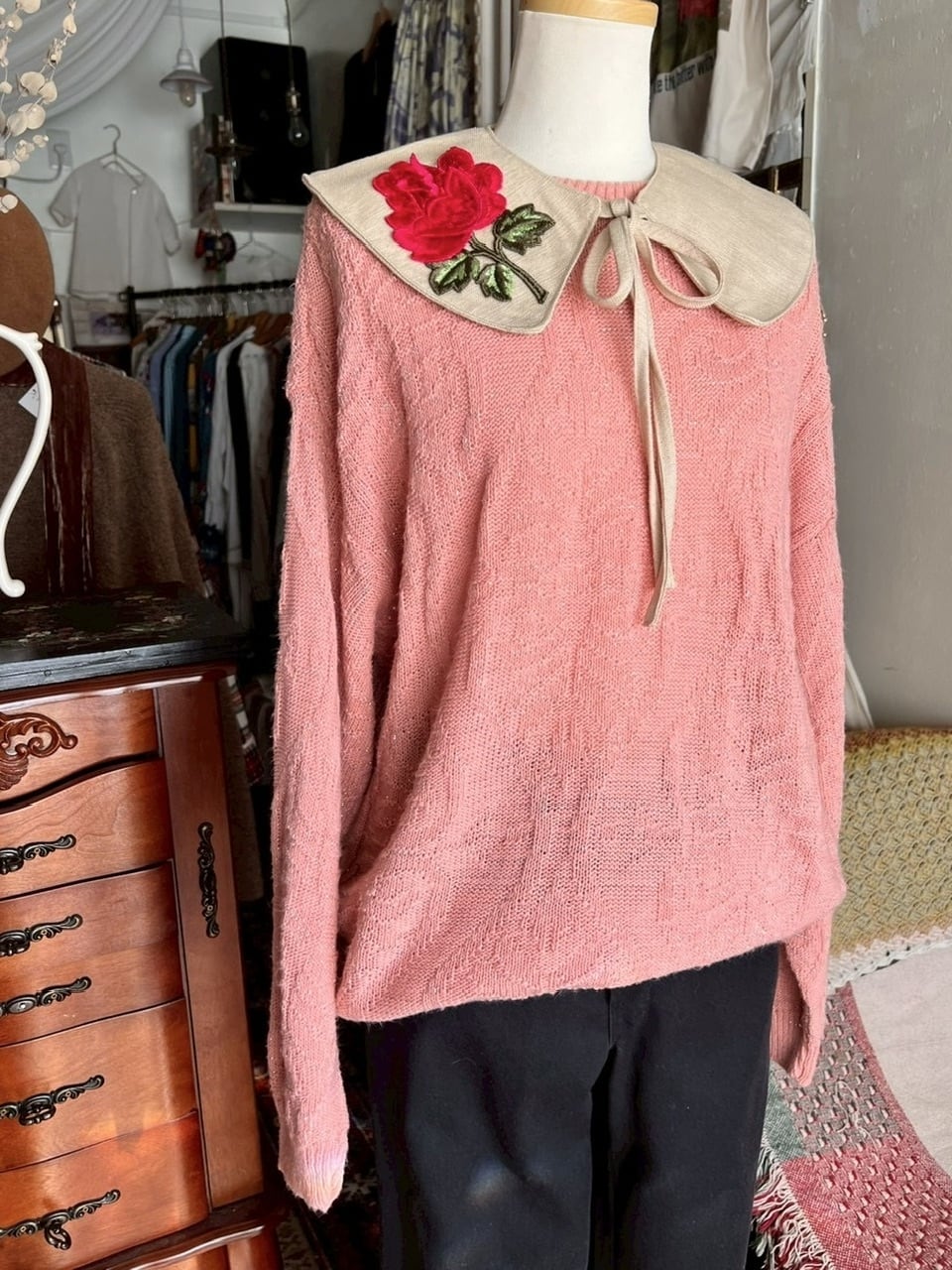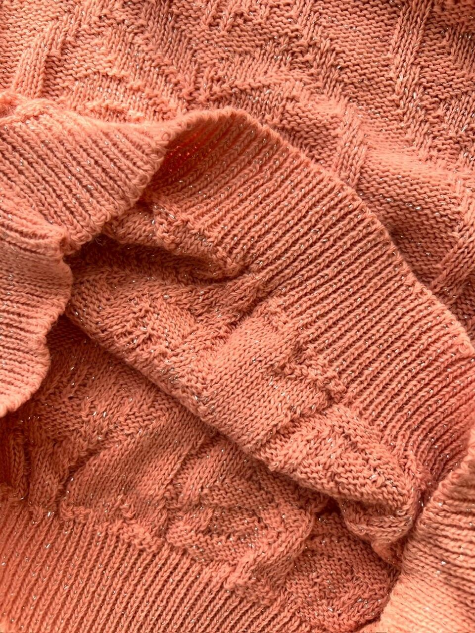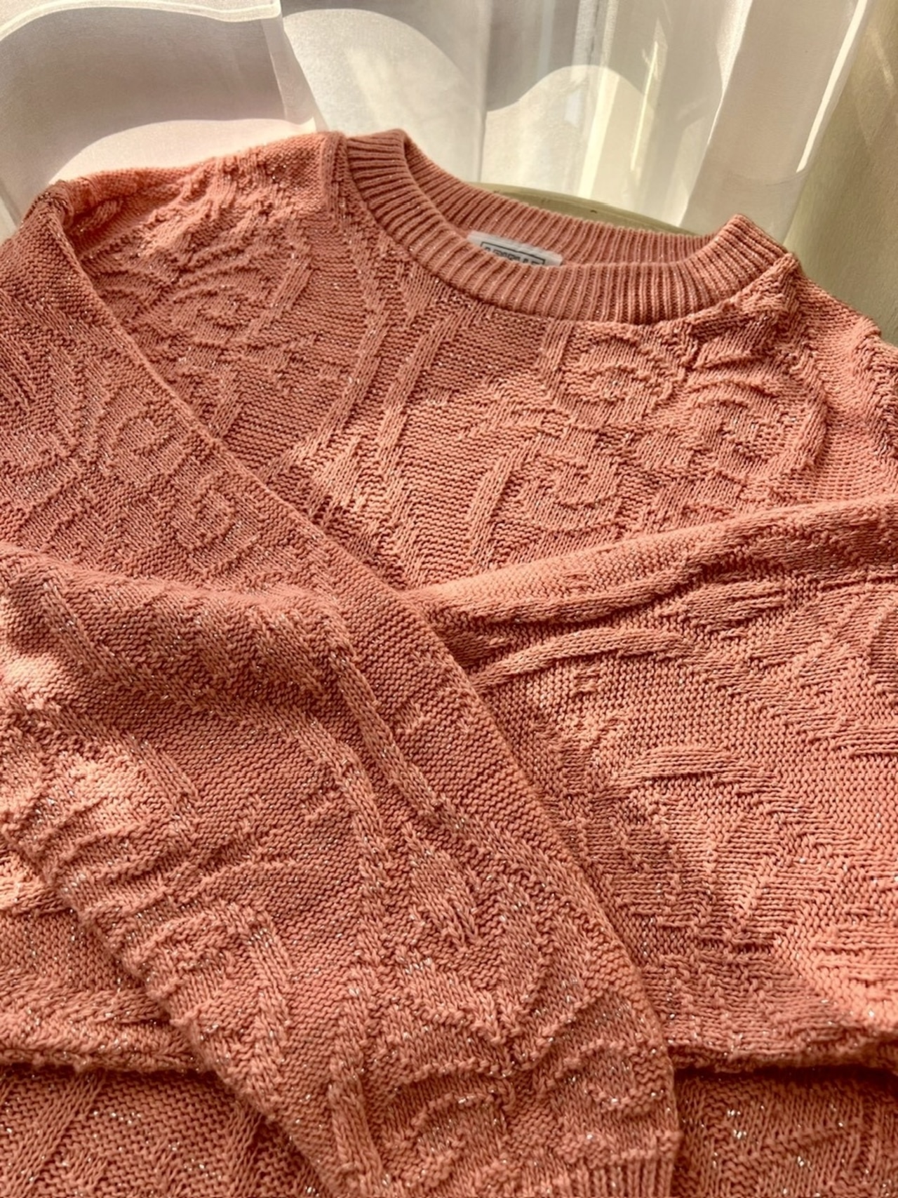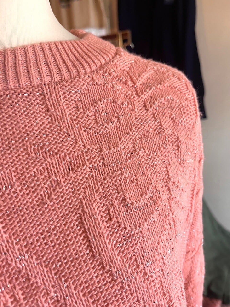 温かみのあるサーモンピンクにシルバーの柔らかなラメが織り込まれた、80〜90年代のUSA製ニット。