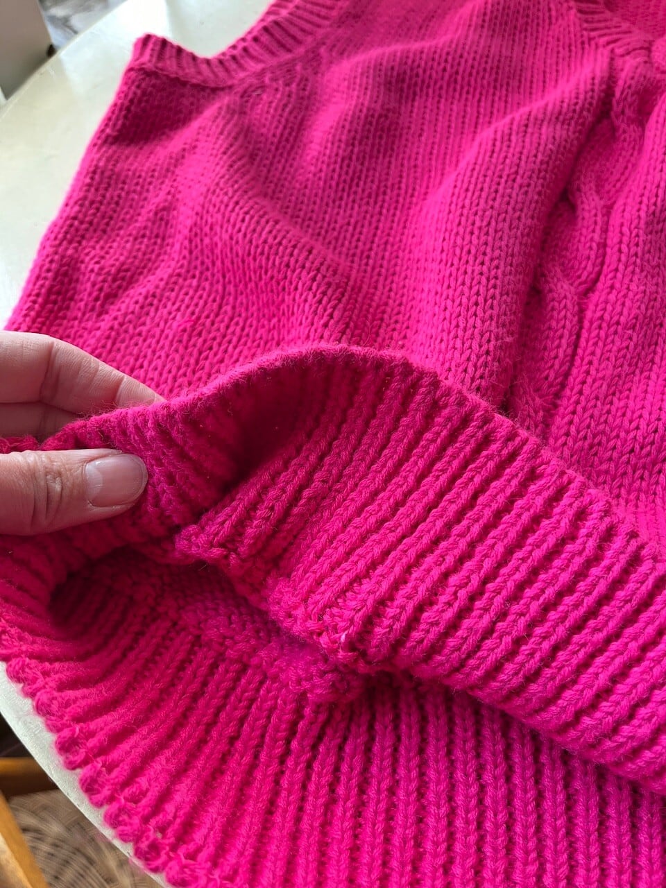 センターに施されたケーブル編みが立体感あり、シンプルながらも表情豊かな一枚です。