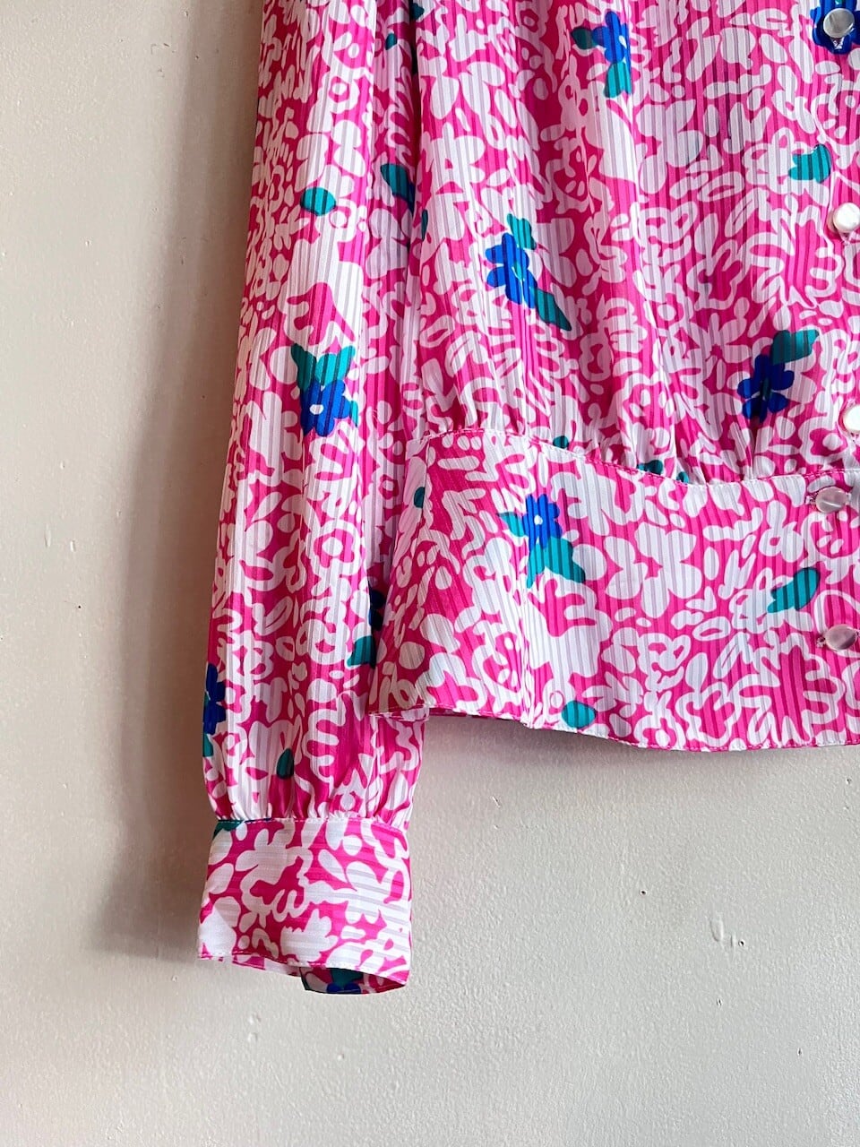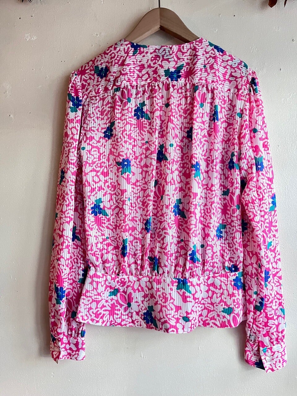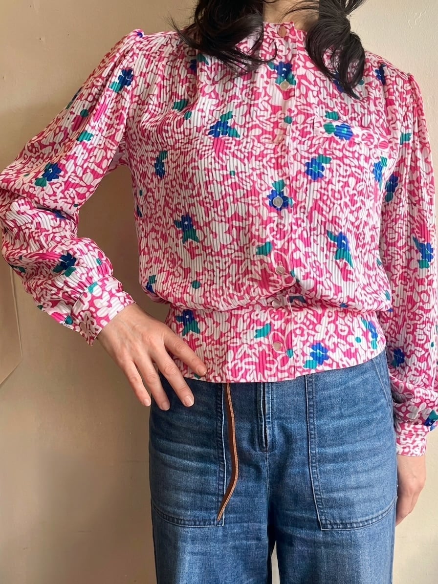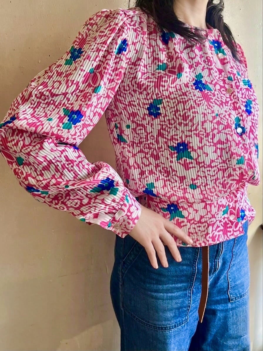 80s USA Neon Pink Floral Blouse/レトロポップなピンク&ブルーのお花柄デザインブラウス
