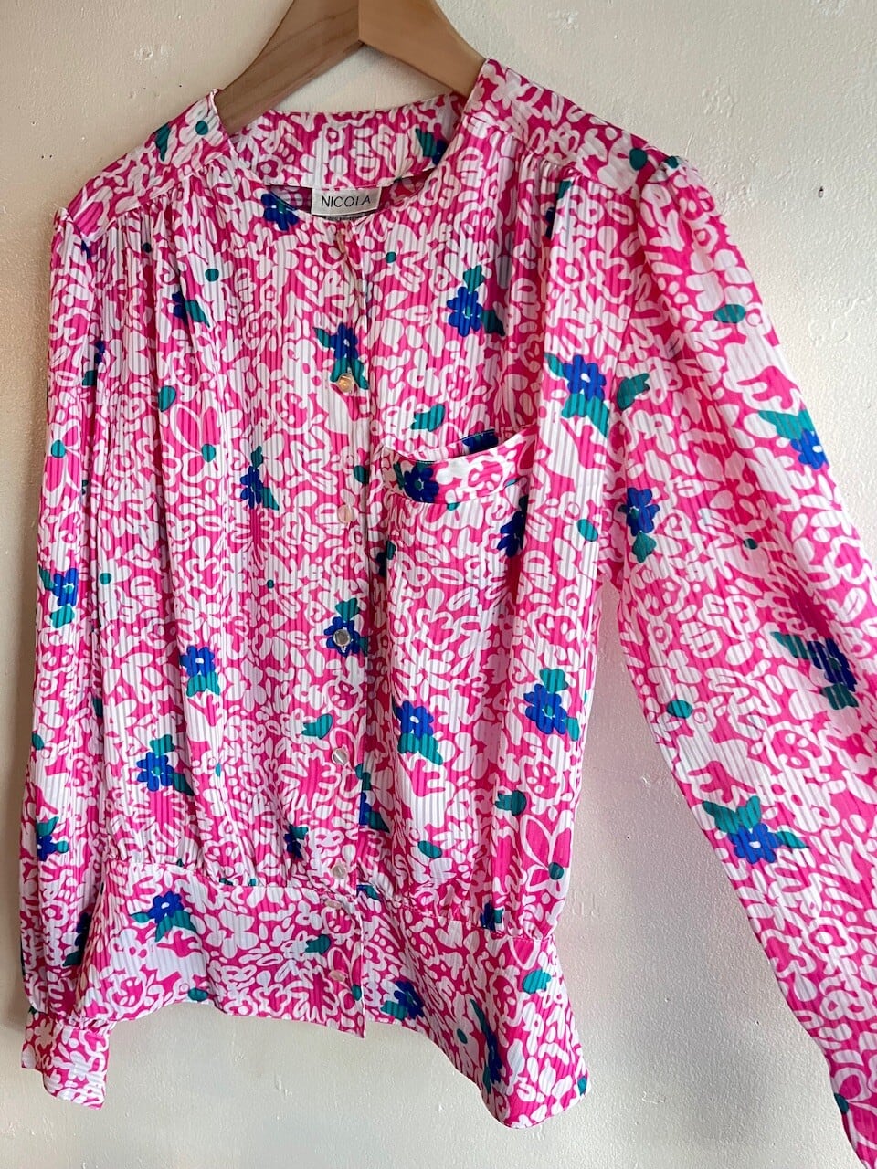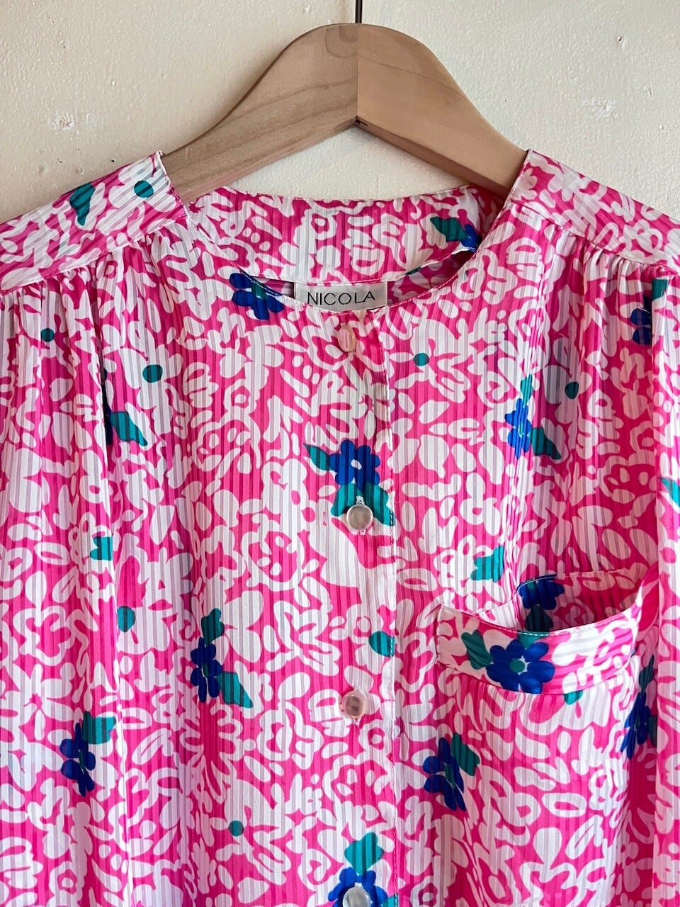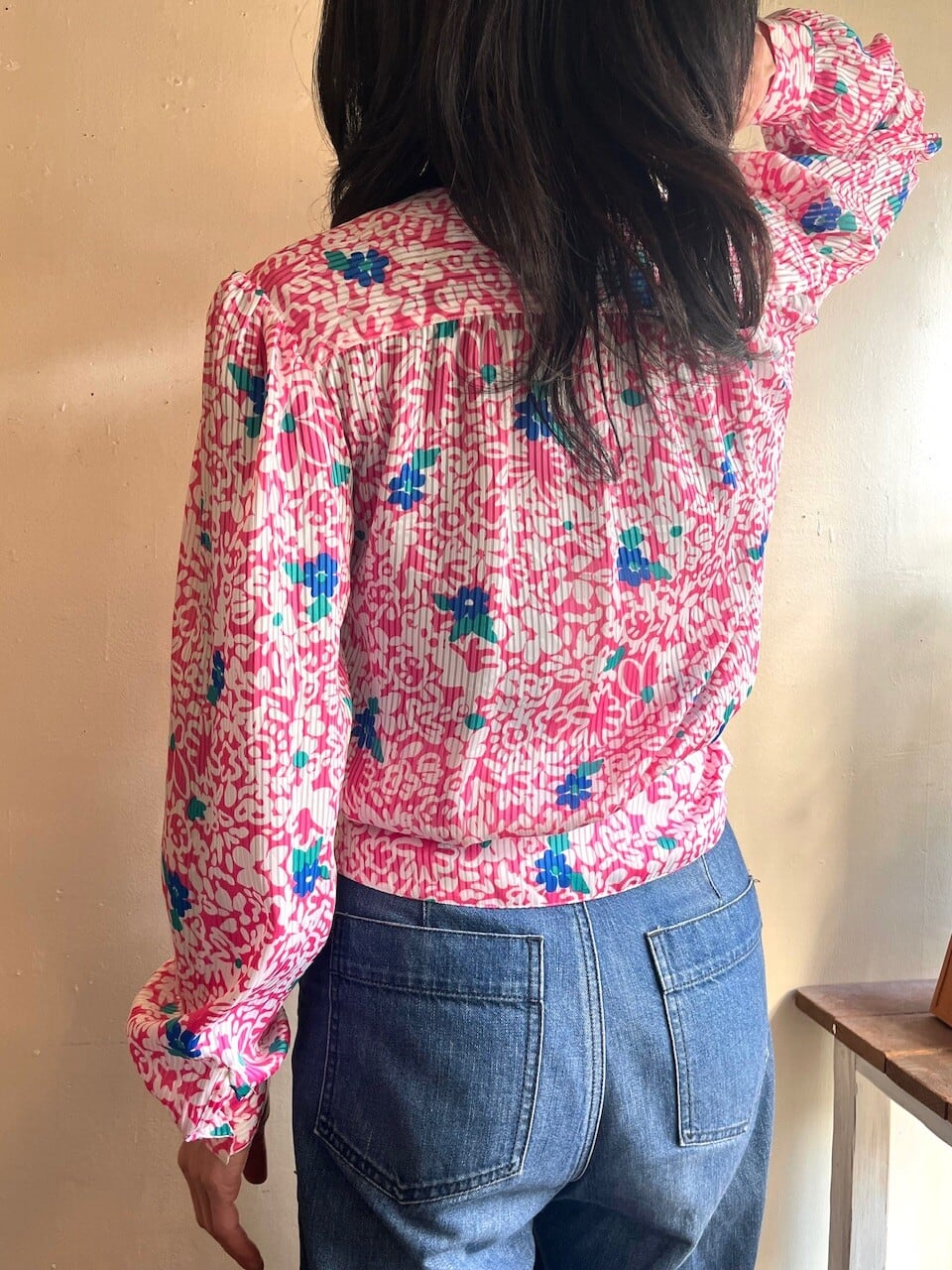 80s USA Neon Pink Floral Blouse/レトロポップなピンク&ブルーのお花柄デザインブラウス