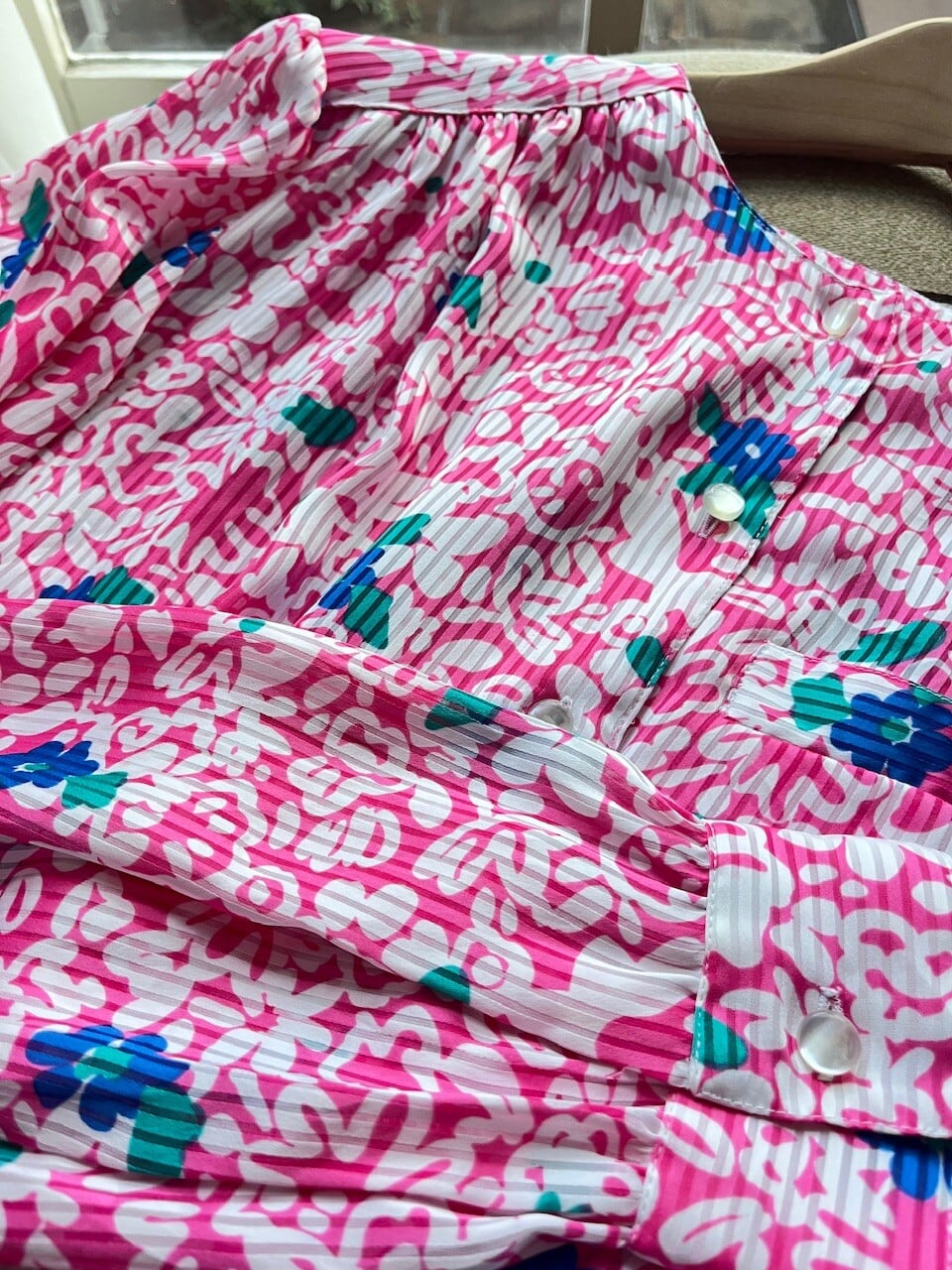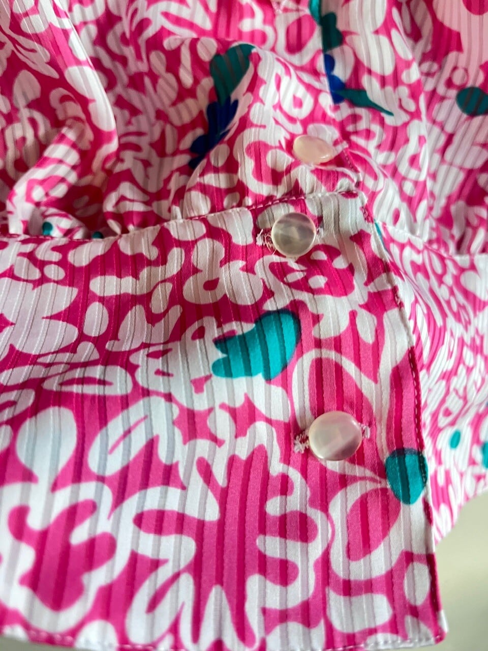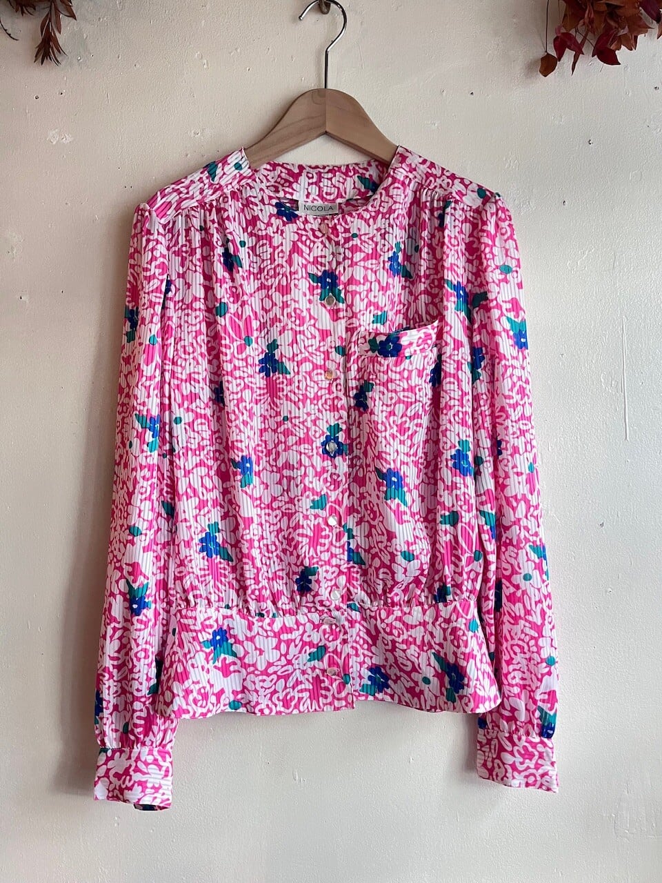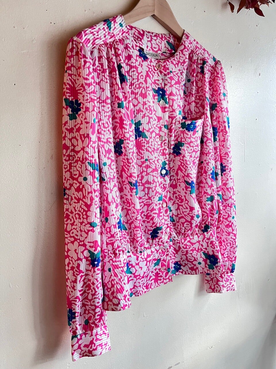 80s USA Neon Pink Floral Blouse/レトロポップなピンク&ブルーのお花柄デザインブラウス