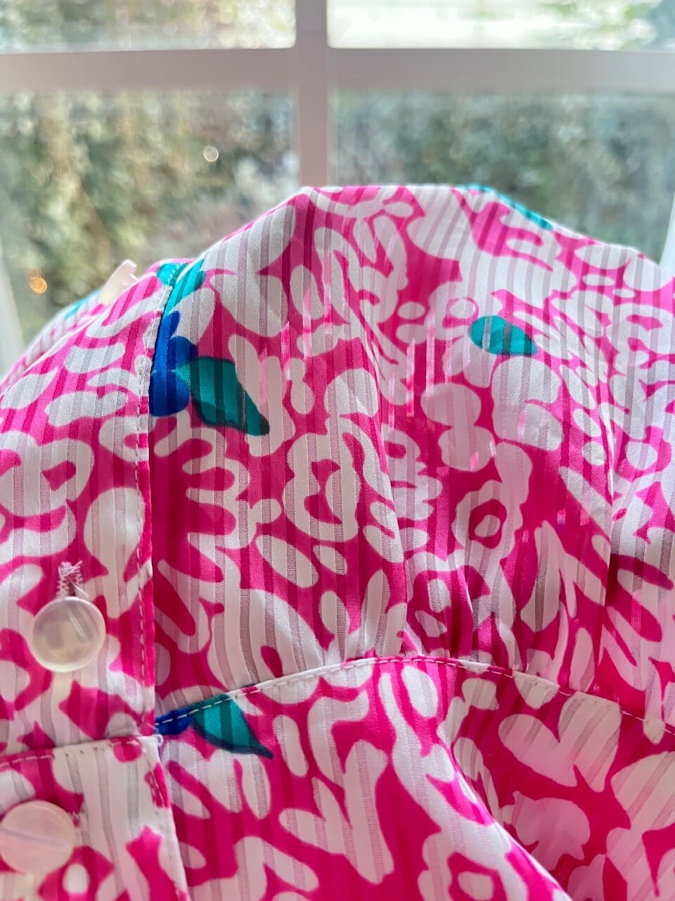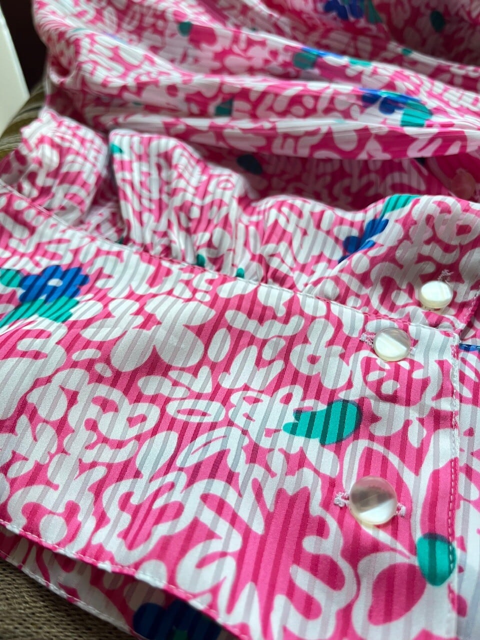 ピンクに透けるシャドーストライプの入った生地は軽やかで透明感があり、ブルーのレトロなお花も映えます。