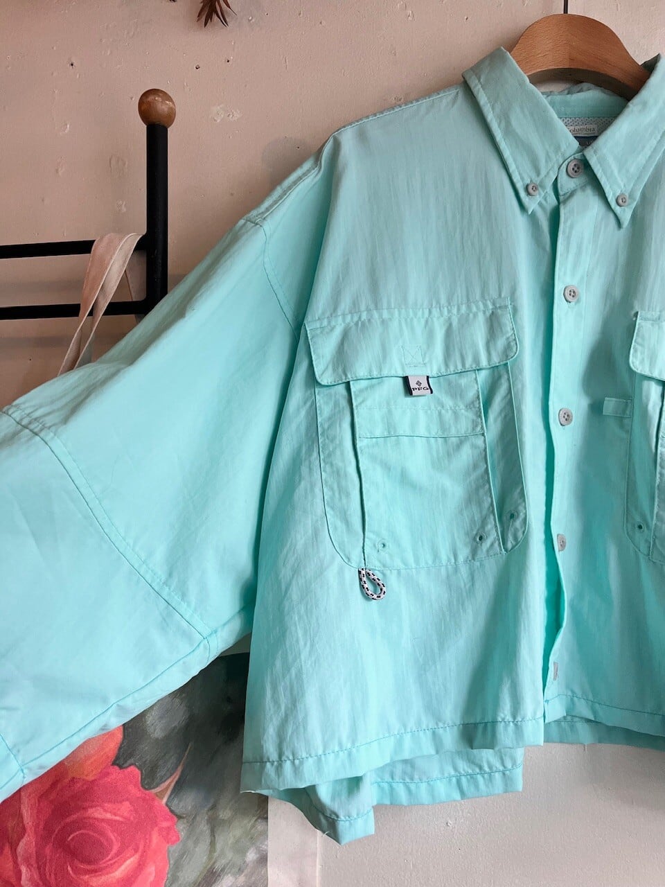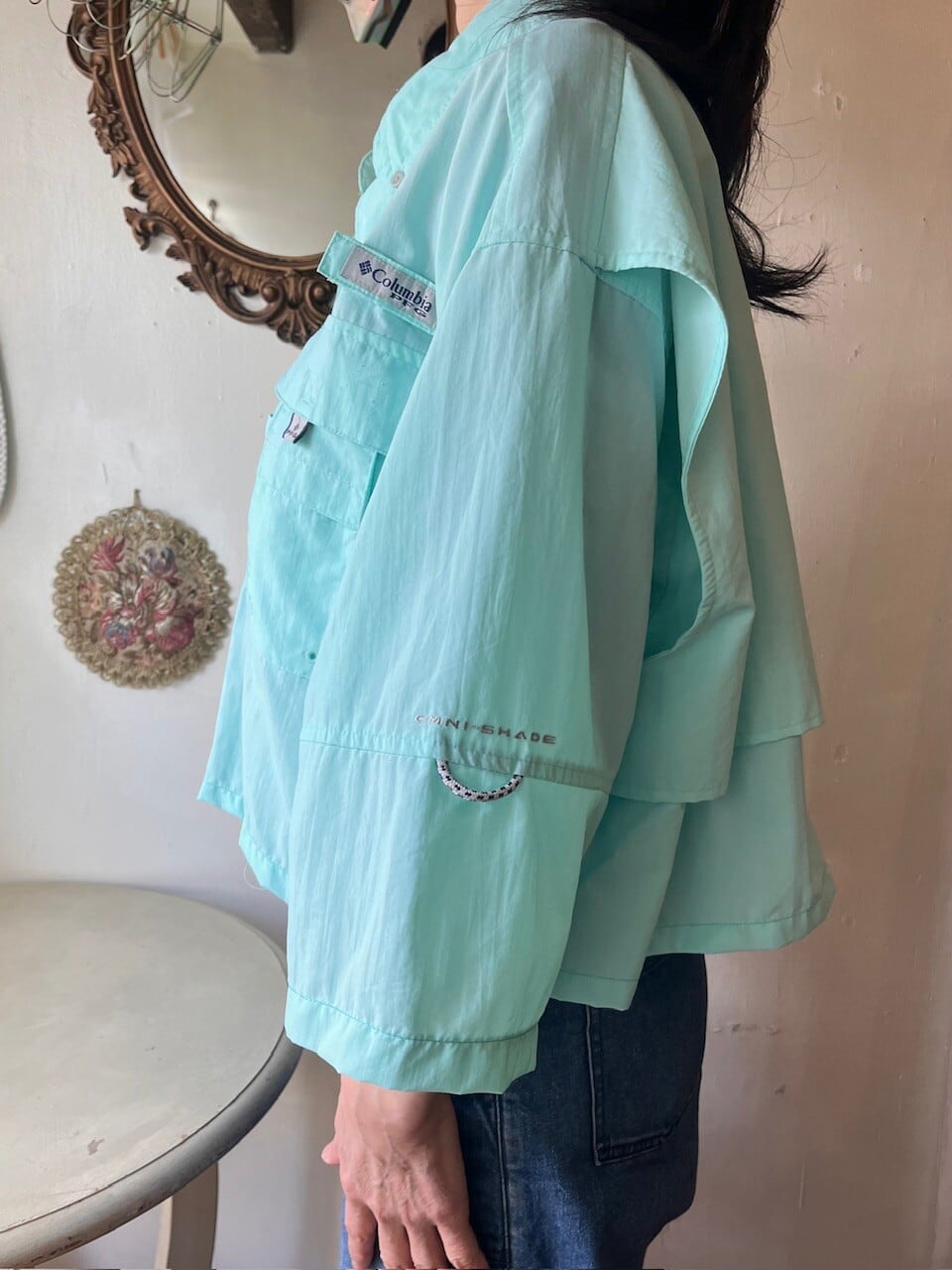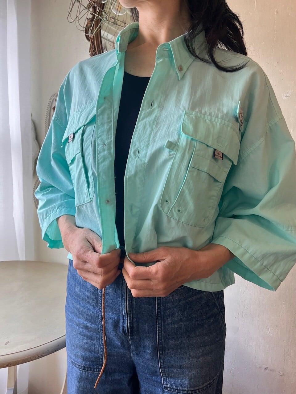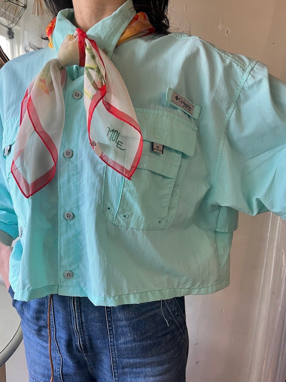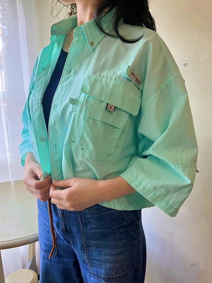 Columbia PFGのきれいなミントグリーンのフィッシングシャツをカットオフリメイク。