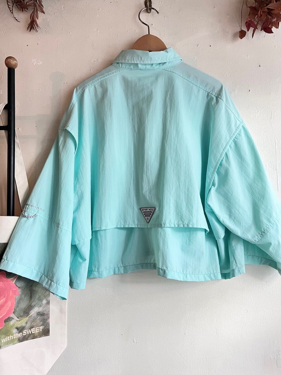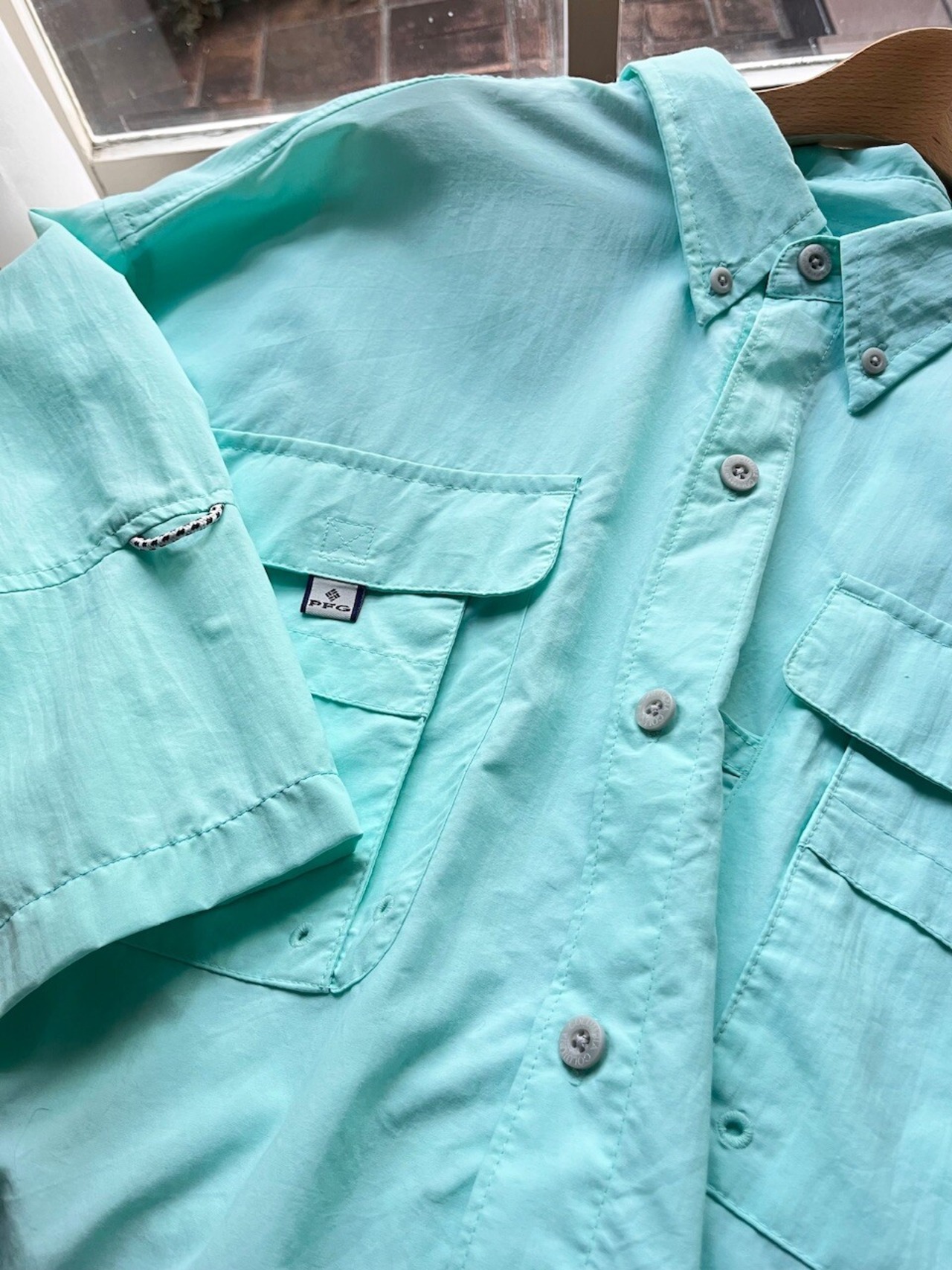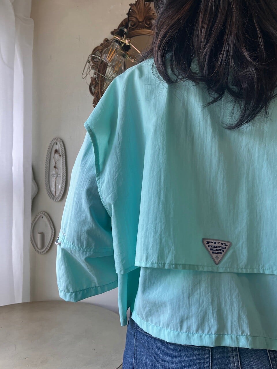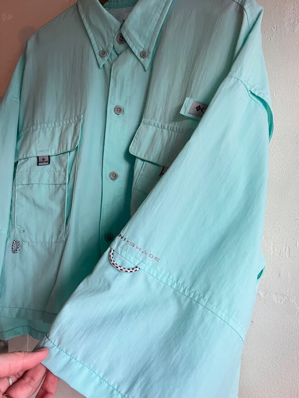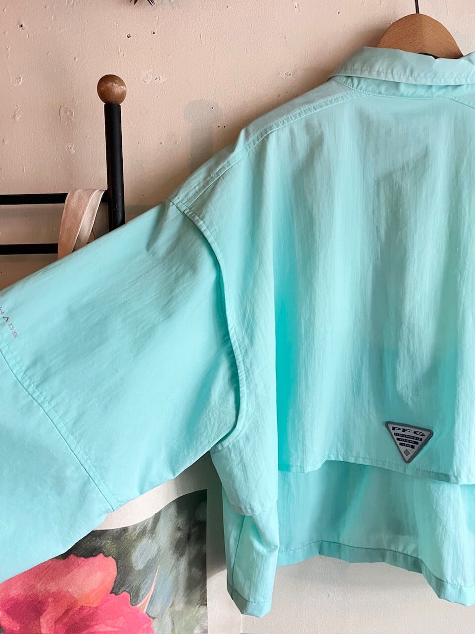 Columbia PFGのきれいなミントグリーンのフィッシングシャツをカットオフリメイク。
