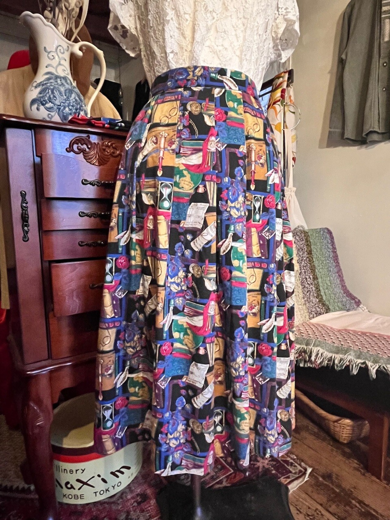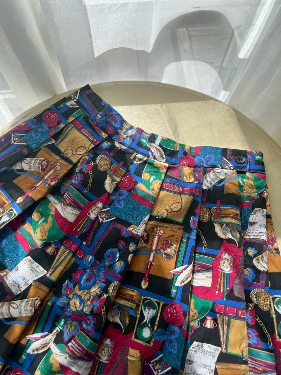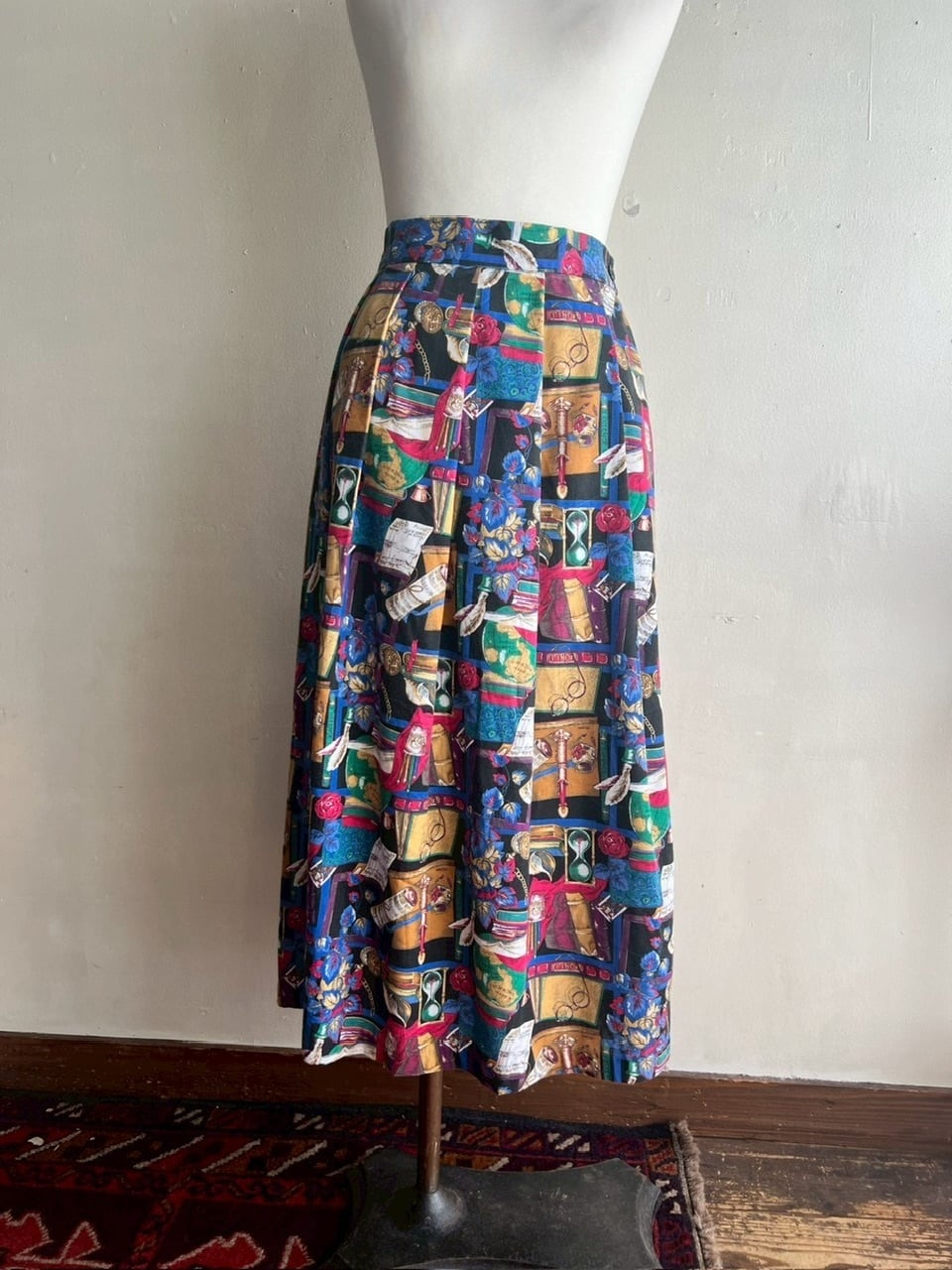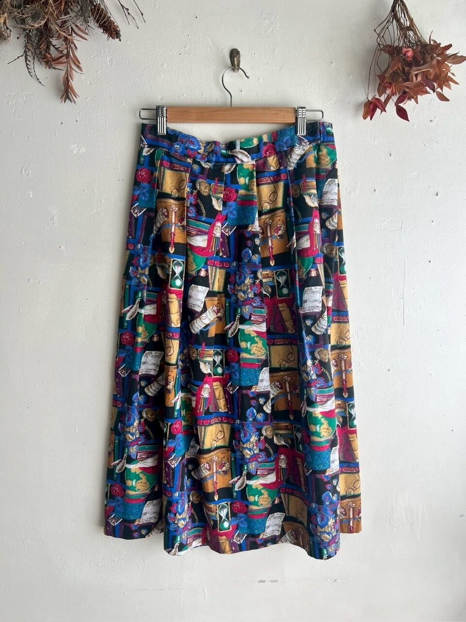 アンティークの本、砂時計、羽ペン、眼鏡、地球儀など、まるで古い書斎を詰め込んだようなプリントが楽しいスカート。