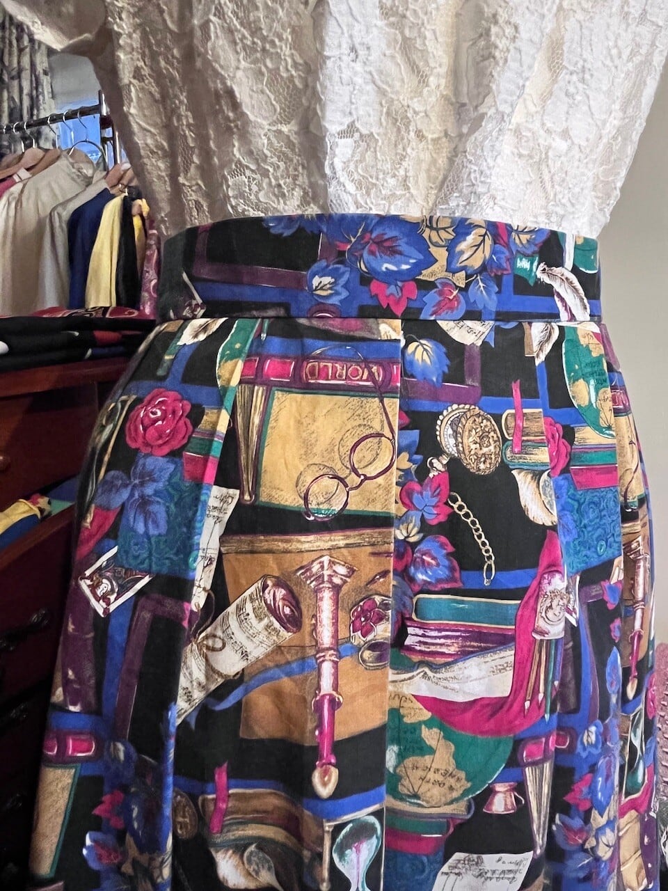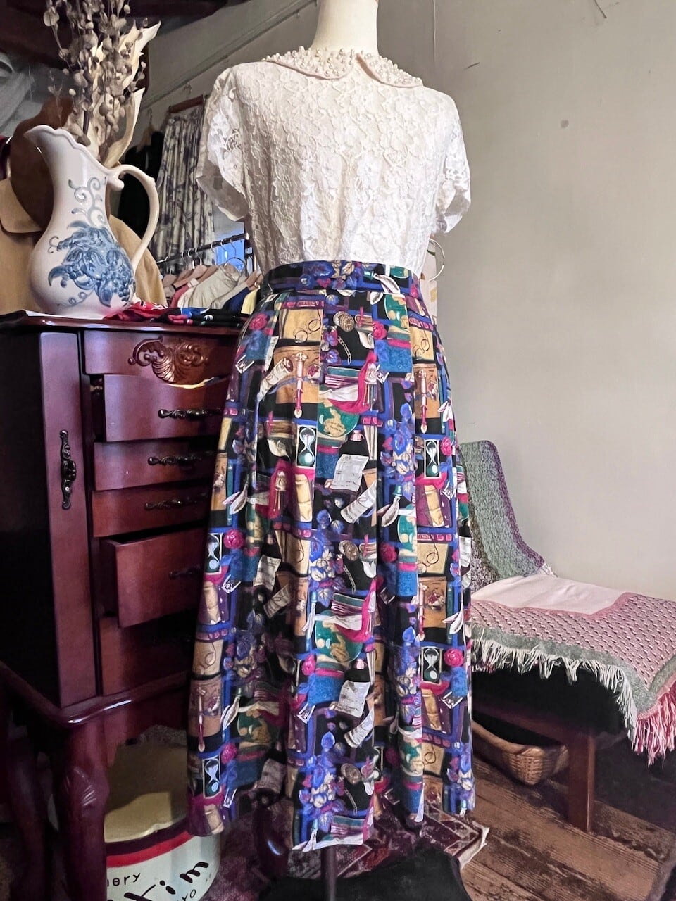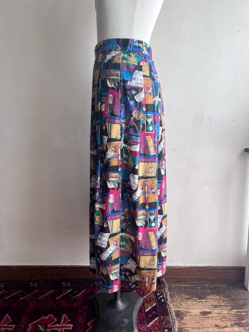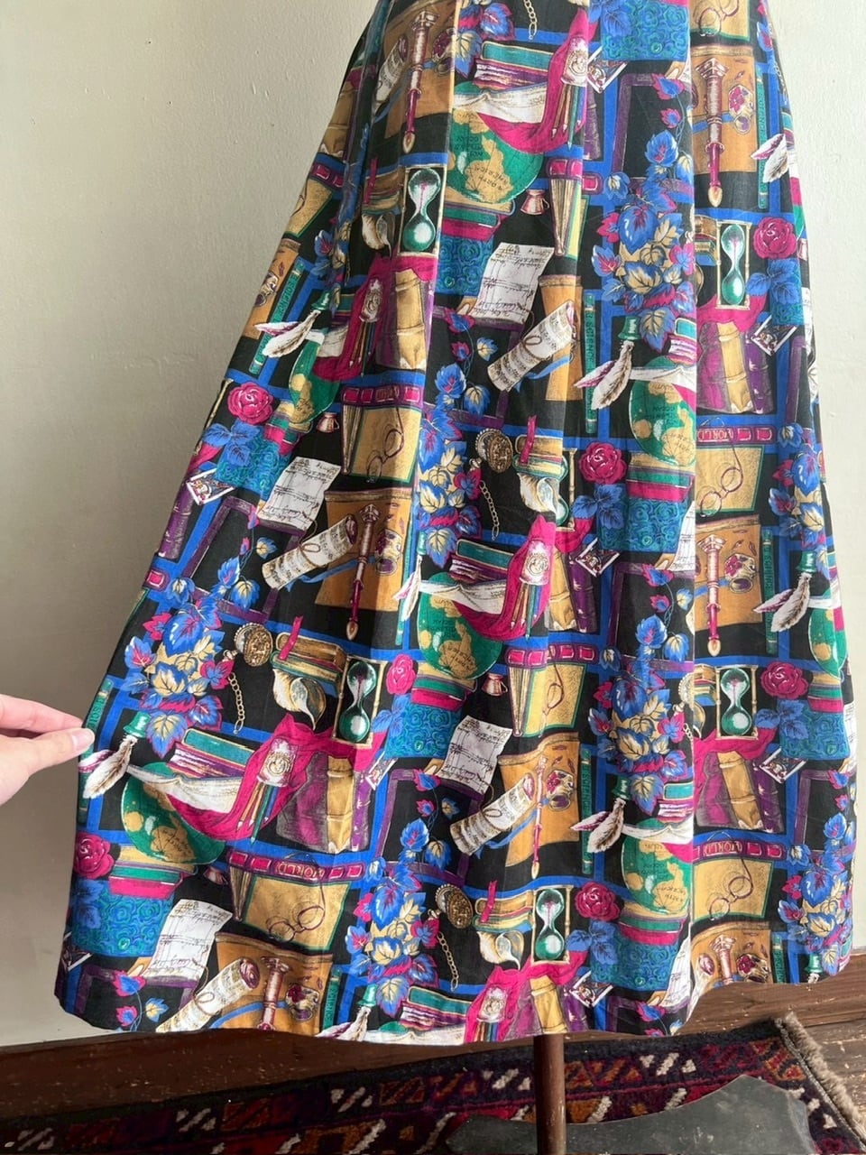アンティークの本、砂時計、羽ペン、眼鏡、地球儀など、まるで古い書斎を詰め込んだようなプリントが楽しいスカート。