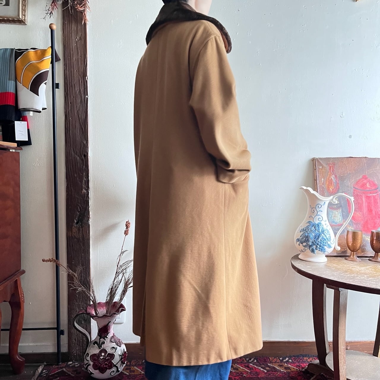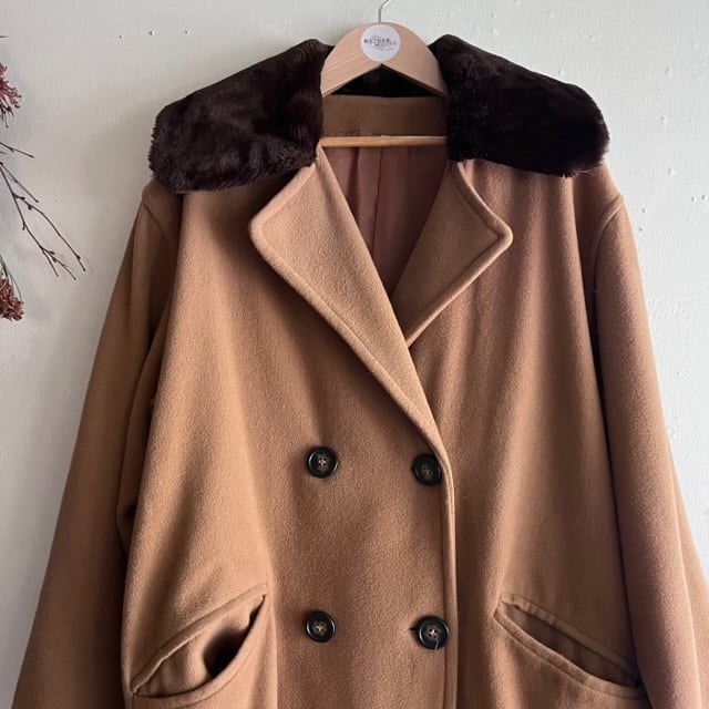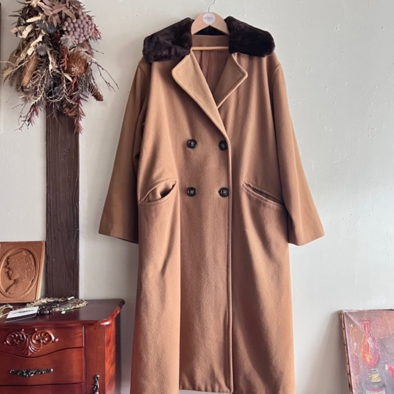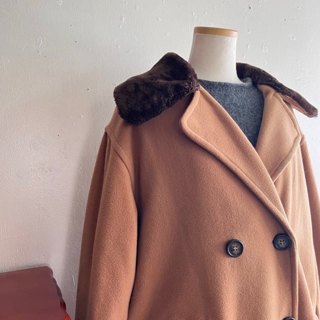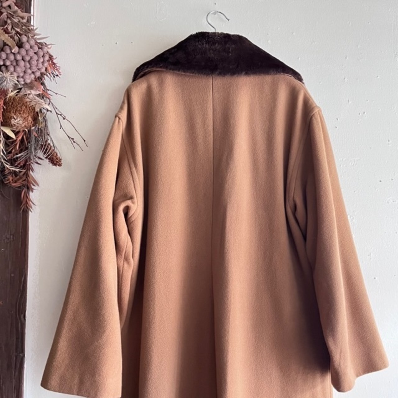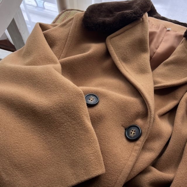落ち着いた濃いめのベージュにダークブラウンのボアがついていて、ハンサムな襟の形が強調され大変かっこいいです。