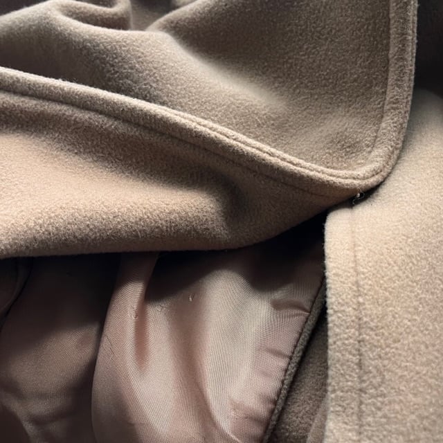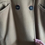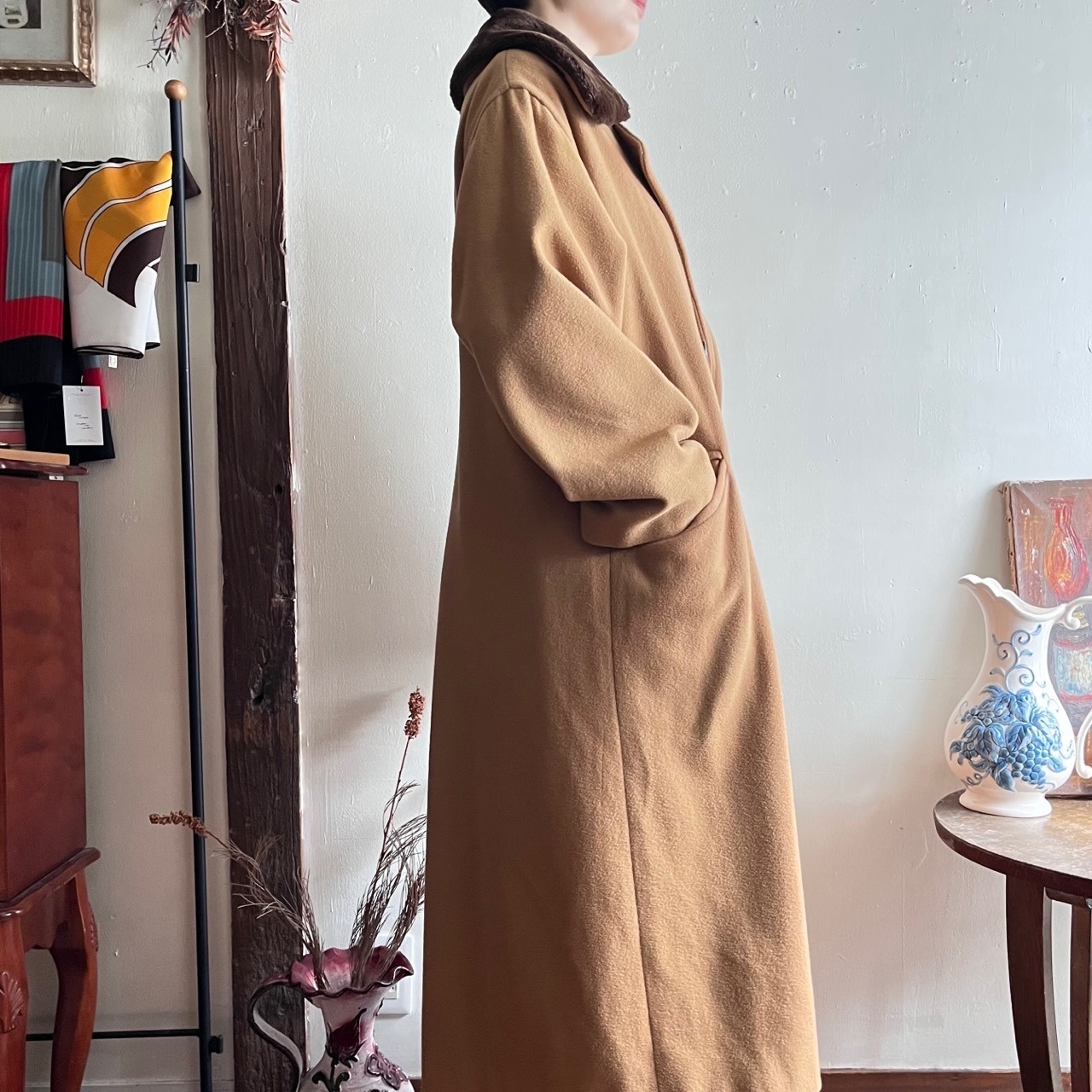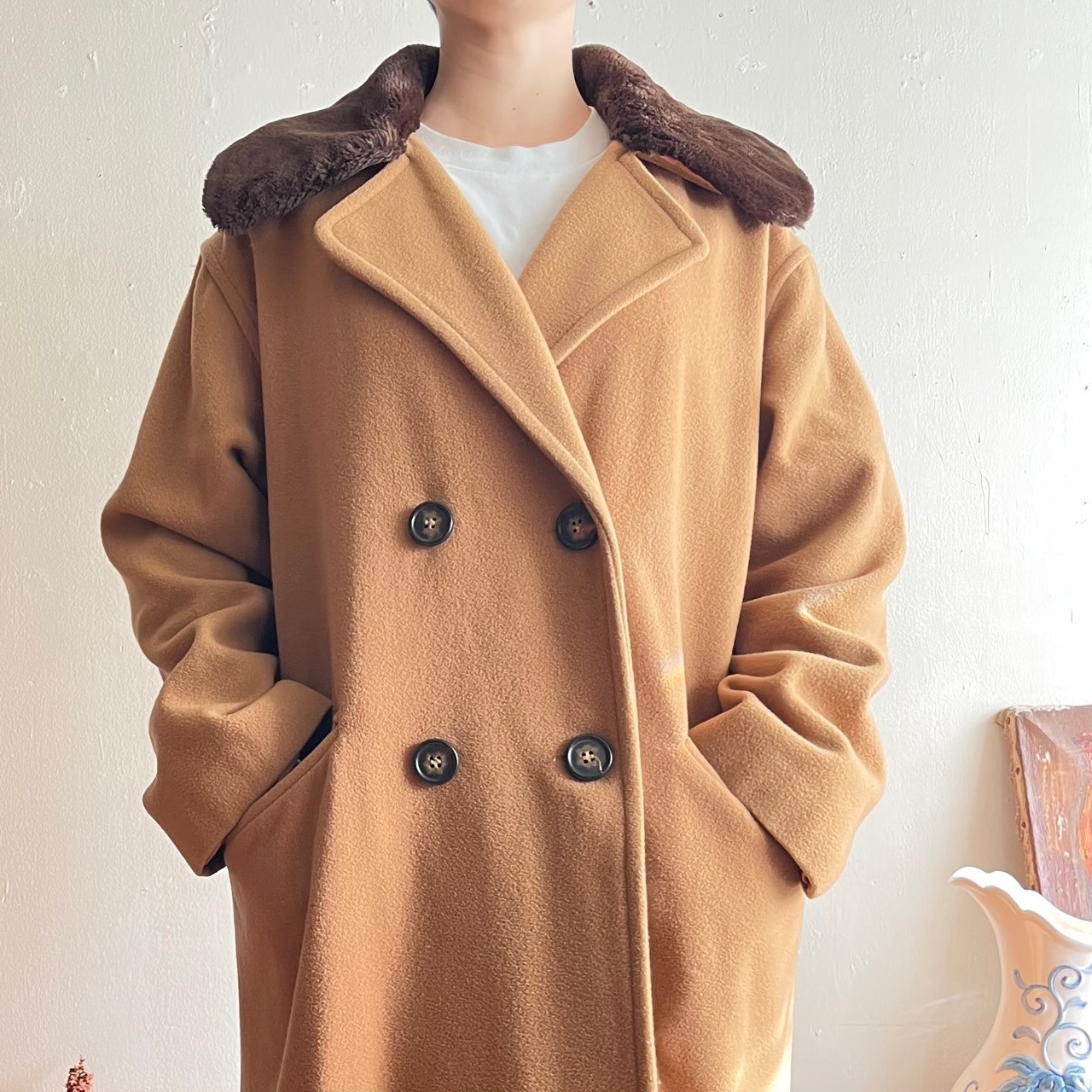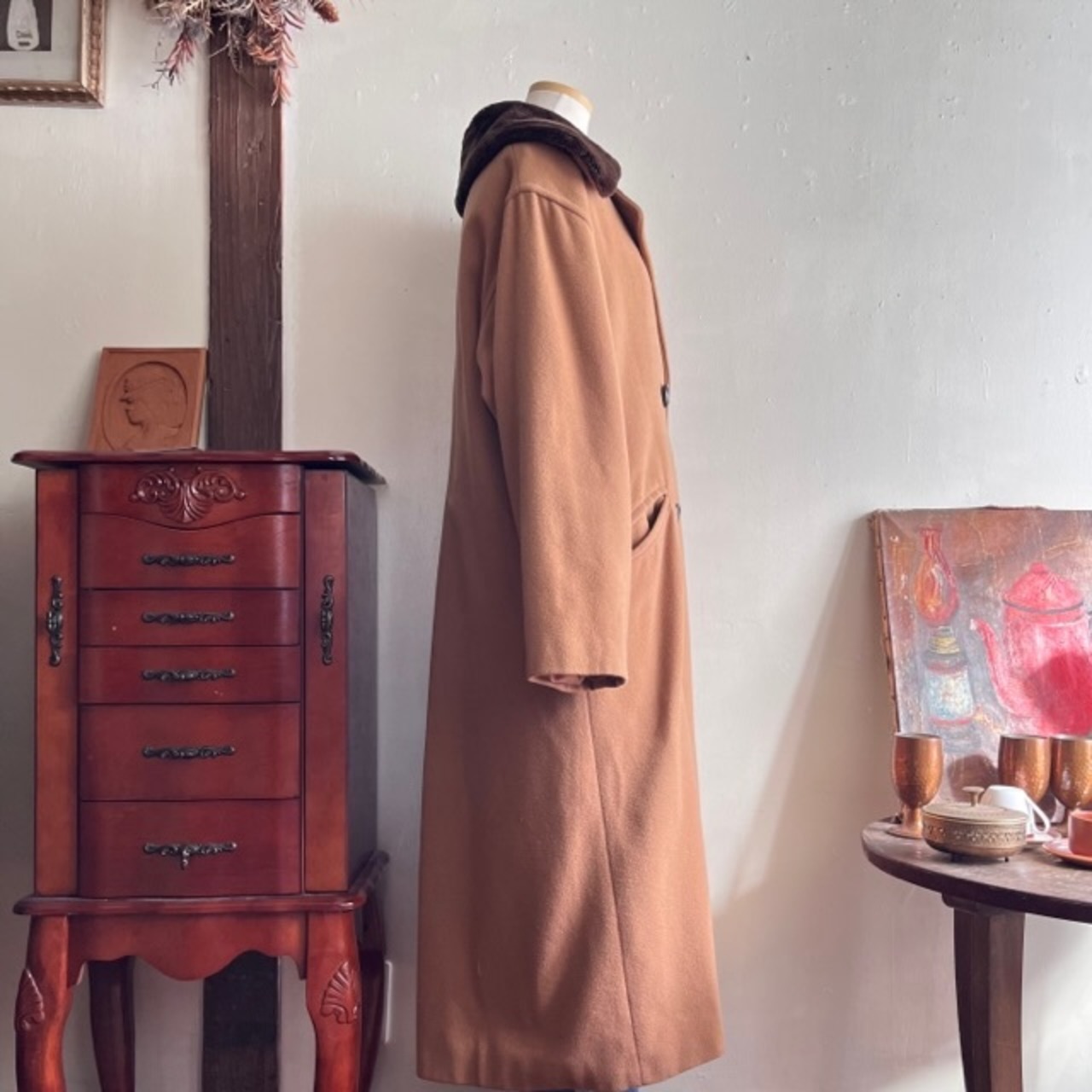 落ち着いた濃いめのベージュにダークブラウンのボアがついていて、ハンサムな襟の形が強調され大変かっこいいです。