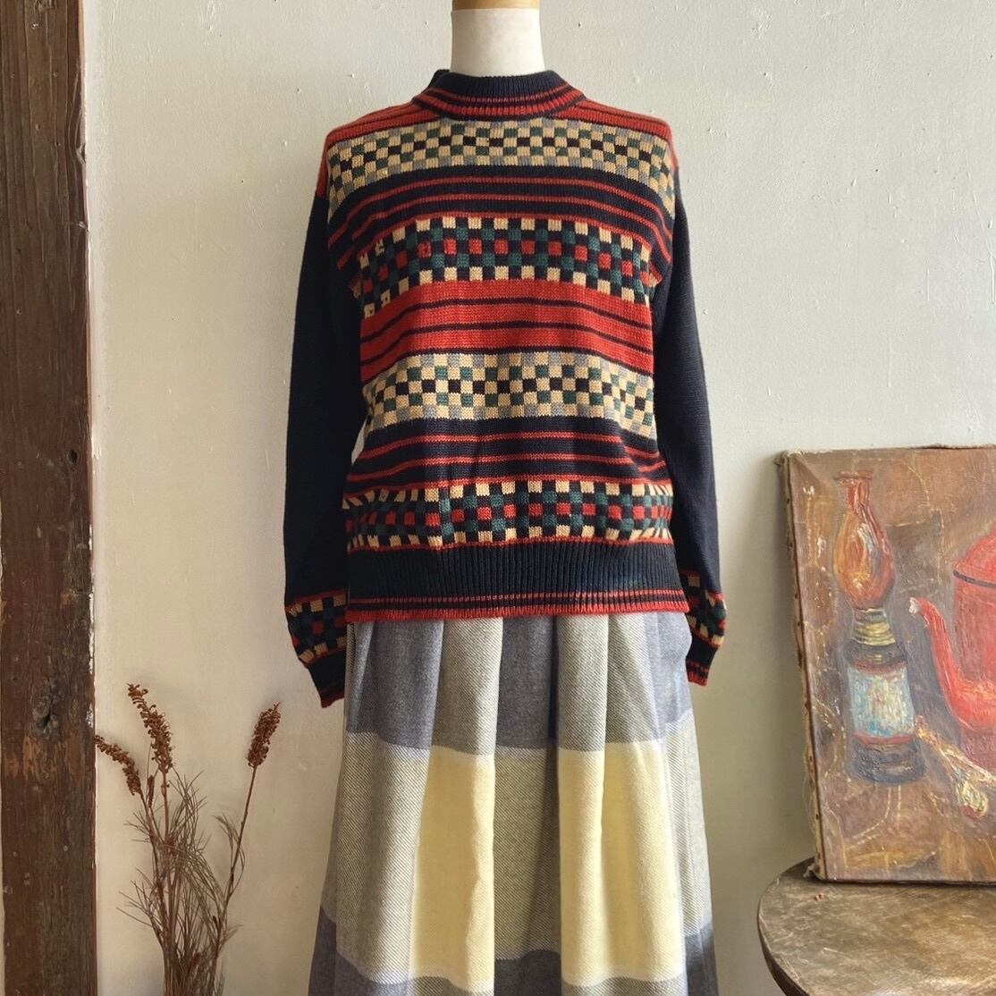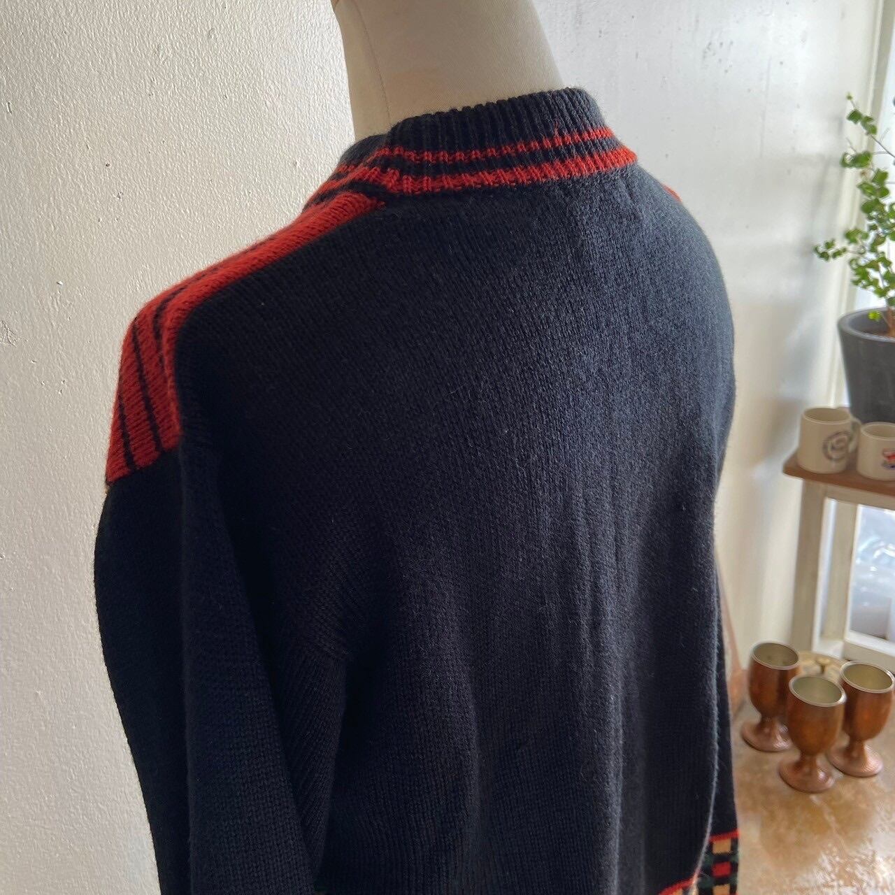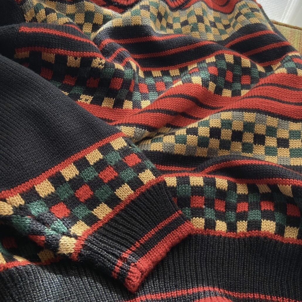 小さなブロックチェックに赤黒のボーダーがレトロなニット。