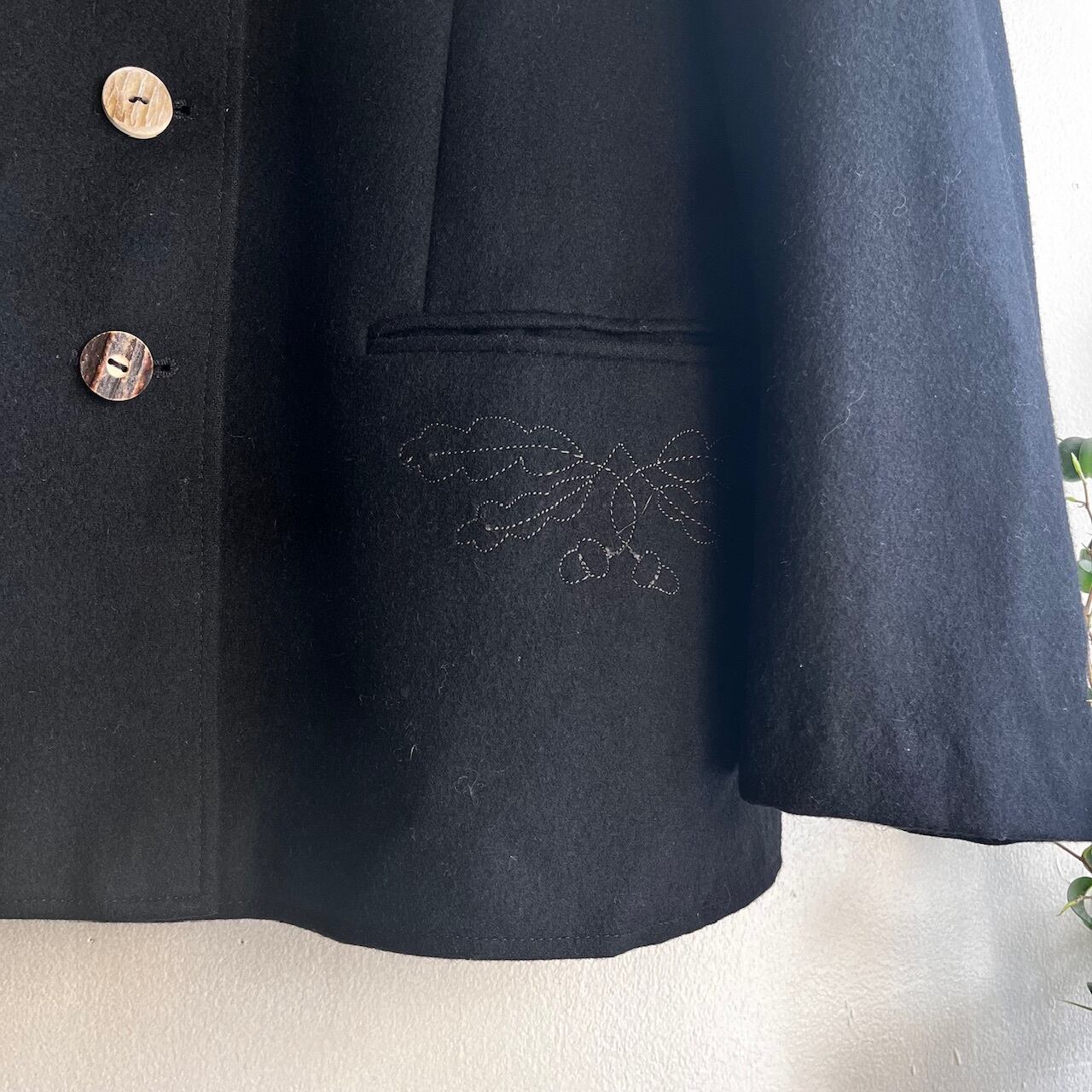 上質なウールやさりげない上品な刺繍、すべて異なる1点もののボタンが存在感あります。