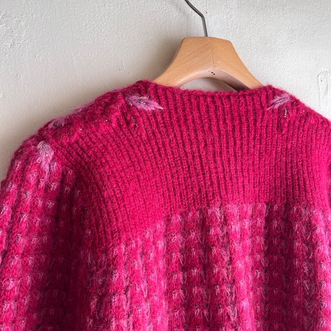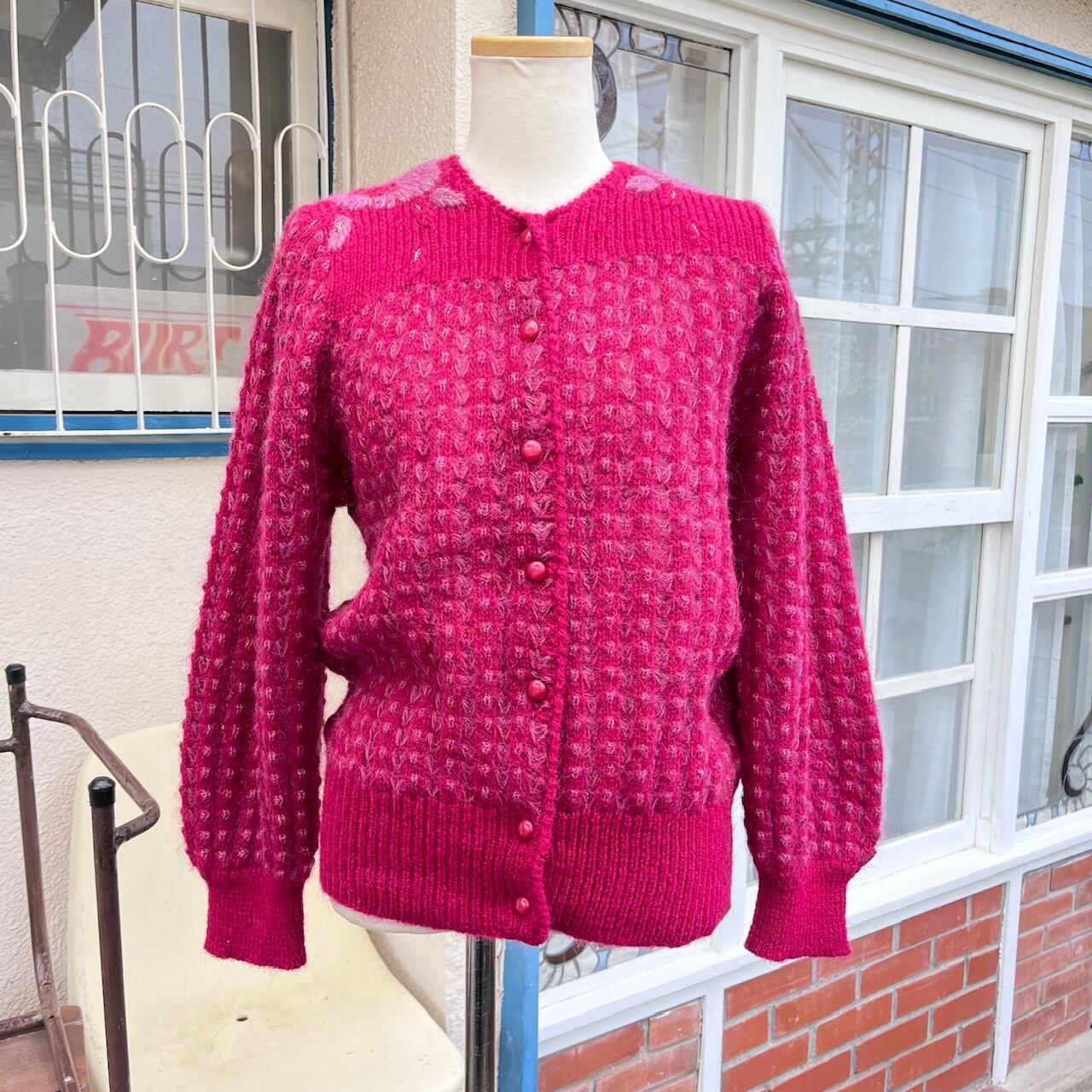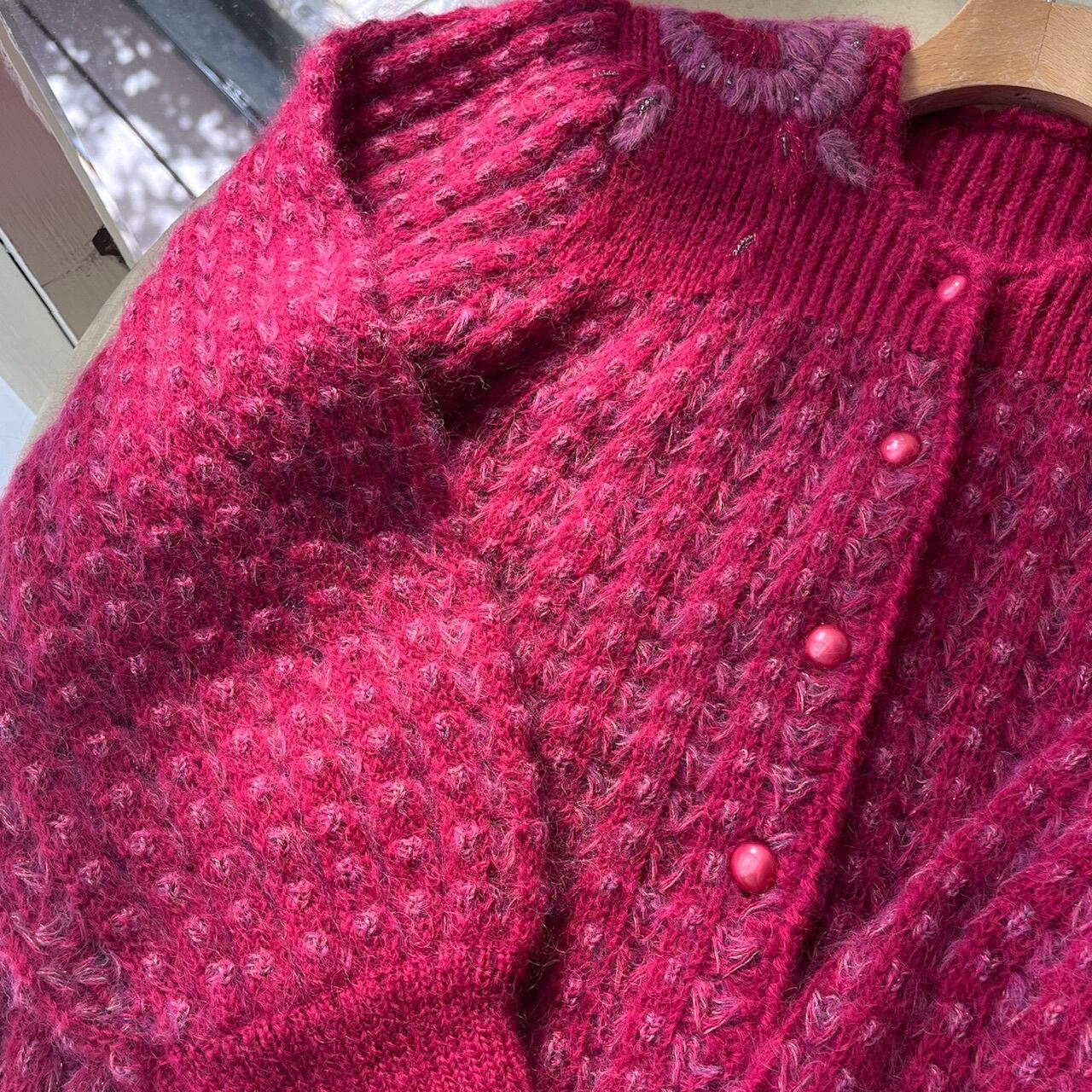 愛らしい濃いめのピンクにラメ入りがとってもかわいいデザインニットカーディガン。