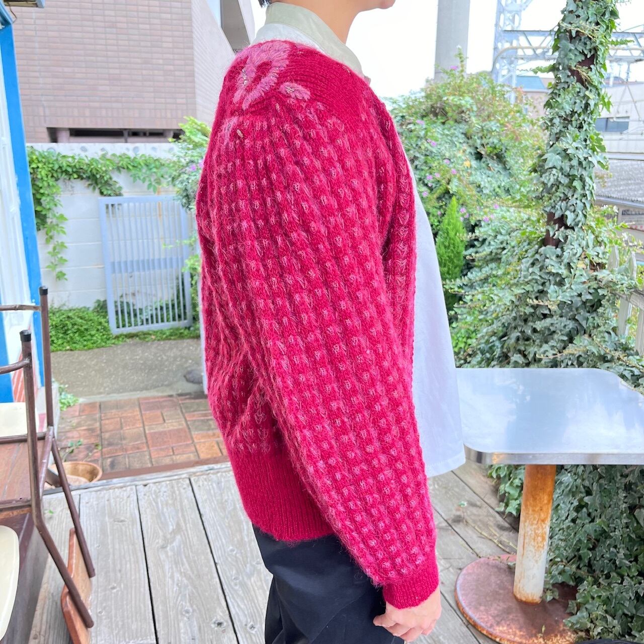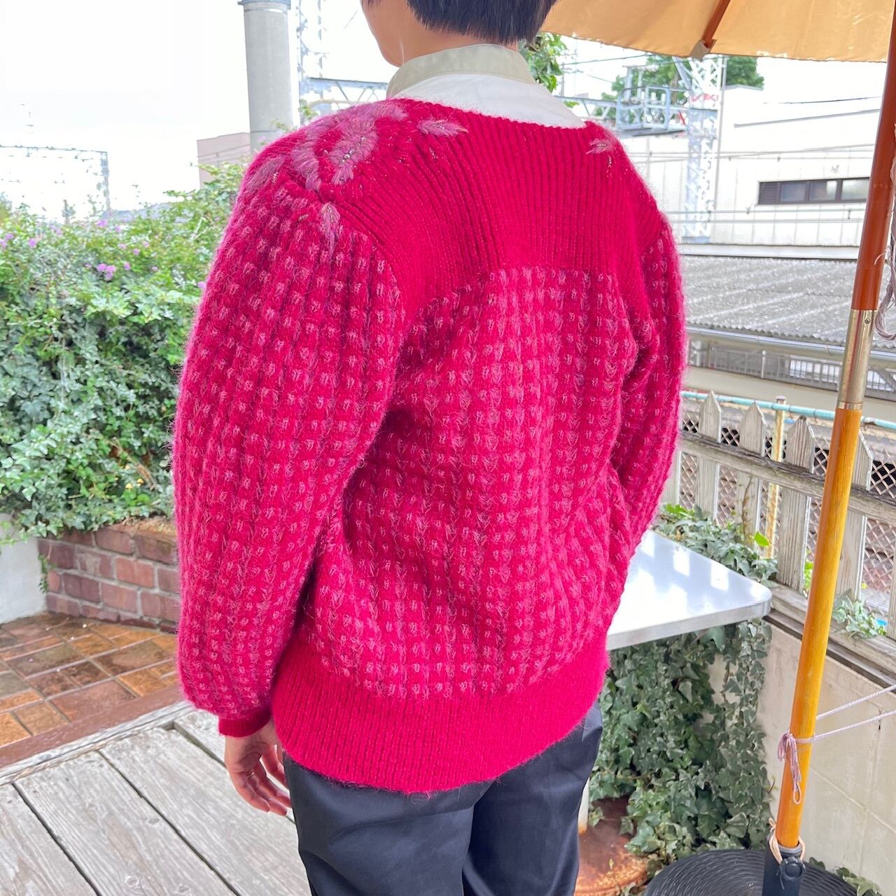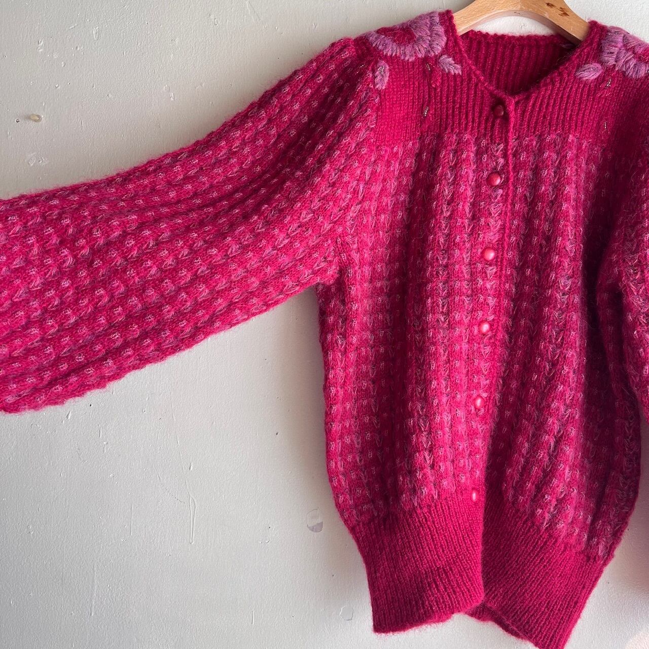 愛らしい濃いめのピンクにラメ入りがとってもかわいいデザインニットカーディガン。