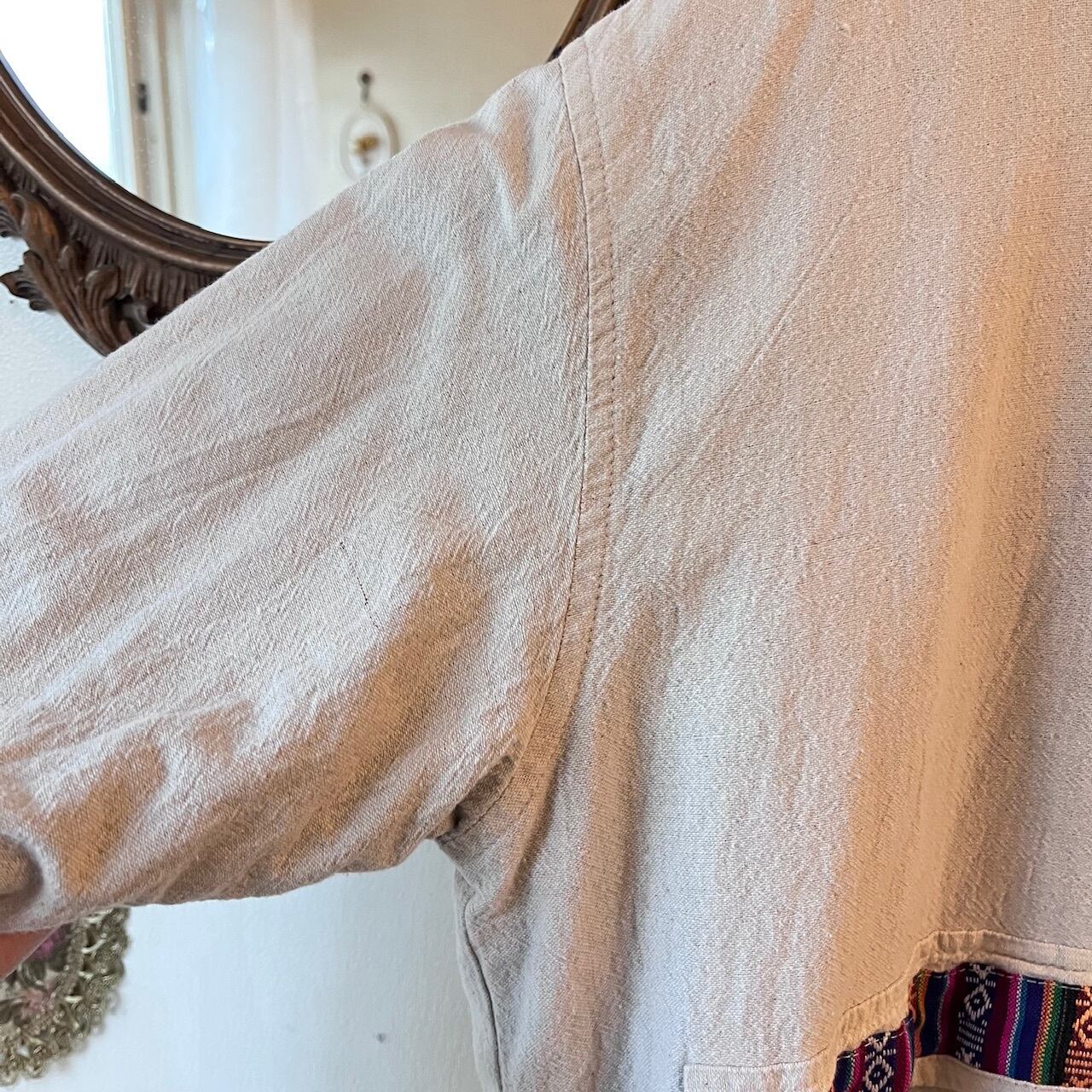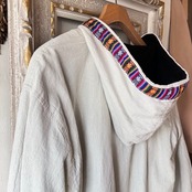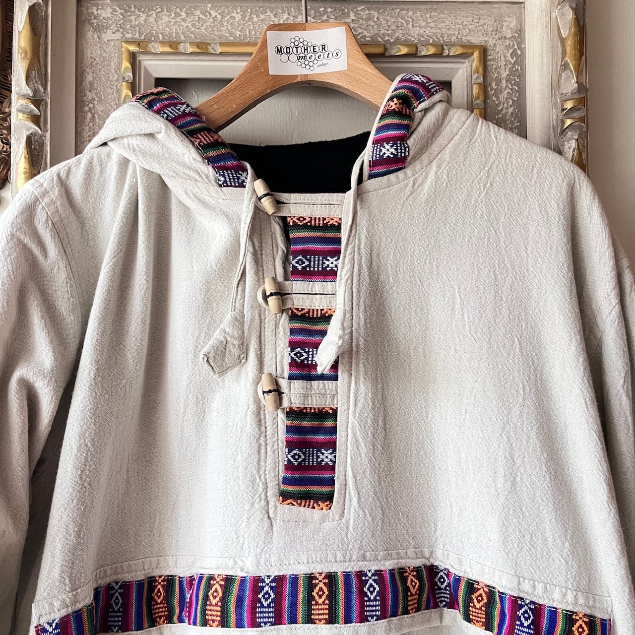 天然素材の風合いにエスニック柄のテープがあちこちに入った、かわいいデザインのフード付きトップス。